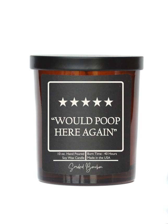 5 Star Would Poop Here Again - Bathroom Candle - Simply Select the scent you would like for the case. Our candles are made with USA soy wax, scented with premium fragrance oils and cotton wicks. Size: 10 oz. Burn Time: 40+ Hours Wax: Soy Wax Container: Glass Jar With Tin Lid CANDLE CARE INSTRUCTIONS: • Trim Your Wick to 1/4" Before Candle is Lit Every Time • Burn Candle so Wax Pool Reaches the Jar Edge Each Time to Prevent Wax Tunneling • Burn Candle No More Than 4 Hours at a Time and Do Not Burn Candle with Less Than a 1/2" of Wax Remaining • Keep Candle Away from Fans, Open Windows, Hot Surfaces, Children, Pets • Never Leave a Burning Candle Unattended Keywords - Candles, Soy Wax, Candle, Spring Scent, Summer Scent, Home Décor, Cotton Wick