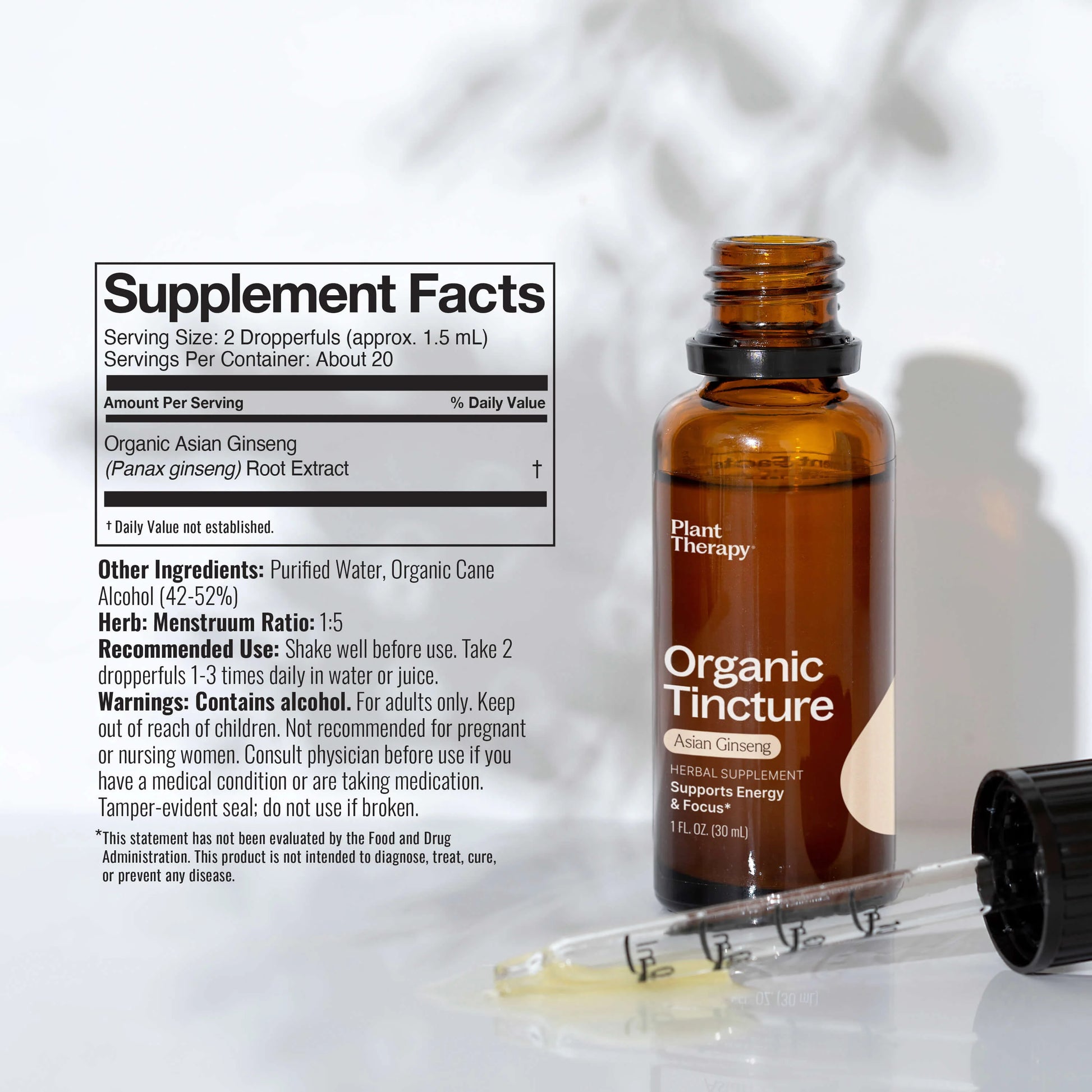 Derived from the roots of organically grown Asian Ginseng (Panax ginseng) plants, this tincture captures the full spectrum of benefits this amazing plant has to offer. By using a potent organic alcohol extraction, our tincture offers the broadest range of water-soluble and fat-soluble phytochemicals found within the Asian Ginseng root while requiring much less plant material than other solvents, such as glycerin. It also acts as a superior preservative, maintaining the potency and integrity of the extract over several years.