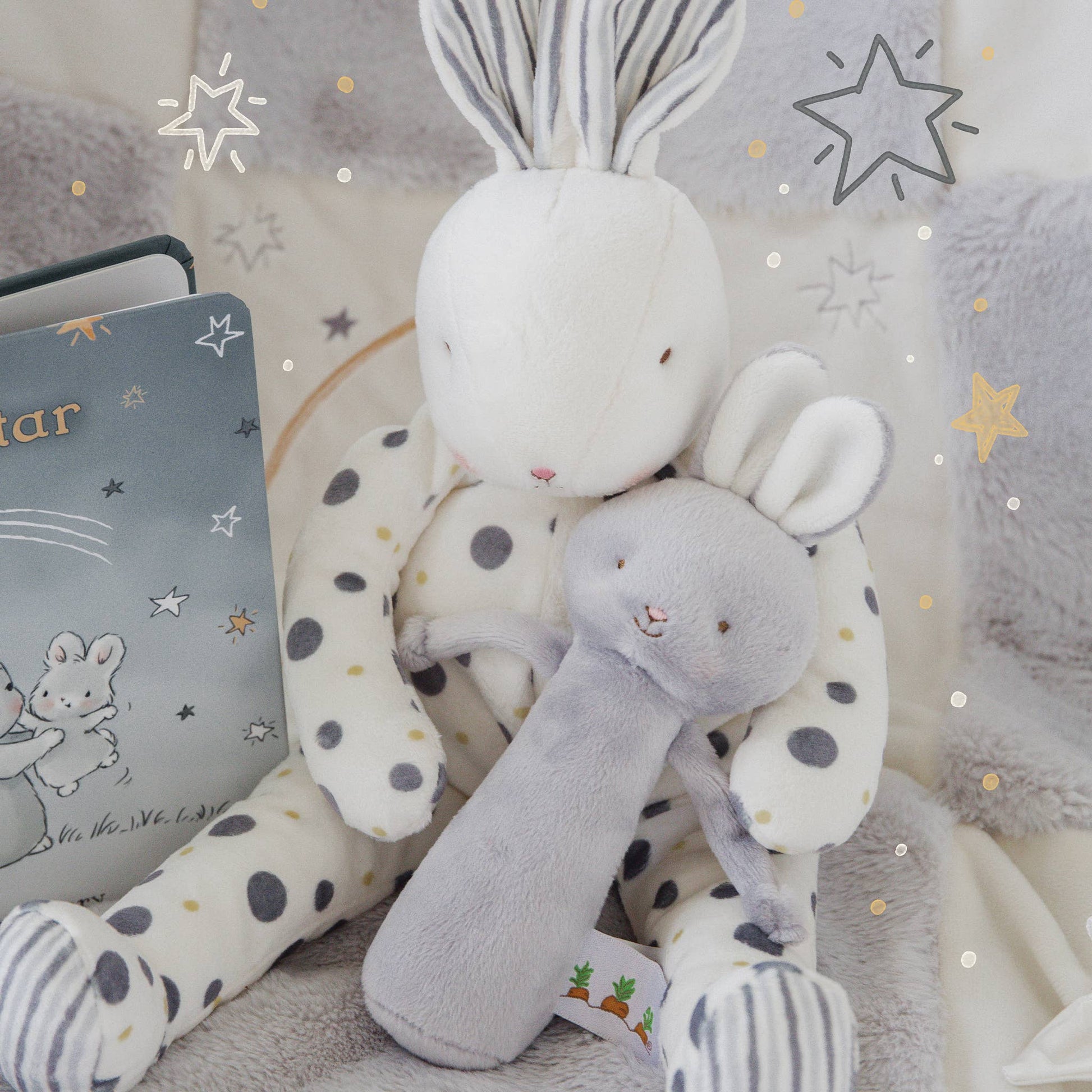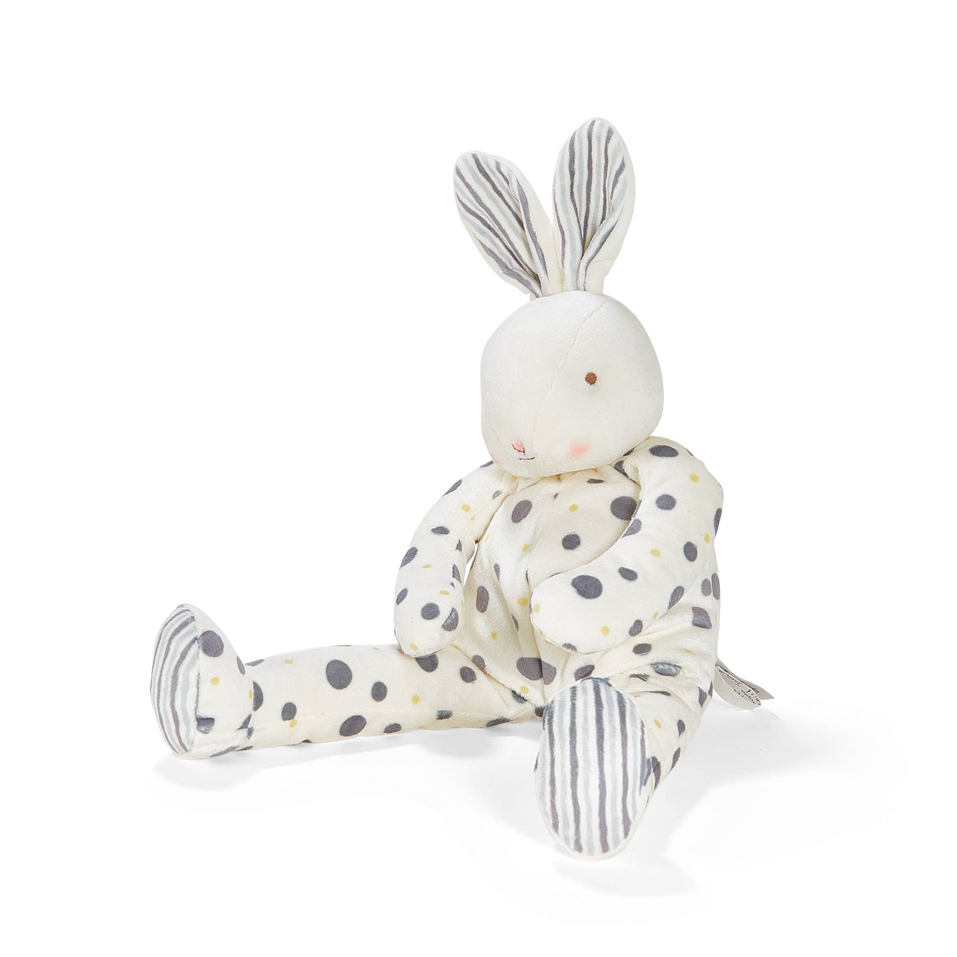 Big Bloom Buddy, the ultimate squishy bunny for little ones to hug and hold! Made with a super-soft velour body and decorated with playful gray & yellow polka dots and striped accents in the ears and feet, Big Bloom is as huggable as can be. With its floppy, luggable design, this big bunny buddy is perfect for snuggles and adventures alike, bringing endless comfort and joy to every cuddle session.