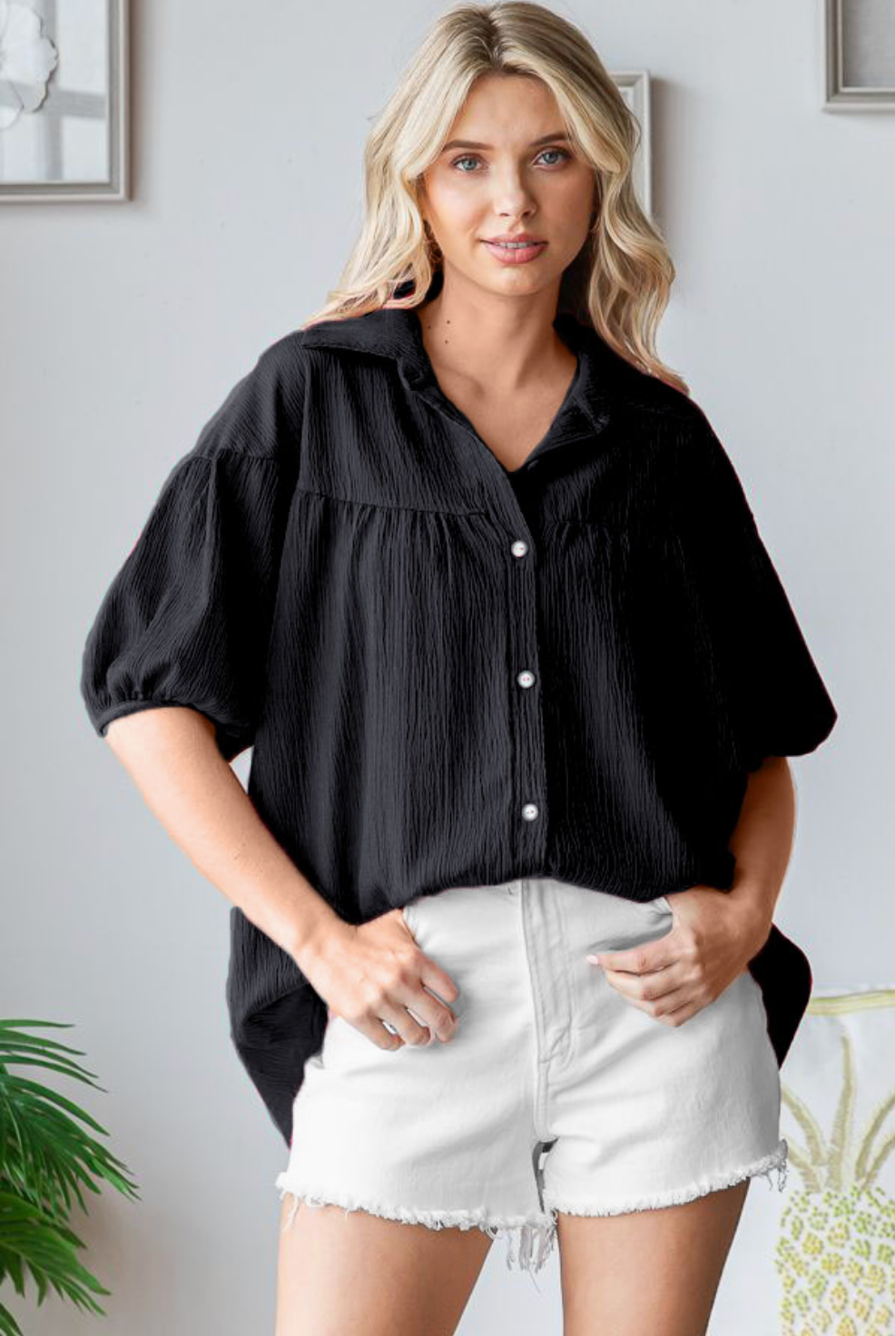 Add some playful charm to your wardrobe with this solid top featuring a button down detail, shirring on the front, collar, and short sleeves. Made in the USA with a blend of polyester and spandex for comfort and durability. Perfect for any occasion, this top will elevate your style effortlessly. (Model is wearing a size small)