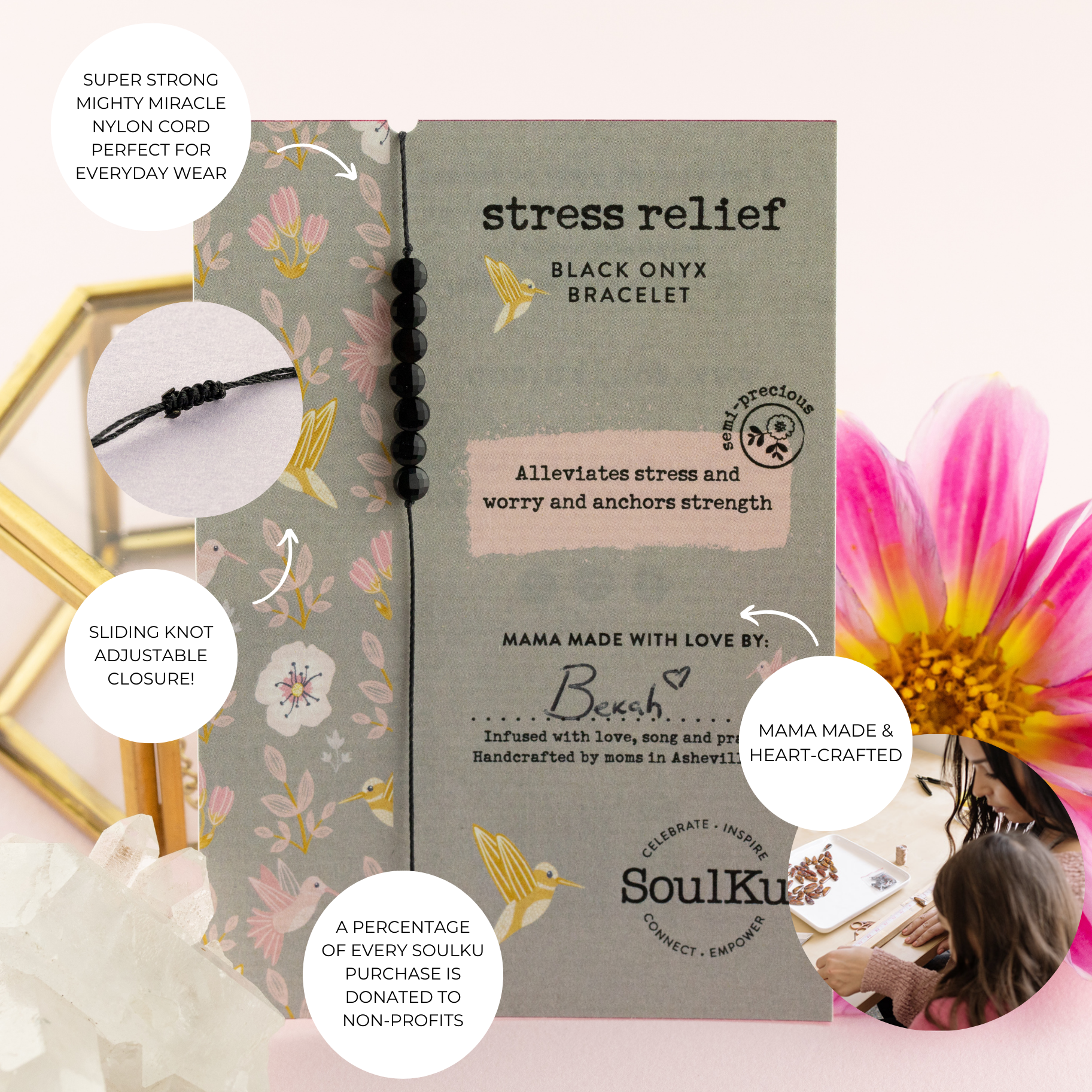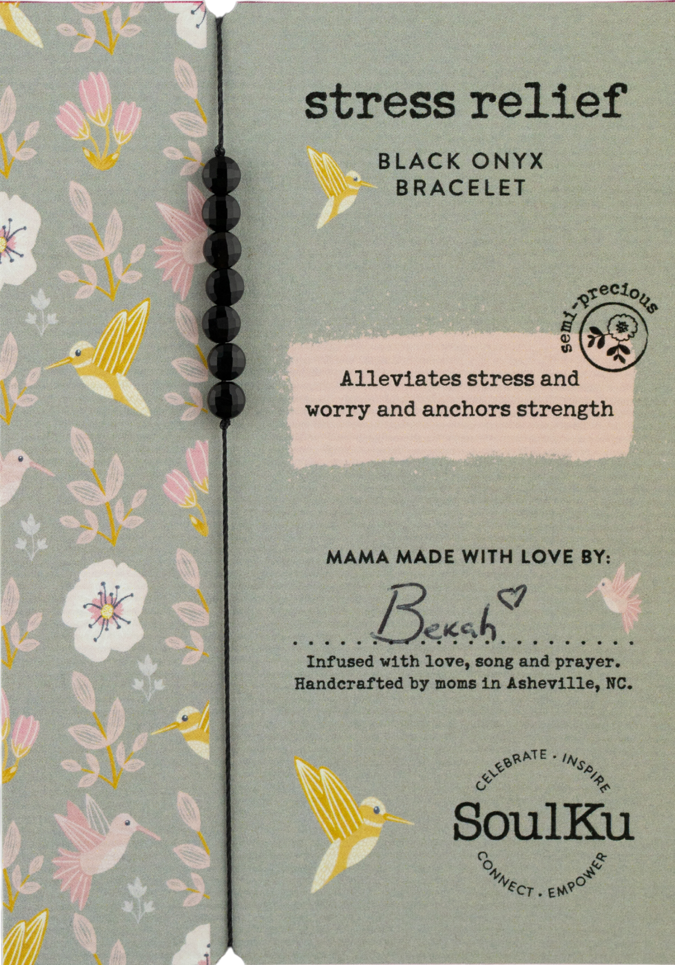 Adjustable Sizing Seven Approximately four-millimeter semi-precious gemstones strung on black cord with slip knot slider FSC Certified Card SoulKu is women-owned and offers genuine gemstone jewelry handmade in the USA by our team of Mama-Makers.