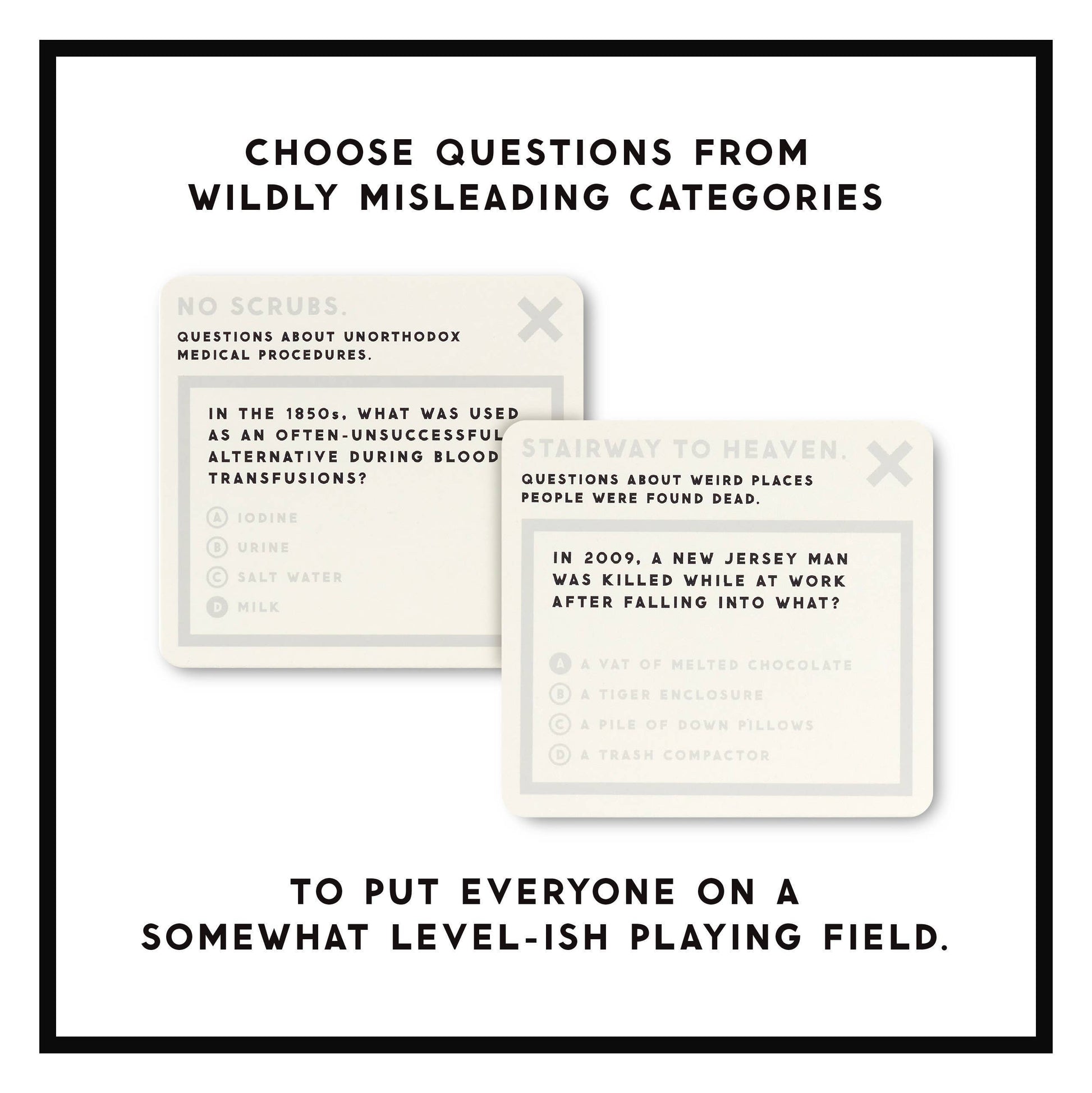 • Each question is grouped in an entertainingly-misleading category to keep everyone guessing–literally.