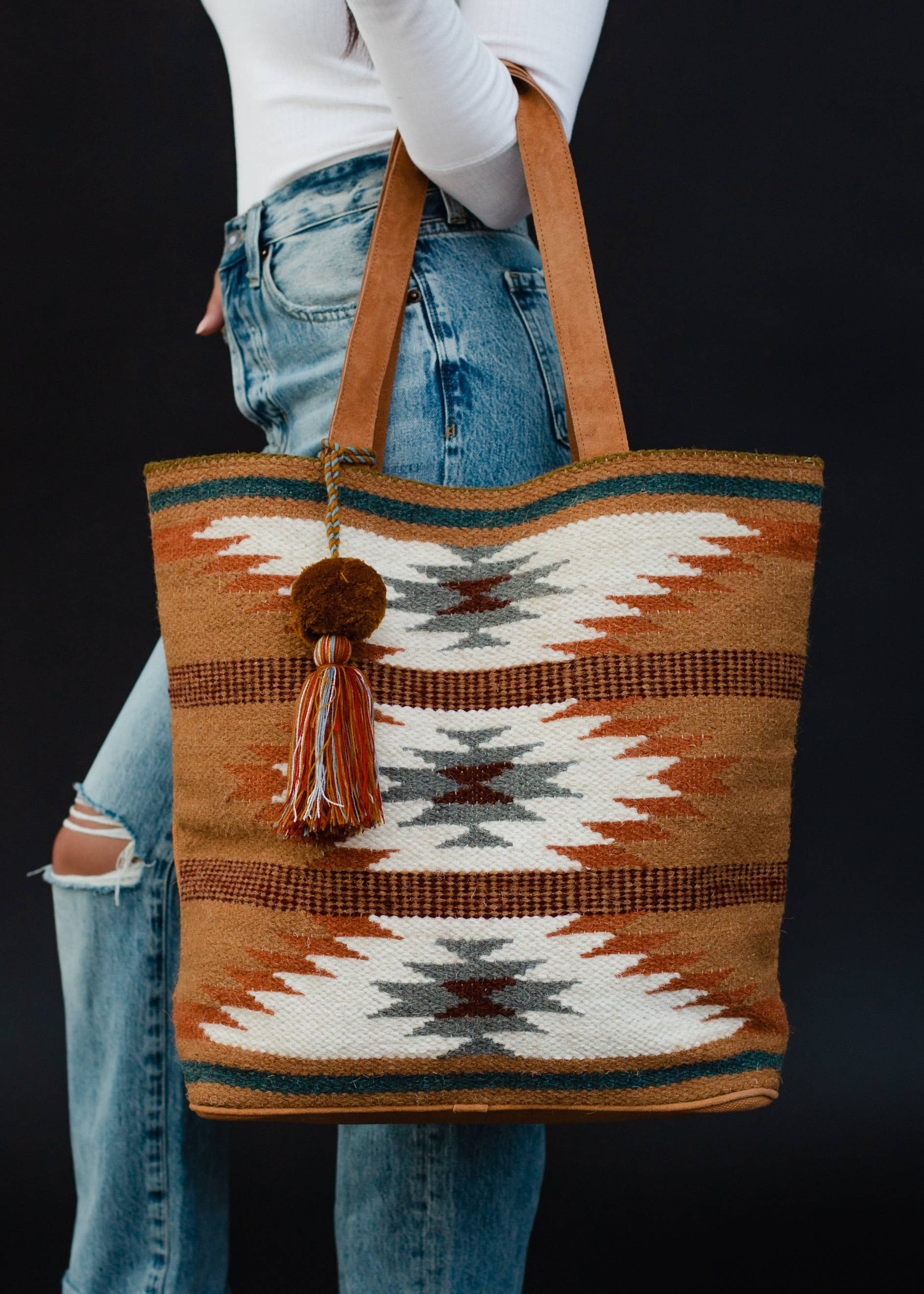 Brown, rust & teal Aztec tote Multicolored pom tassel detail Leather straps 16" x 6" x 17" 100% Cotton