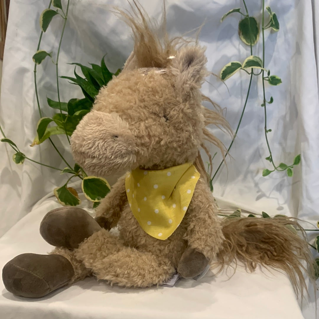 Pony Boy is ready to ride with some lucky little buckaroo. Tumbly wispy buckskin brown fur body with a cream muzzle and cocoa brown fur mane and tail. Bandana scarf about his neck in colorful curry with cream dots. Saddle up for some fun. Features: 16” (41cm) tall 11" (28cm) sitting height 100% polyester. This stuffed animal is surface clean only.