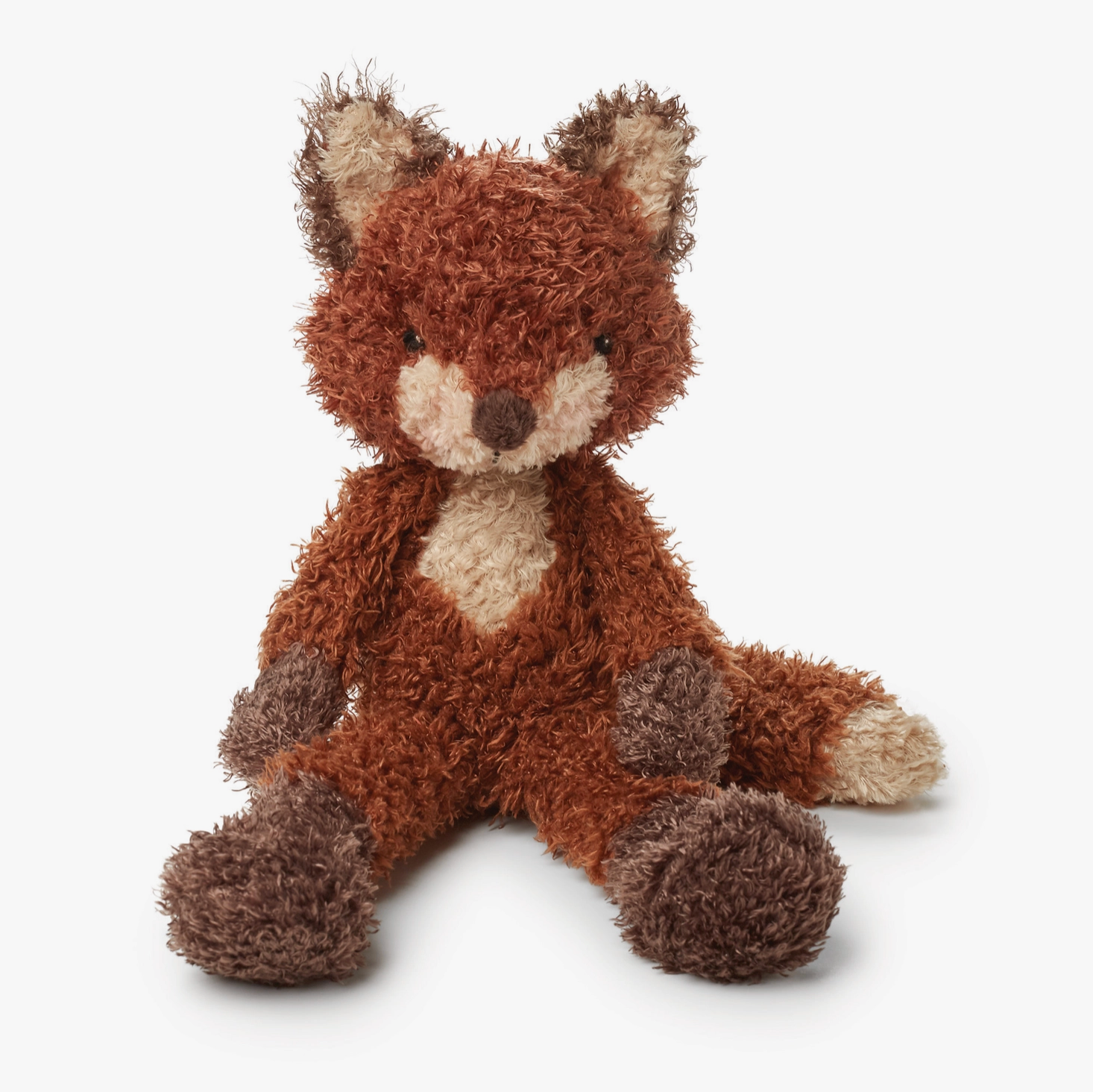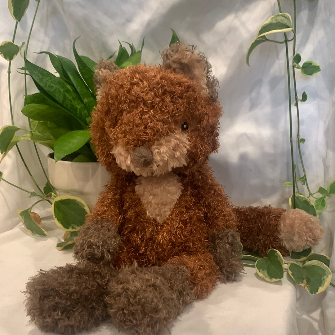14" handsome Camp Cricket fox Safe for all ages embroidered details auburn/cream/chocolate fur and soft velour surface wash only 100% Polyester. Imported. Camp Cricket Friends include- 100308: Cubby the Bear, 100309: Foxy the Fox, 100310: Roxy the Raccoon, 100311: Bruce the Moose 100312 pair with Camp Cricket Book Foxy is handsome indeed, from his furry muzzle to his fluffy tipped tail in rich auburn red, burnt cream, and chocolate brown fur. Embroidered features and velour nose. Foxy is certainly the most dashing Fox that you ever did meet and a favorite of all the woodland friends at Camp Cricket.