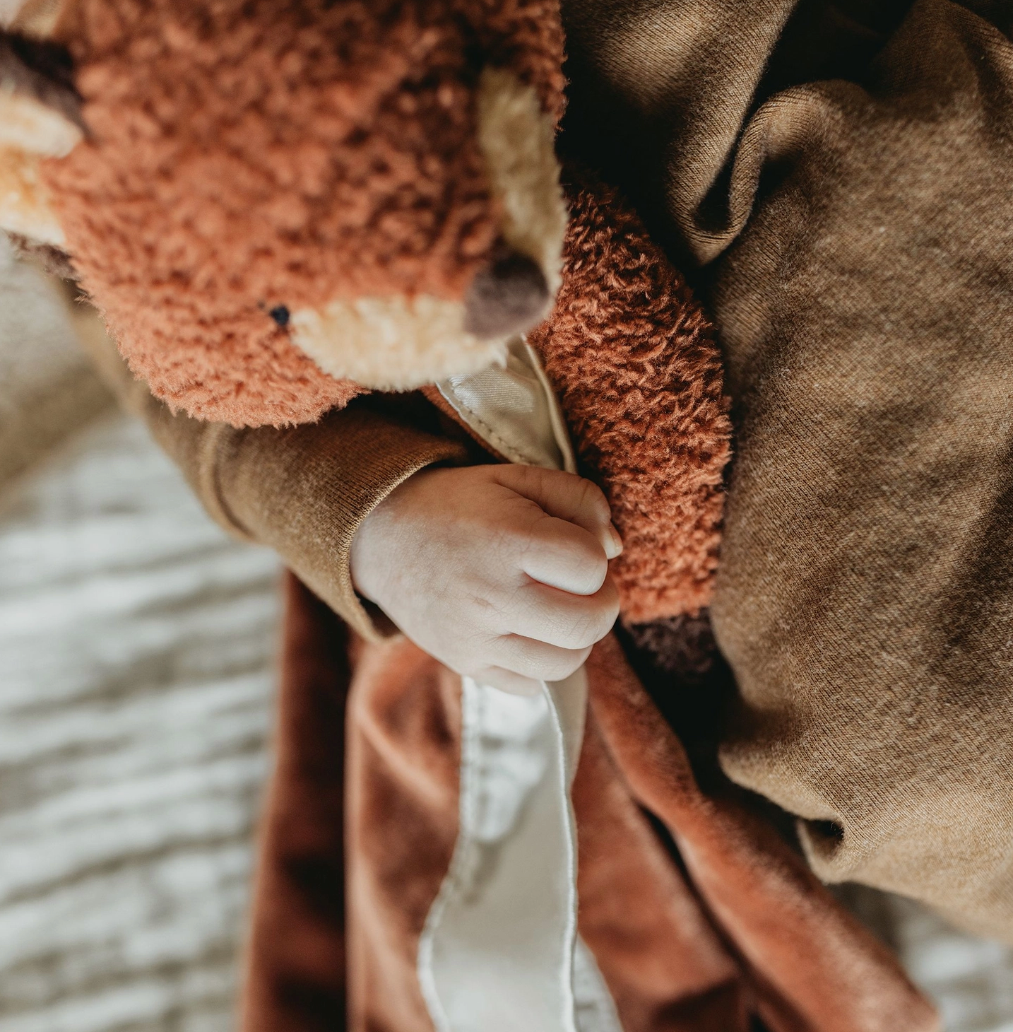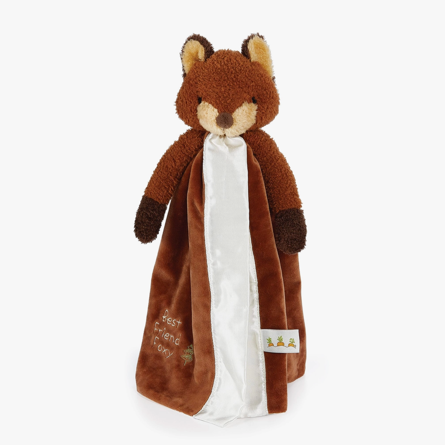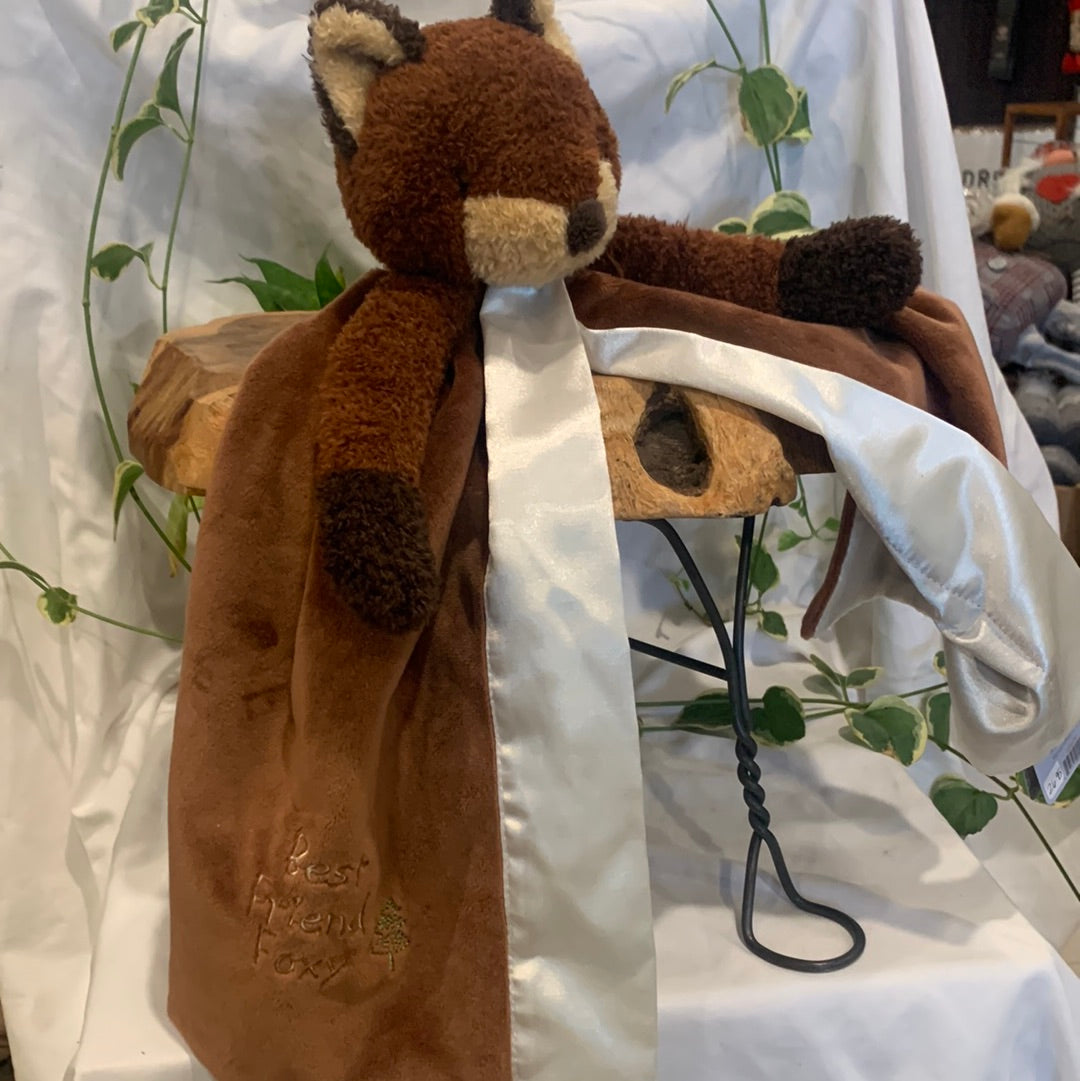 Features 16" length easy to snuggle, has satin lining Embroidered details Baby safe 100% polyester Machine wash and dry low heat Smart and smart looking Foxy is a great friend for hugs and snuggles. This woodland friend is a rich auburn red velour split blanket with cream satin trim and lining that matches his furry head, iconic pointy ears and sly smile. And babies just LOVE our buddy blankets, your best bet is to buy these loveys by the bunch! Embroidered message reads, "Best Friend Foxy" with a tree. Signature three carrot tag for little ones fingers. Our security blankets are a must have comfort for baby.