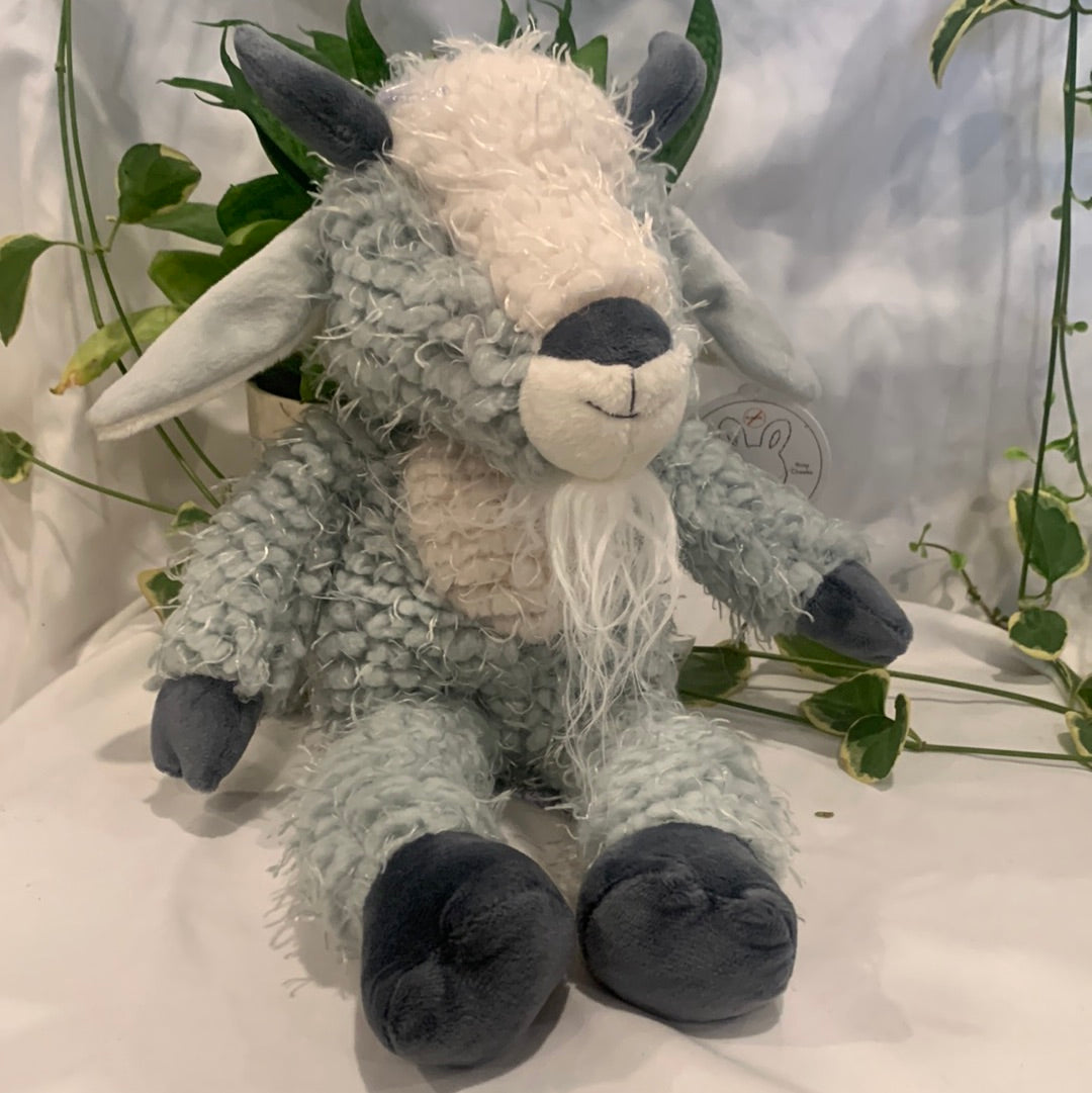 Features 14" extended, 9" sitting Embroidered features Safe for all ages 100% polyester Surface wash/Spot clean Pairs with Farm Friends- 100087: Moo Moo the Cow, 190208: Pepper the Farm Dog, 861101: Hammie, 861104: Clucky the Chicken, 104302: Billy Goat, 104303: Randy the Rooster, 106070: Pony Boy Horse, 106071: Shep the Sheep, 106072: Alley Cat 100972 pairs with Who Says Peep Peep board book Does a goat say "Baa" or "Maa"? Either way, this Billy Goat stuffed animal will you have you saying "Yay!" Billy Goat plush is 13" of scraggly blue and cream fur cuddliness. Super soft and friendly for the little ones with hand-embroidered features, and also chic enough for home decor. You'll love Billy Goats goatee on this chin, made of cream fur, just made for pondering the meaning of life on the farm...Good Friends Farm that is. And this Billy goat is anything but gruff, he is the sweetest thing to come around since the sweet cream butter churned right there at the barn.