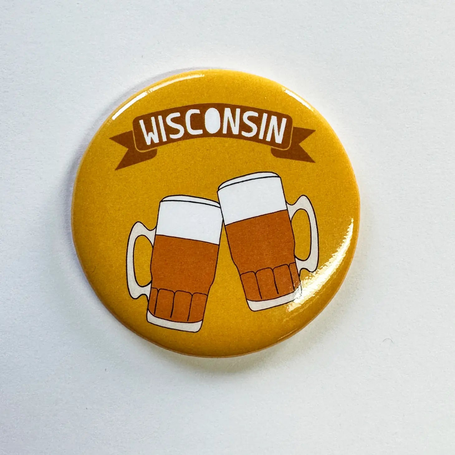 An an ode to the beer and breweries of Wisconsin. It features an illustrated version of two glass mugs cheers against an amber colored background. A banner atop the glasses reads Wisconsin in brown. This magnet measures 2.25 round and is sealed in with a plastic sheath.