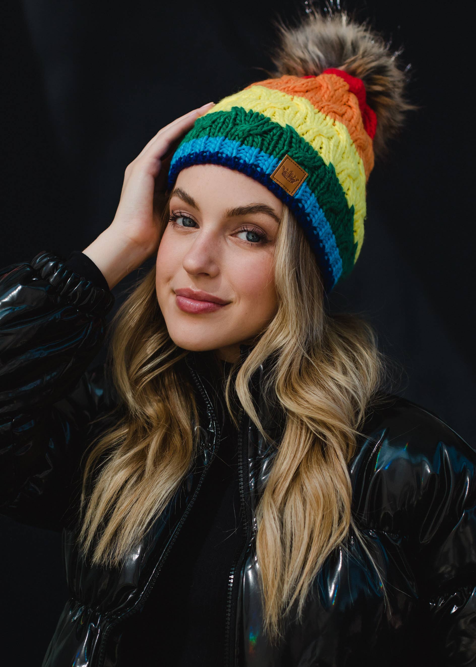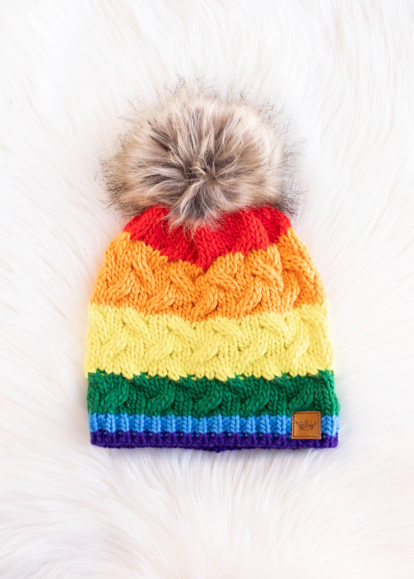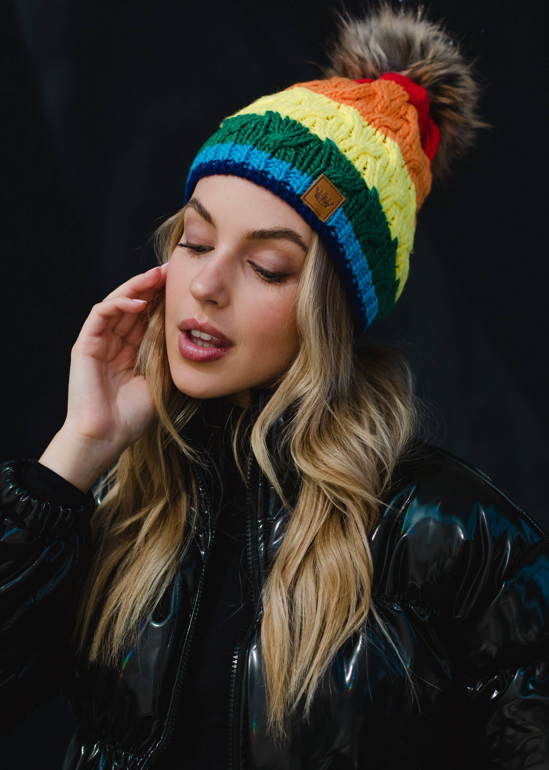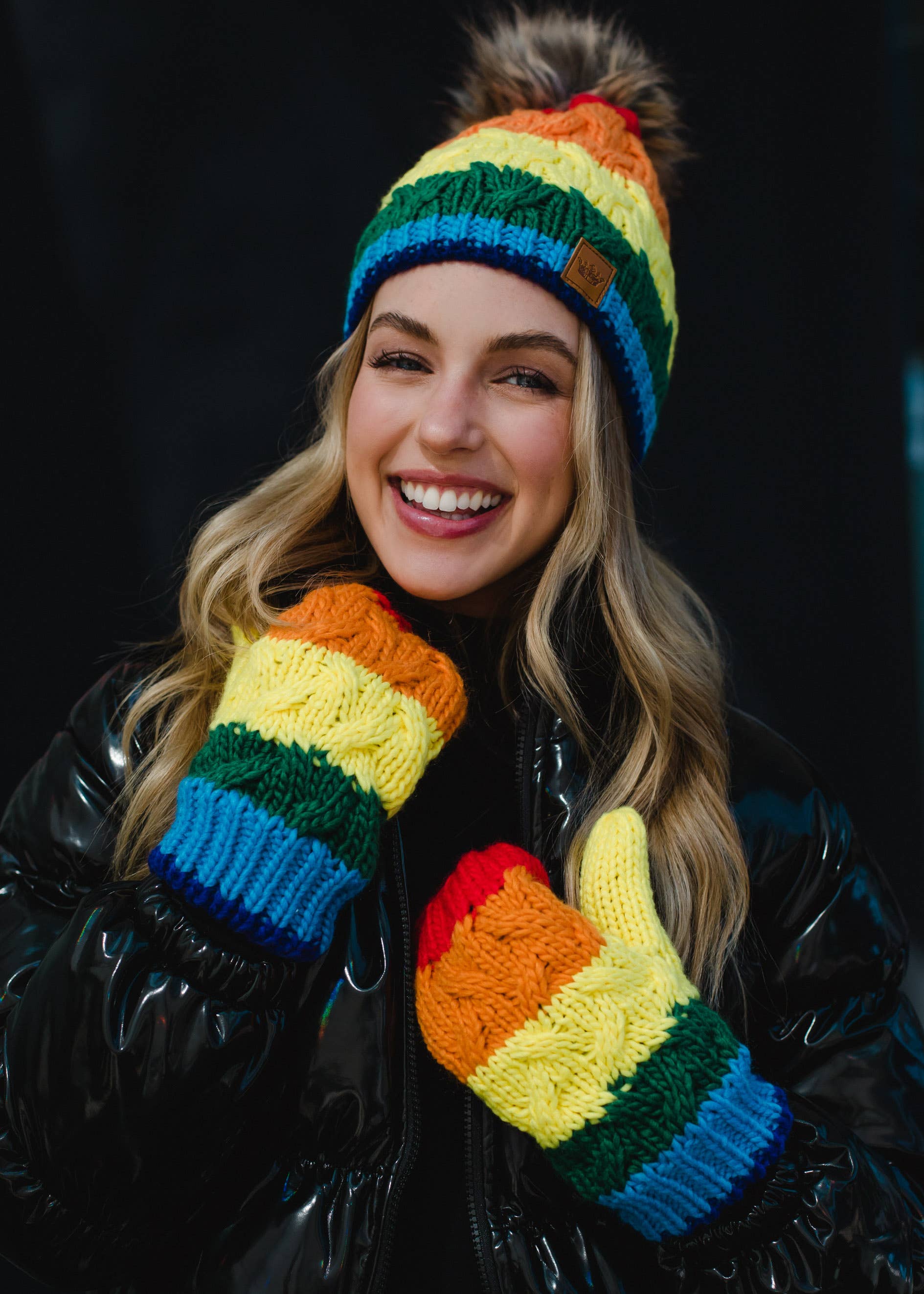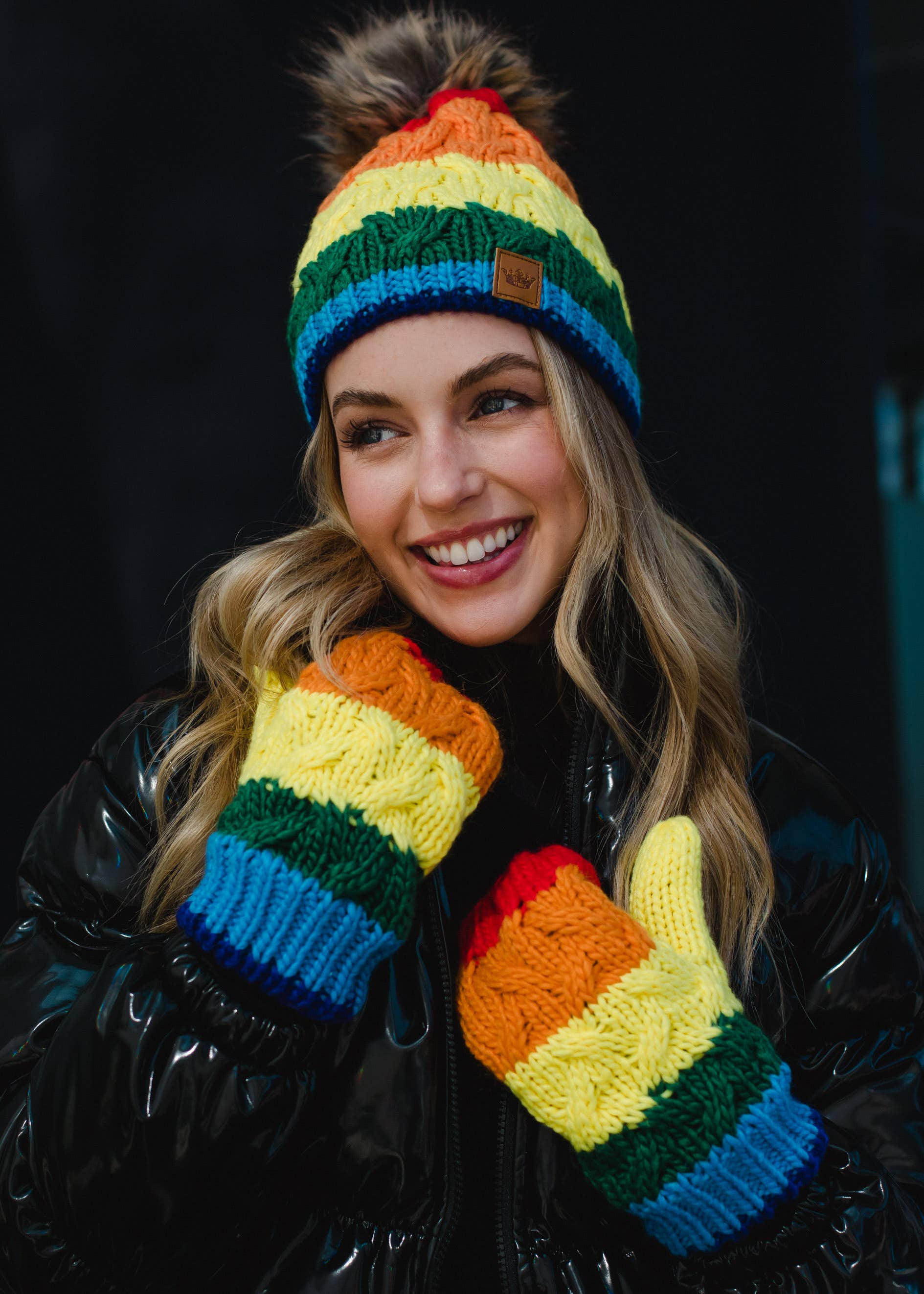 Classic rainbow stripe cable knit hat Fleece lined Pairs w/ matching mittens M-157 & M-119 Faux fur pom accent 100% Acrylic
