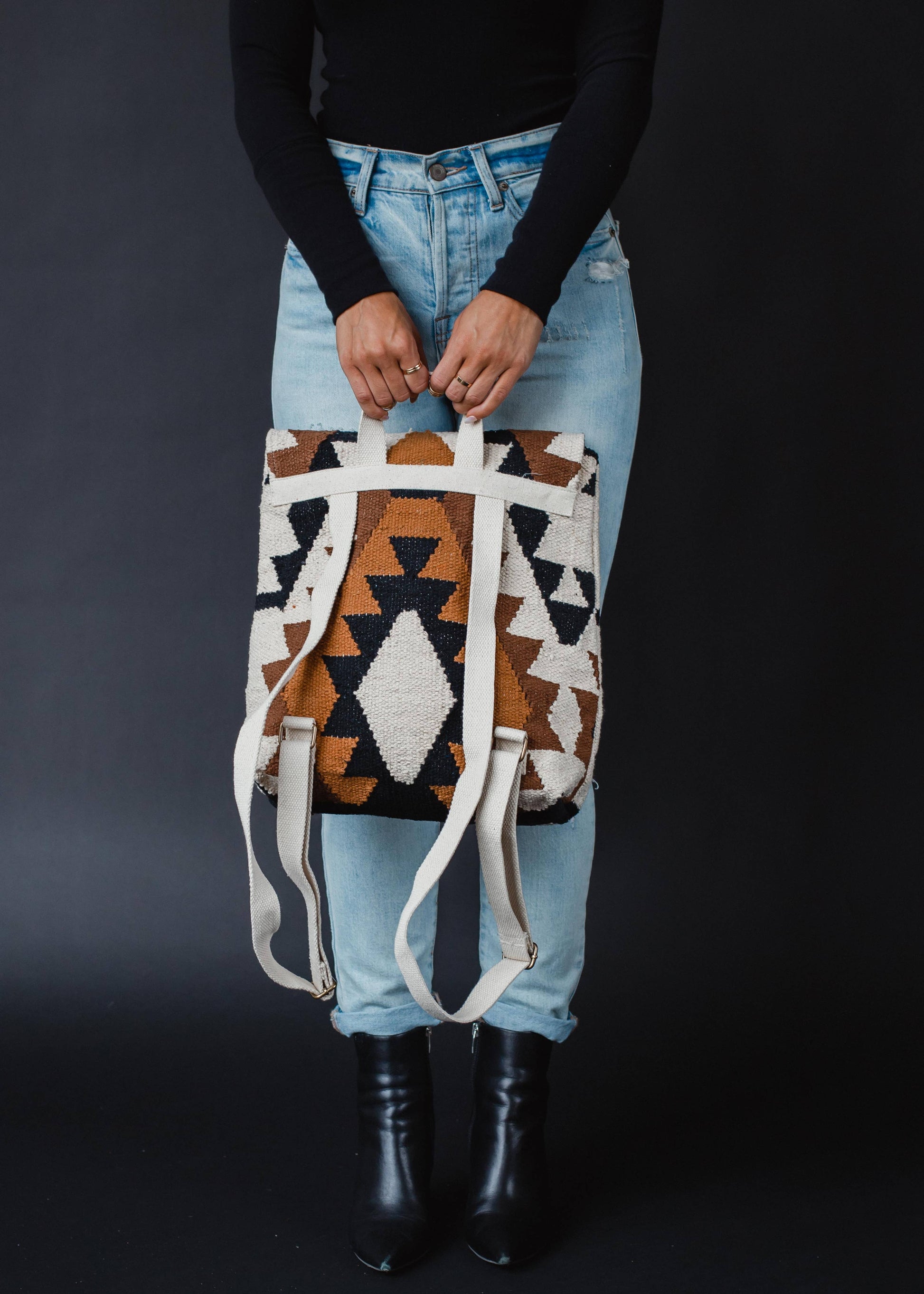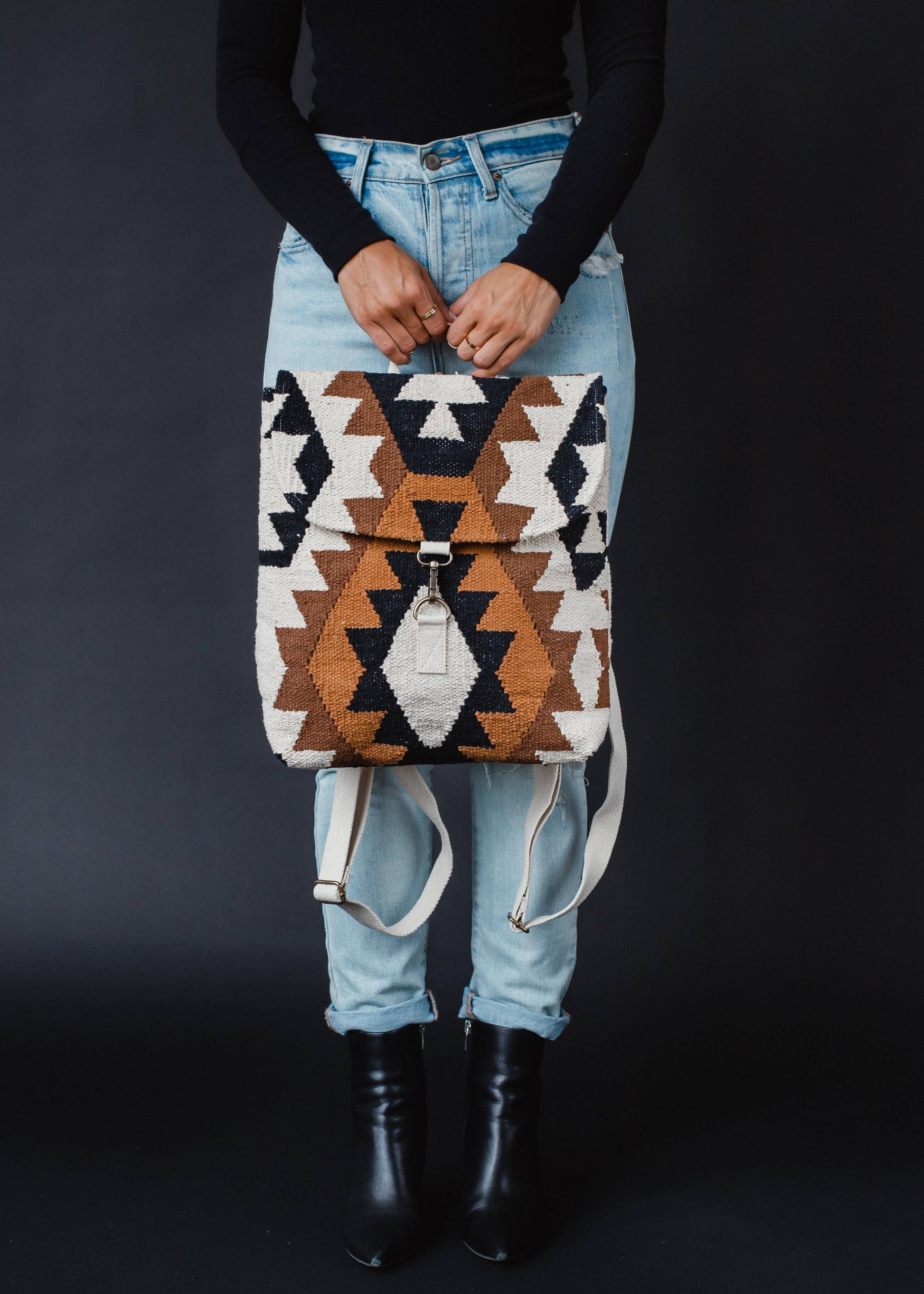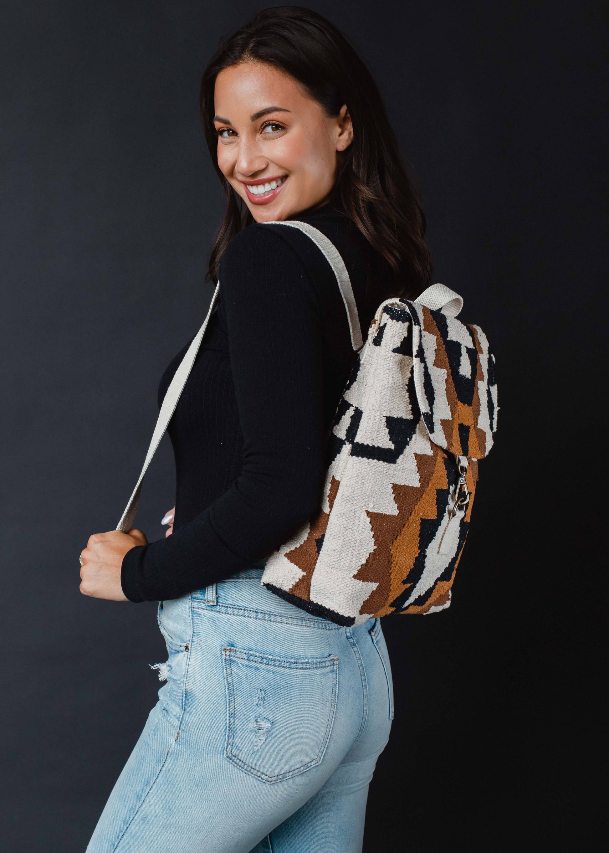 Cream, black, brown & tan Aztec backpack Clasp closure on front Adjustable straps & handle 14" x 11.5" x 4.5" 100% Cotton