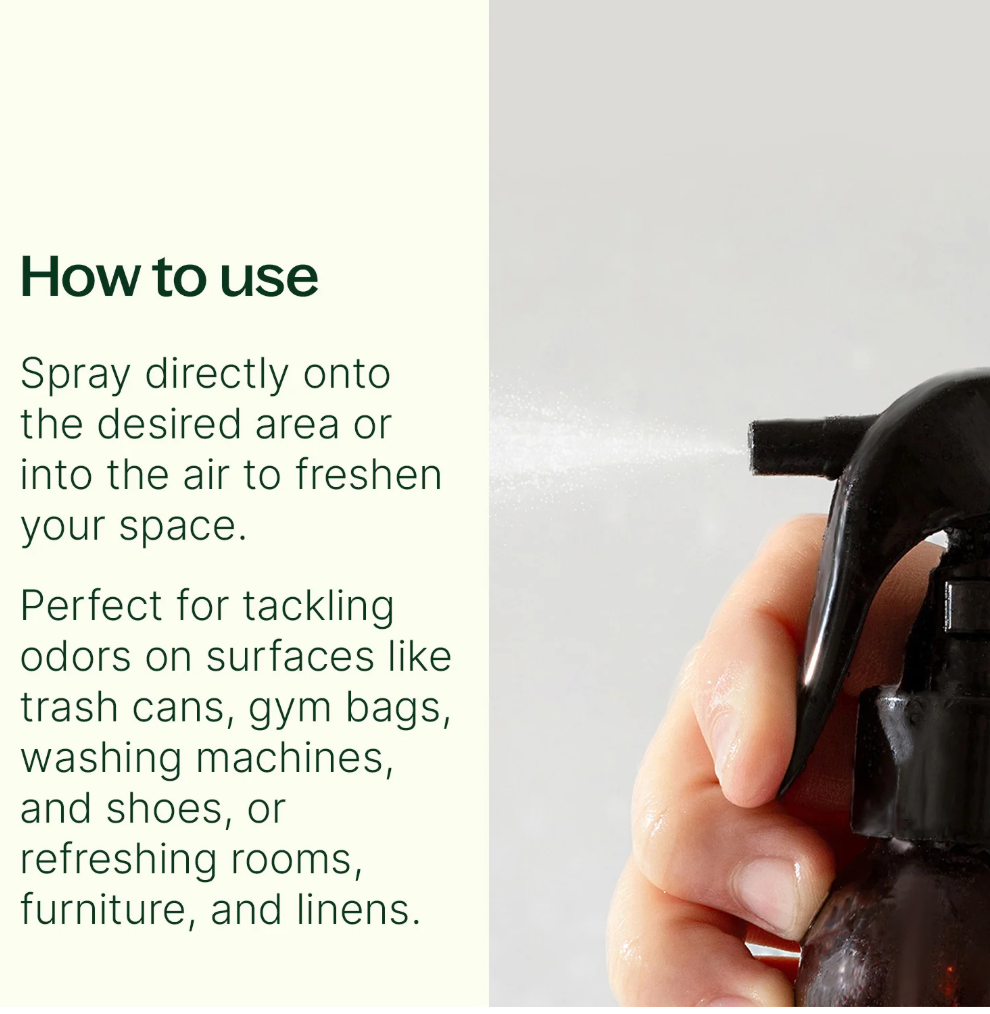 Formulated with a powerful blend of pure essential oils, this spray is your go-to for quick and easy odor control. It neutralizes smells at their source, leaving behind a light, fresh aroma that’s perfect for refreshing everyday spaces and surfaces. Whether you’re spritzing shoes, closets, furniture, or even your washing machine, this versatile spray makes staying fresh effortless.