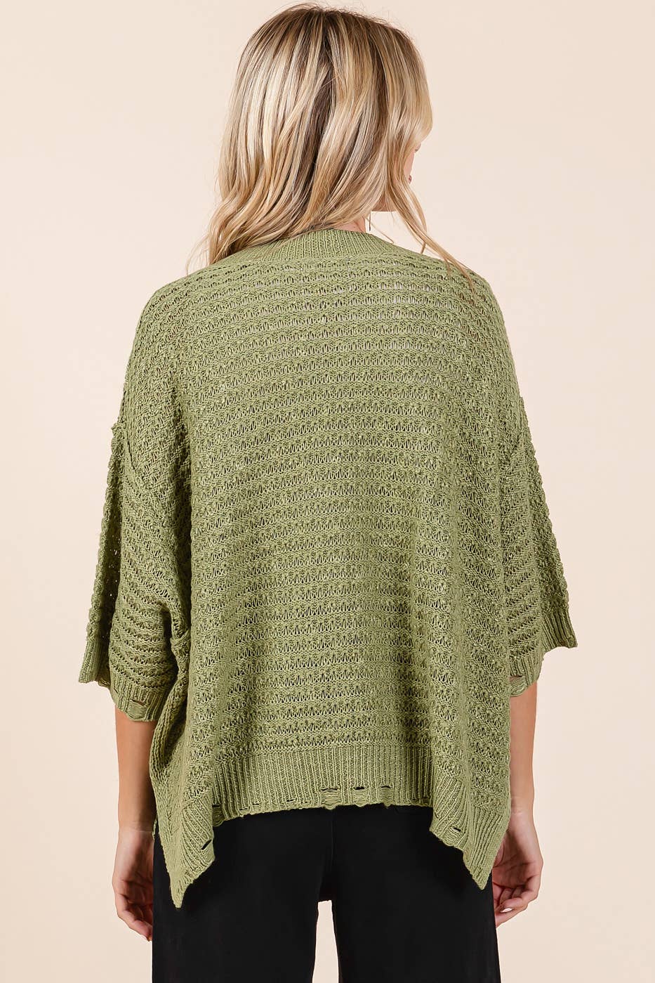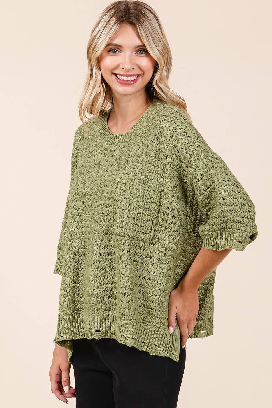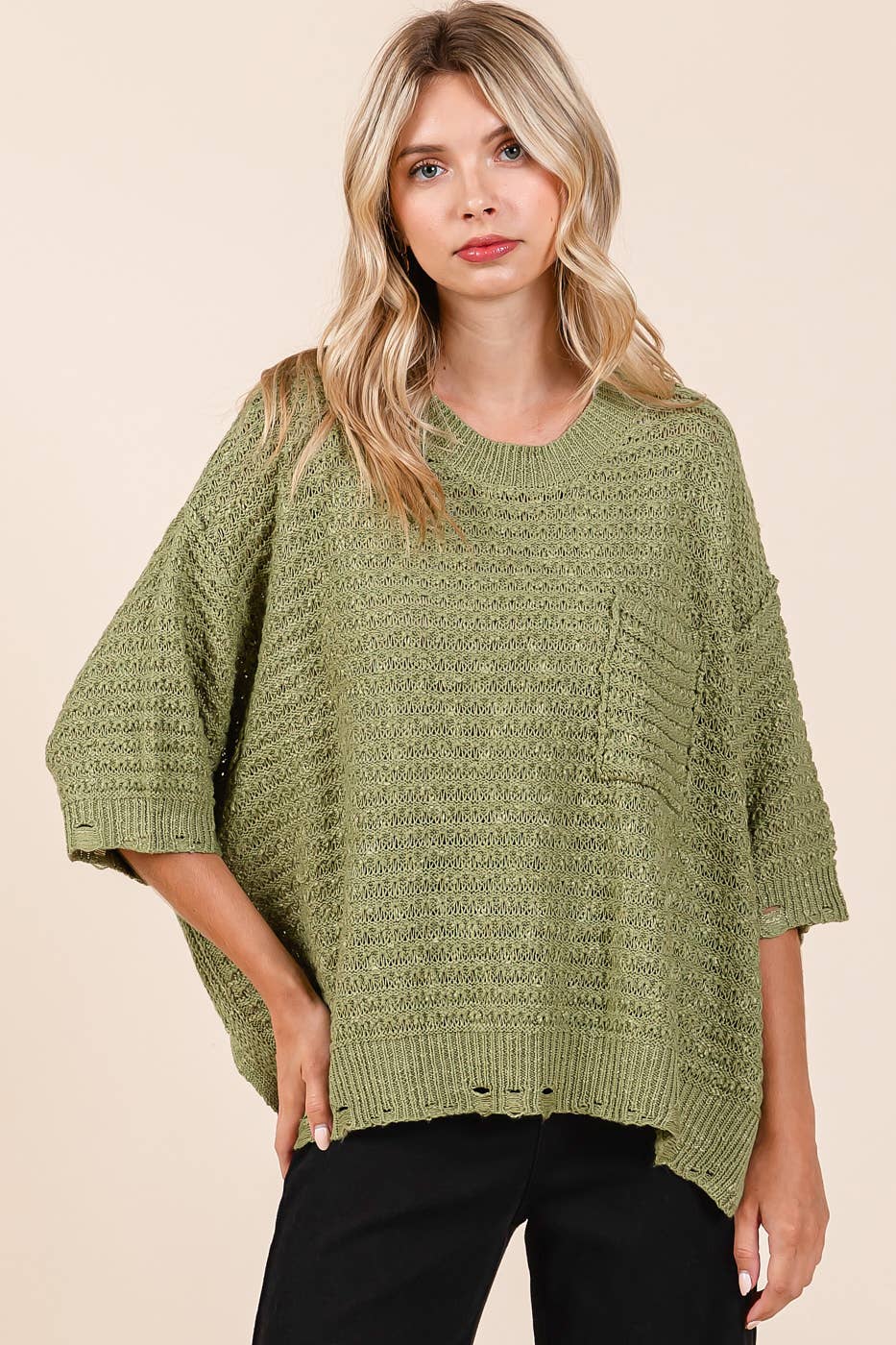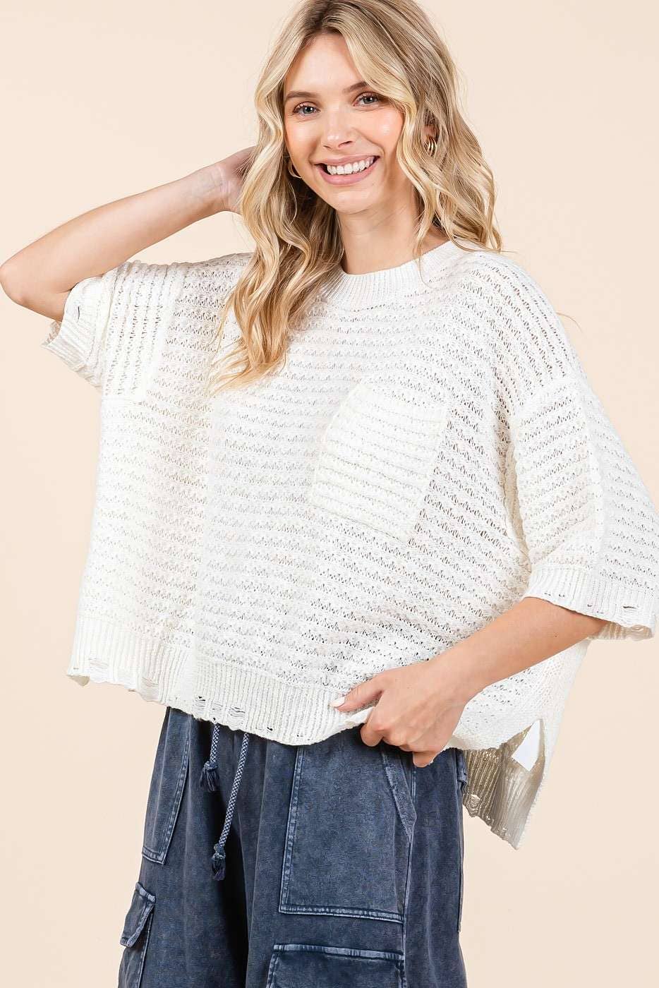 - LIGHTWEIGHT SWEATER KNIT FABRIC - ROUND NECK - RIBBED NECKLINE, SLEEVE CUFF, AND HEM - DROP SHOULDER - SHORT SLEEVE WITH SEAM DETAIL - CHEST POCKET - SIDE SLIT - DISTRESSED HEM - PULLOVER STYLE - LOOSE FIT - SEMI OPEN KNIT MODEL IS 5'8" AND WEARING SIZE SMALL