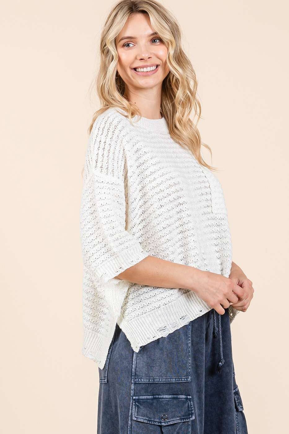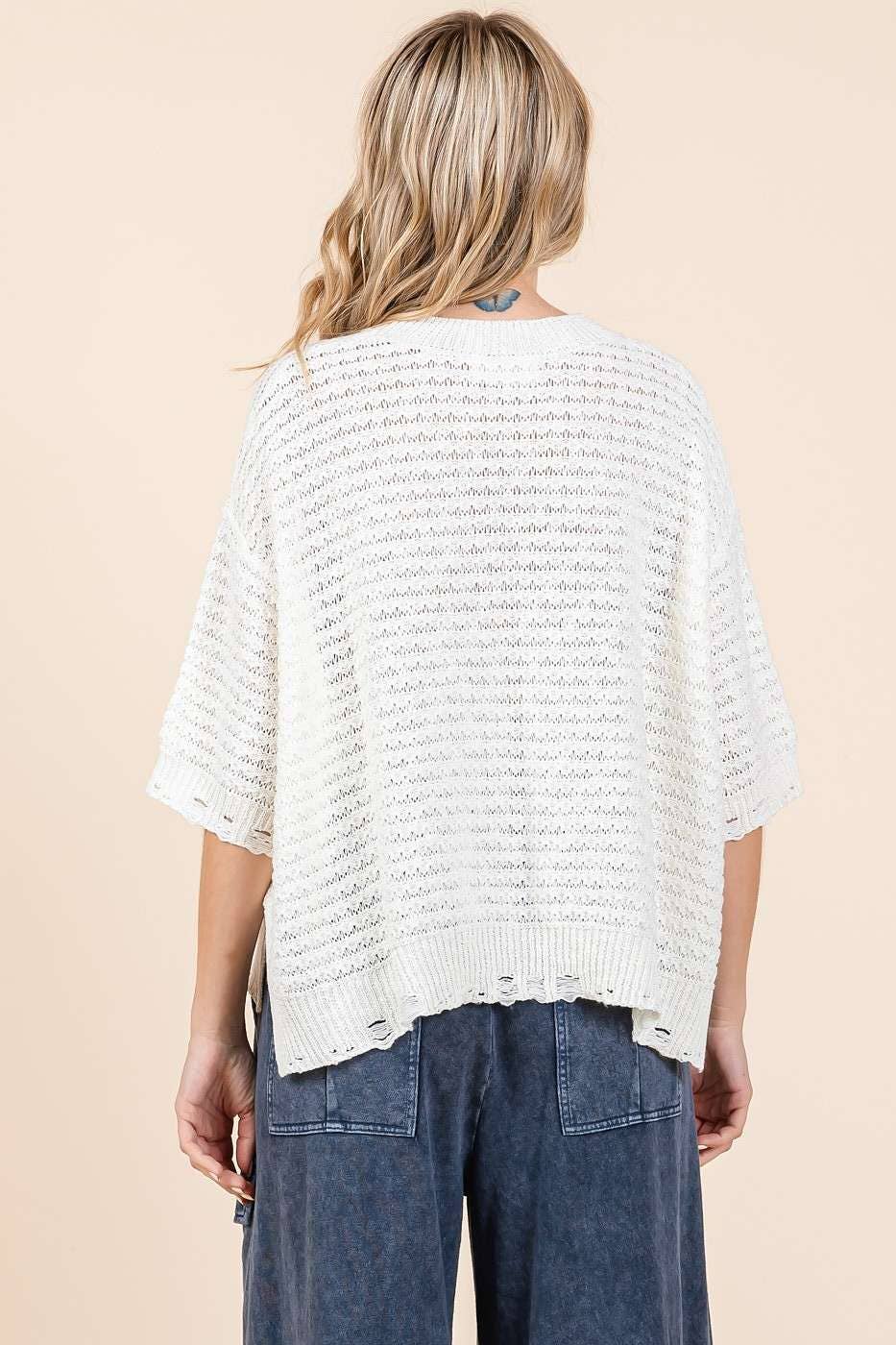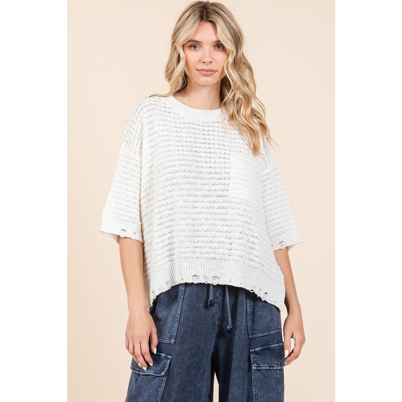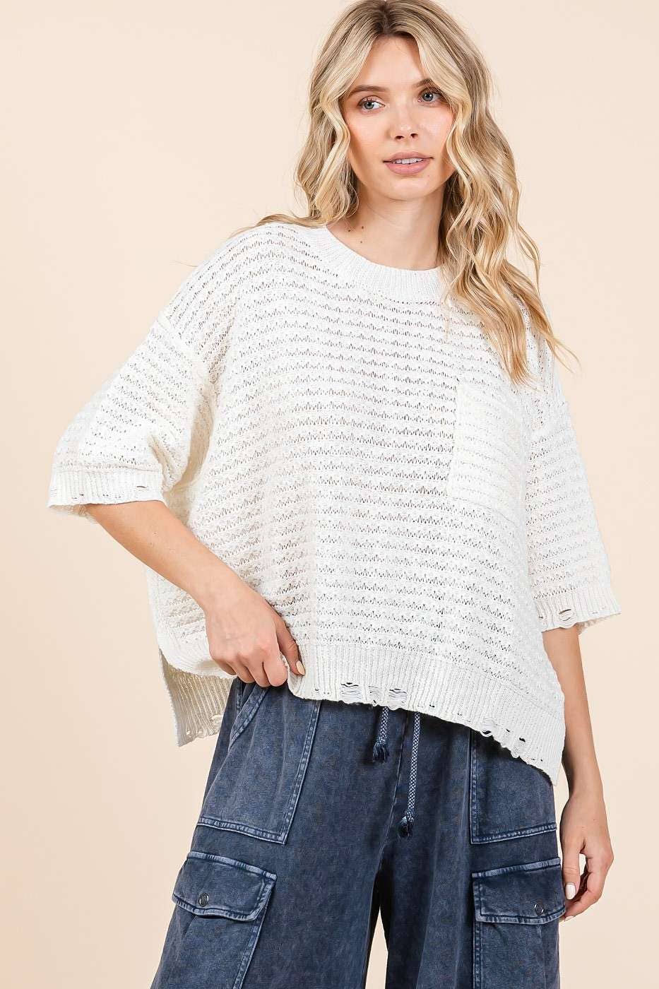 DISTRESSED HEM SHORT SLEEVE LOOSE SWEATER KNIT TOP