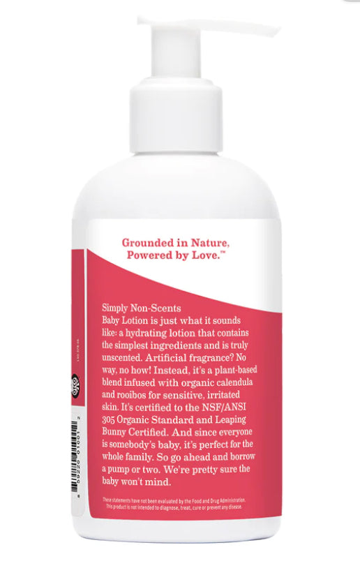 This cruelty-free lotion is perfect for just-plain-sensitive or brand-new-to-the-world skin. Because here’s the thing: souls fresh from the womb are clear about their priorities. They’re more about feeling good than smelling good. And soft, moisturized skin is a big part of that. So it contains organic herbs and oils to moisturize babies of all ages — from top to bottom, and from cheek to shining cheek. Know this: we’ve formulated this lotion with extra care, because much of what goes on your baby goes in your baby. So slather and snuggle with abandon — it’s all good.