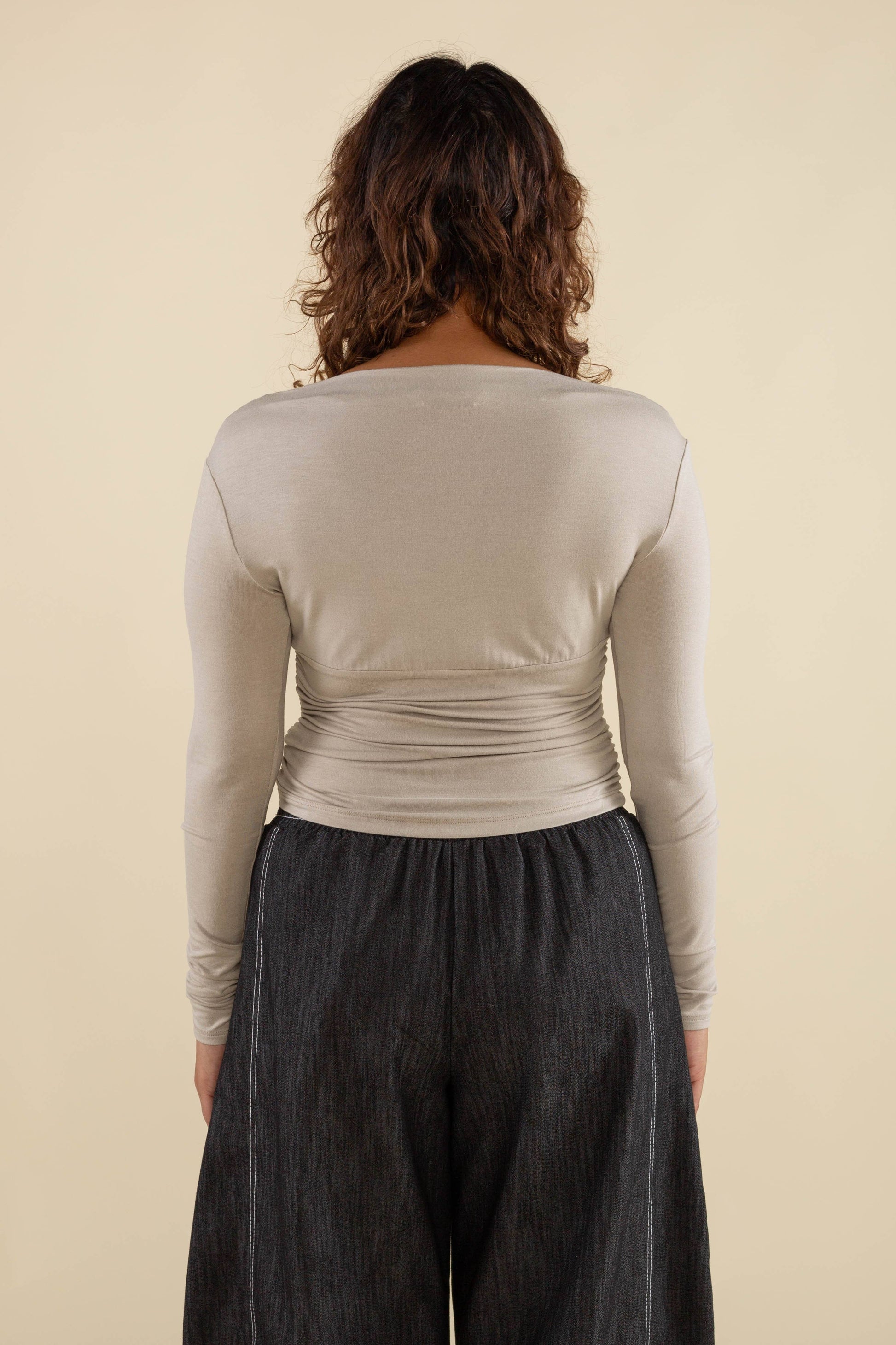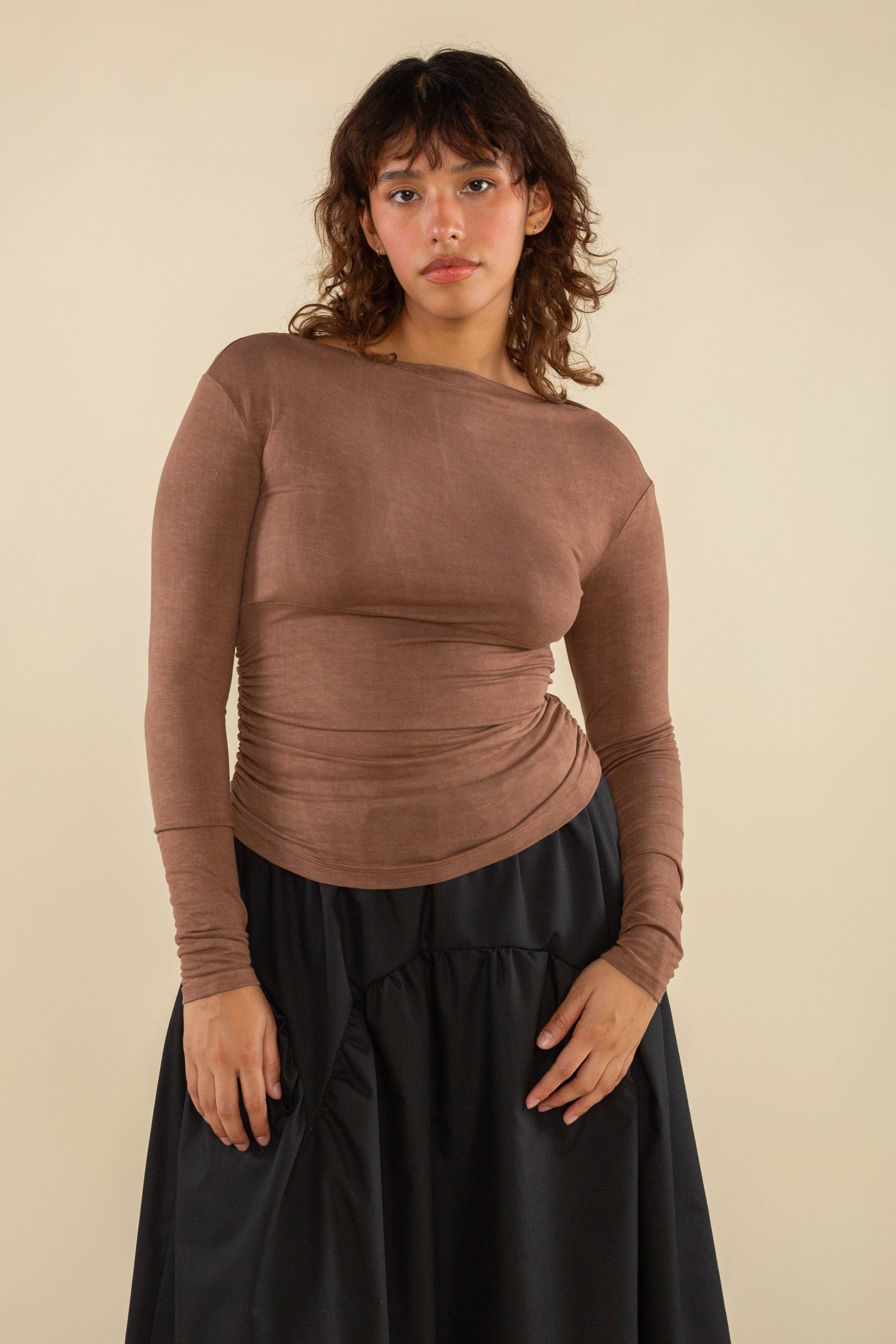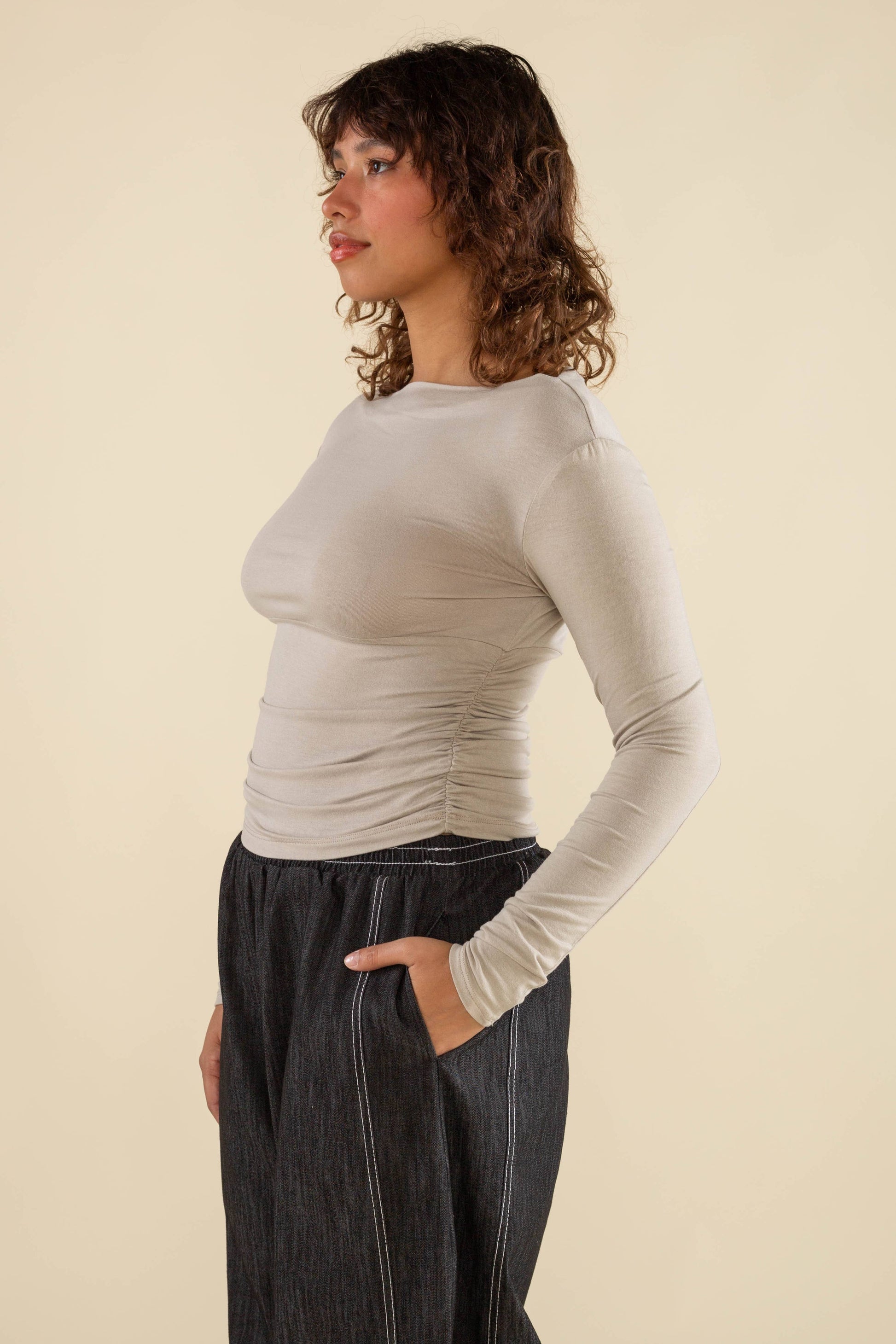 Boatneck shirred waist long sleeve shirt in super soft jersey knit.