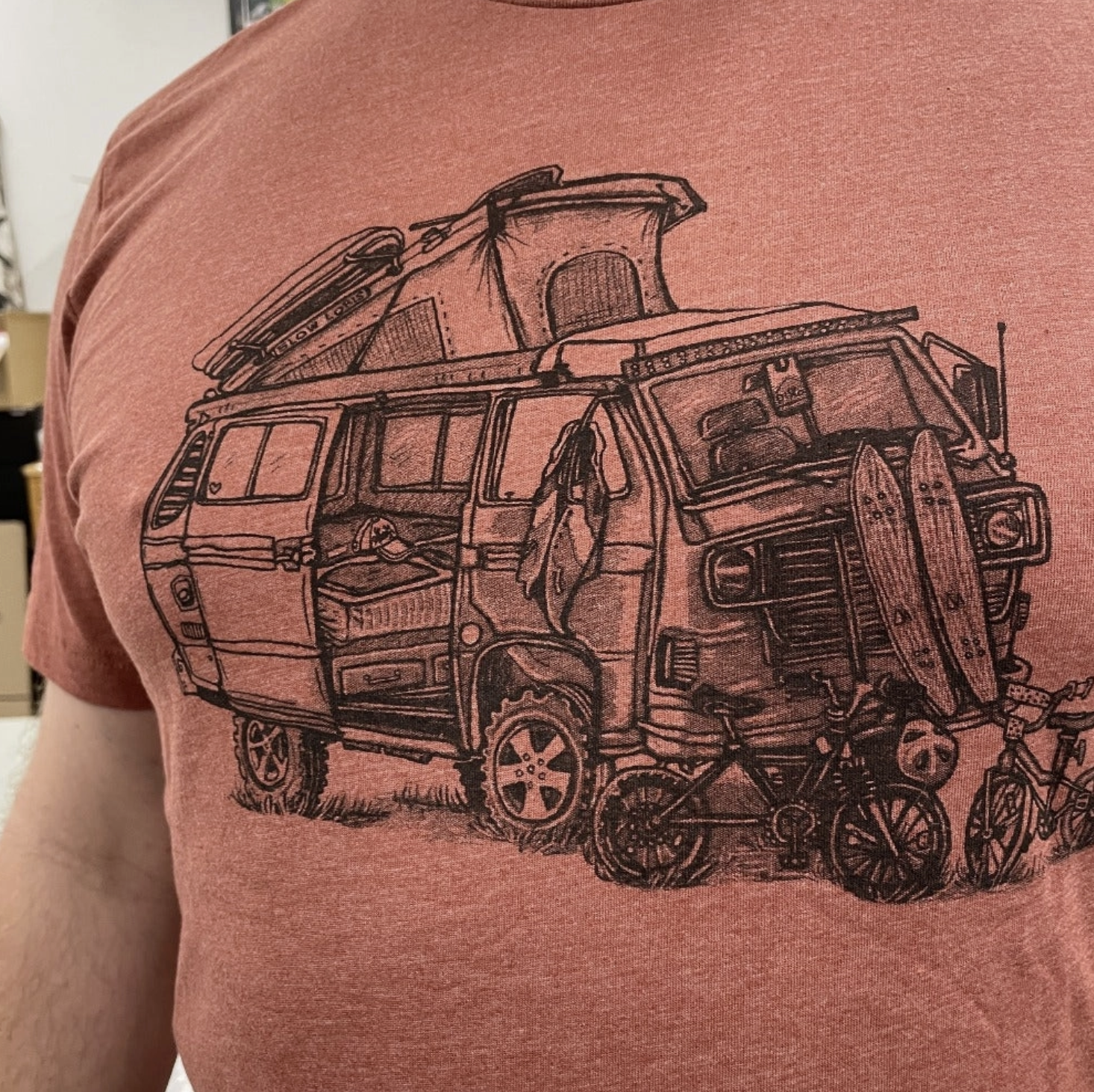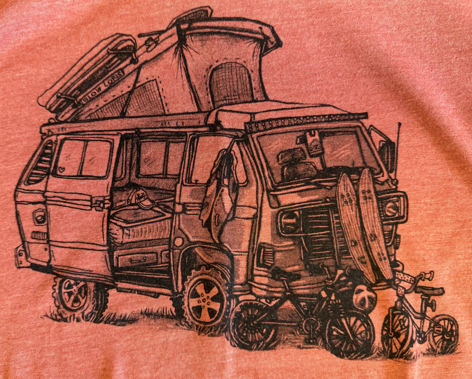 Family Van aka Fam Van is a design created from an original pencil drawing of Arlo’s van during a camp trip last Spring at Fort Flagler State Park.
