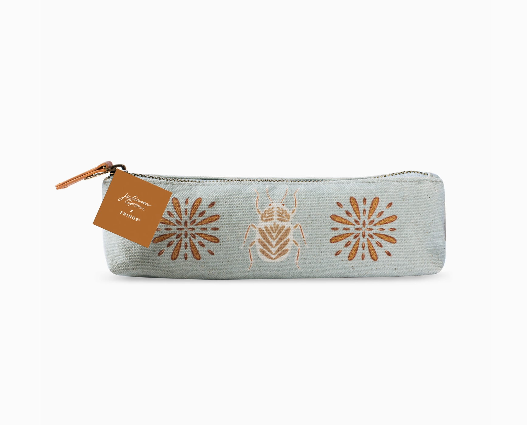 FLAT BOTTOM PENCIL POUCH. 100% cotton canvas featuring artist collaborated design by Juliana Tipton. Cotton lined with vegan leather zipper pull and embossed logo charm.