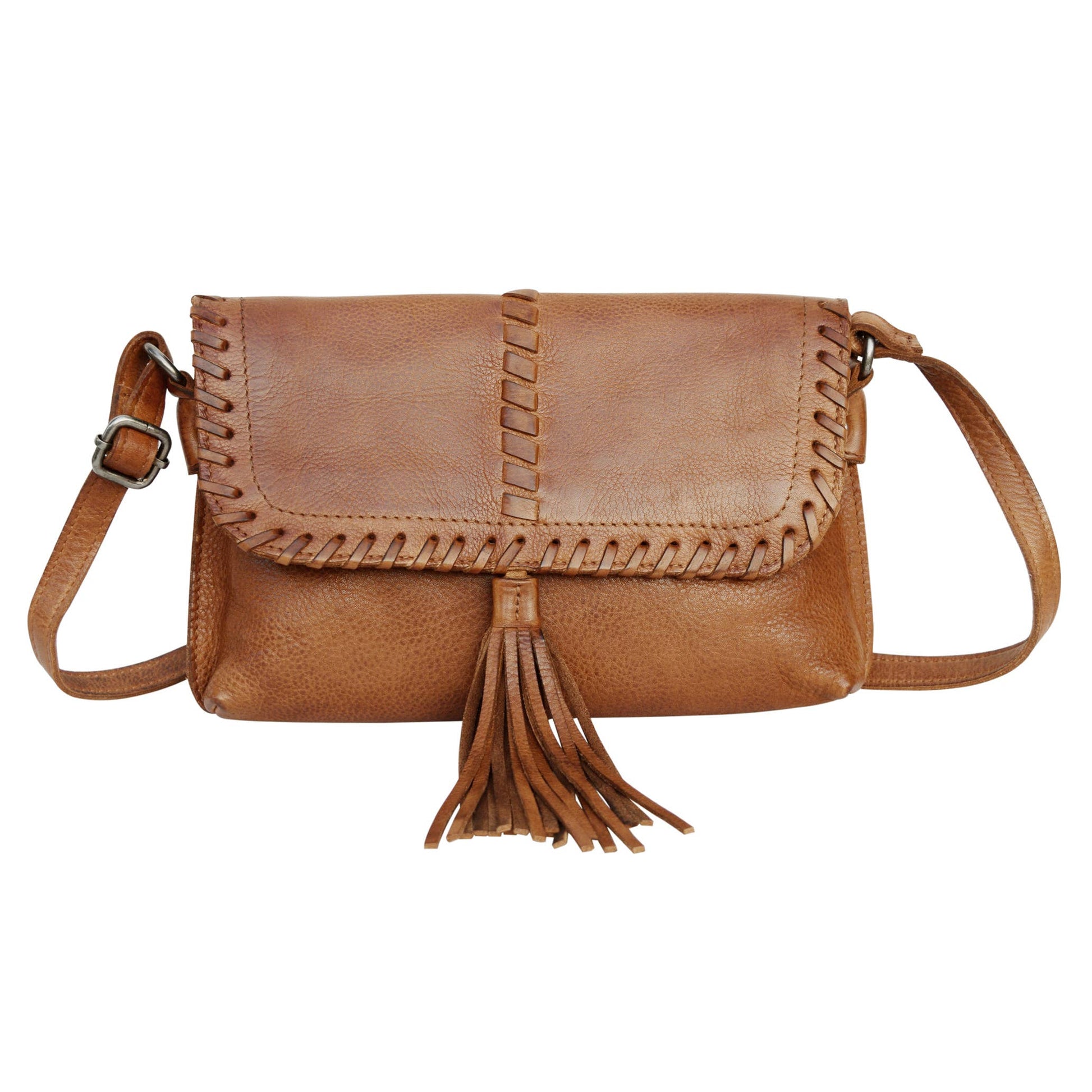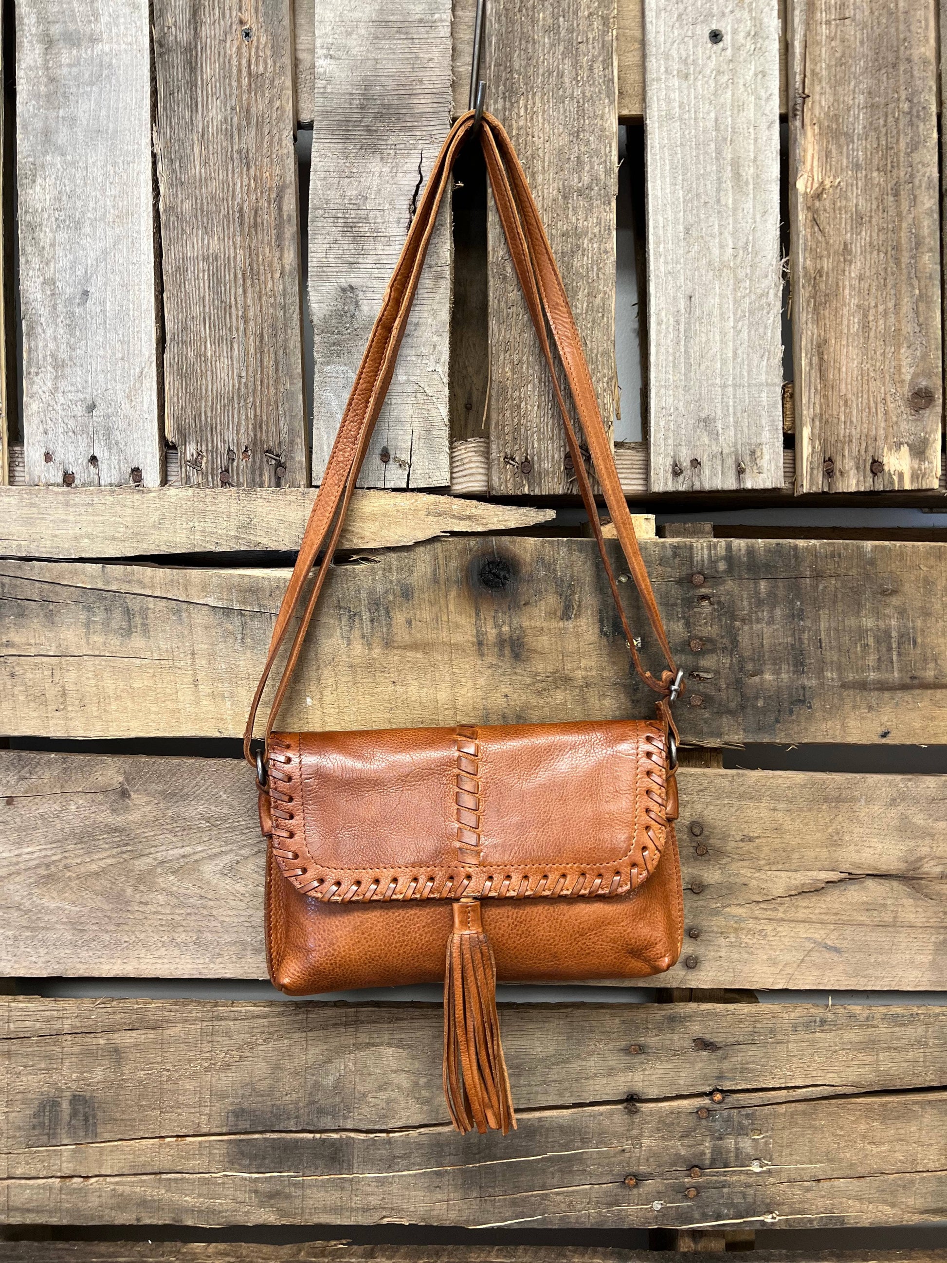 6.25”H x 2”D x 9”L - Contemporary western with modern aesthetic - Top flap opens to reveal secure zip entry - Exterior back zip pocket, leather whipstitching + center tassel - Interior zip pocket + leather credit card slots