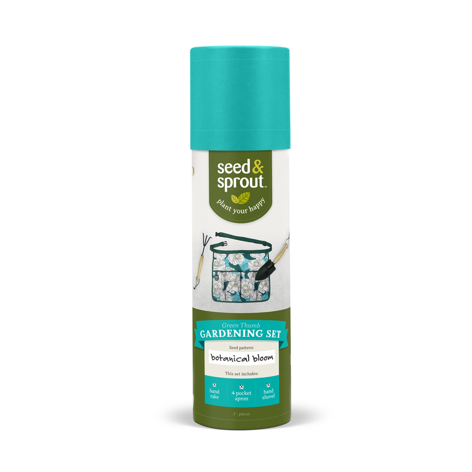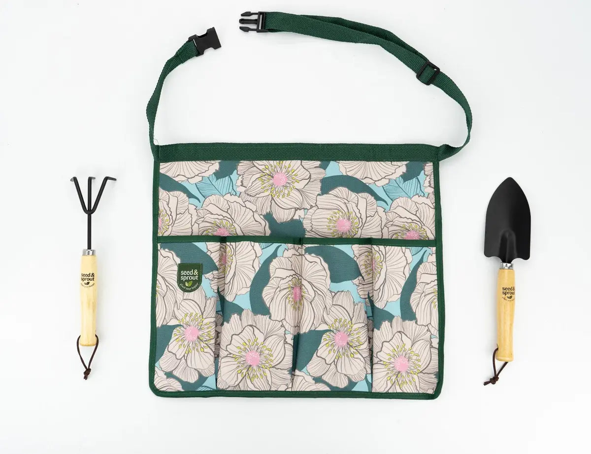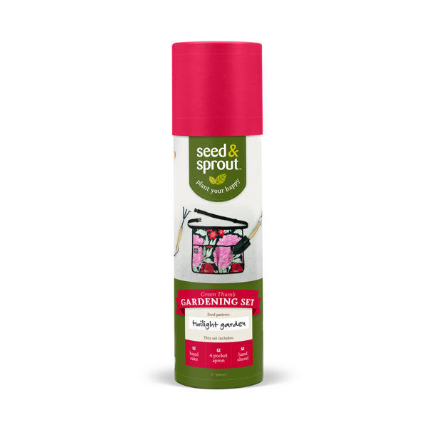New plant parents and seasoned gardeners alike will love the gift of home grown happiness. This three piece gardening set includes a fun printed work apron with four pockets, one hand shovel and one hand rake.