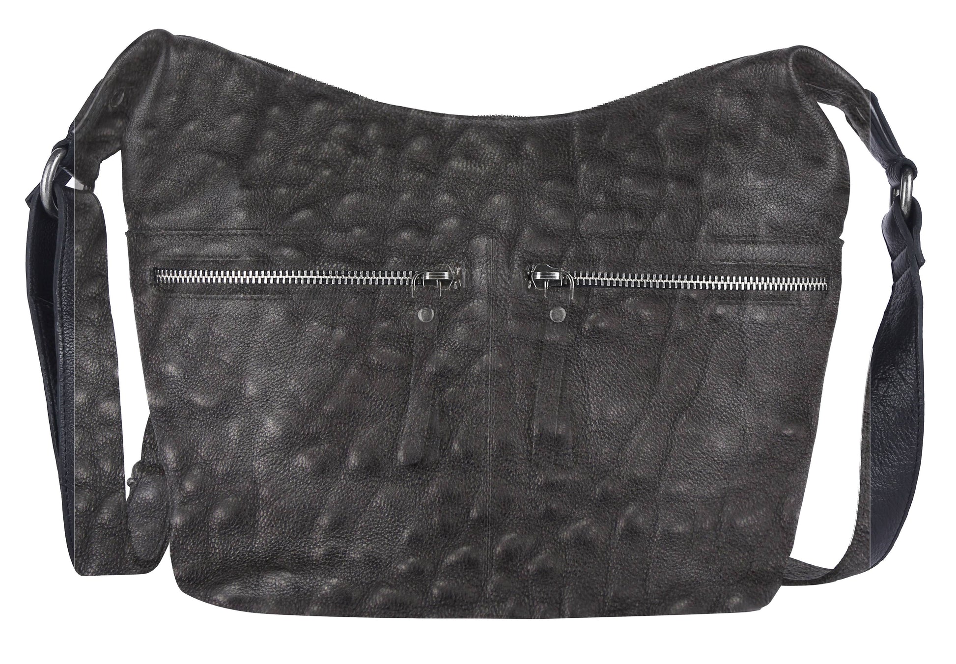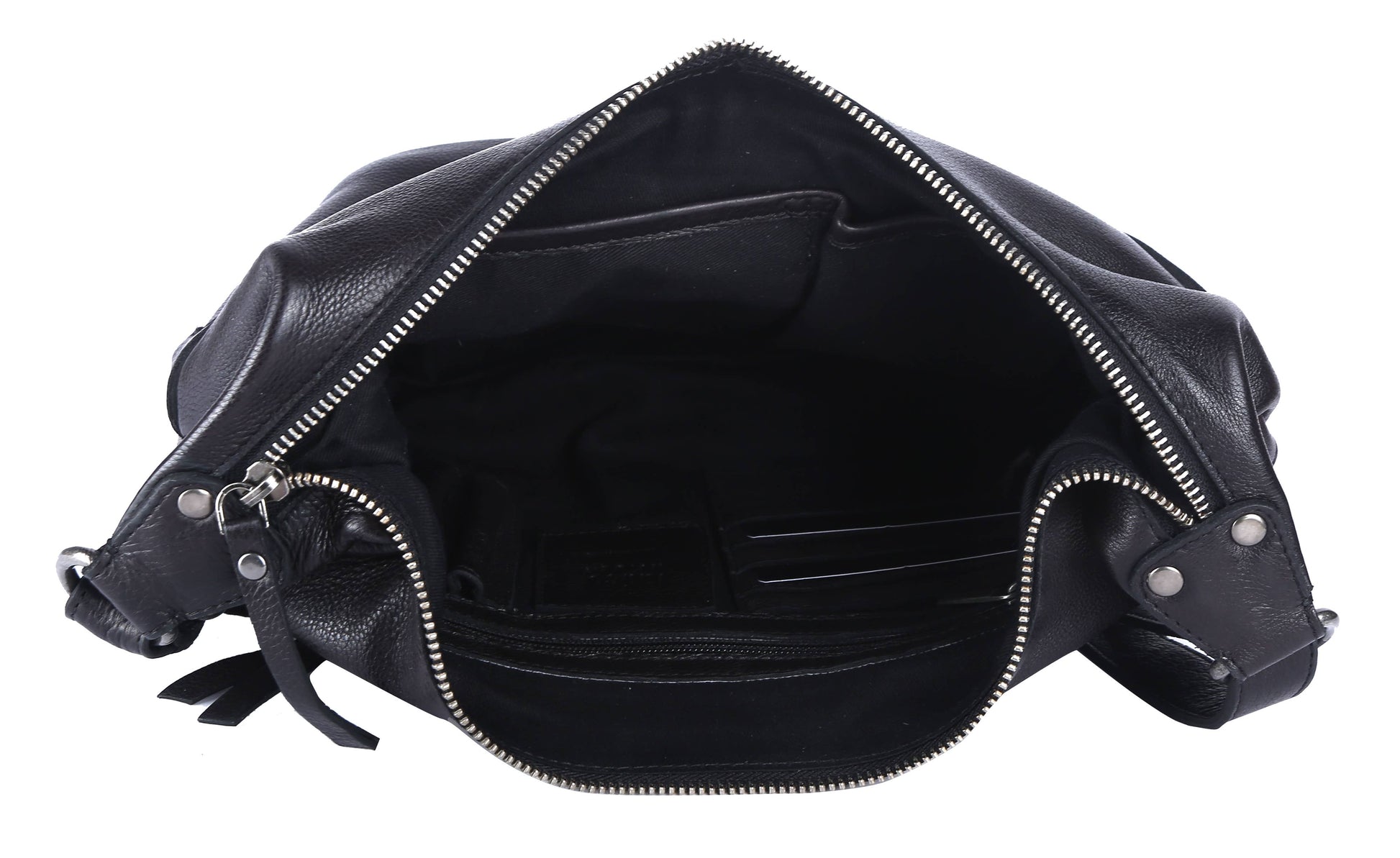 100% Leather 1 wide adjustable cross body strap-32” max:16” min drop Top zip entry Exterior features 2 zip pockets and 2 slip pockets and back zip pocket Interior features 5 credit card slots, 3 pen holders, back wall zip pocket, 2 slip pockets Poly cotton lining Dimensions: 9"H x 4.75"D x 10"L