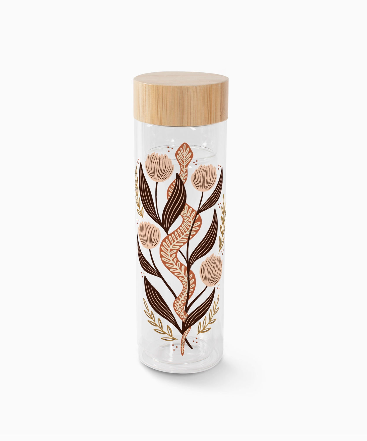 GLASS HYDRATION BOTTLE Double wall glass with bamboo screw top lid featuring artist collaborated design by Juliana Tipion. & Megan Galante.
