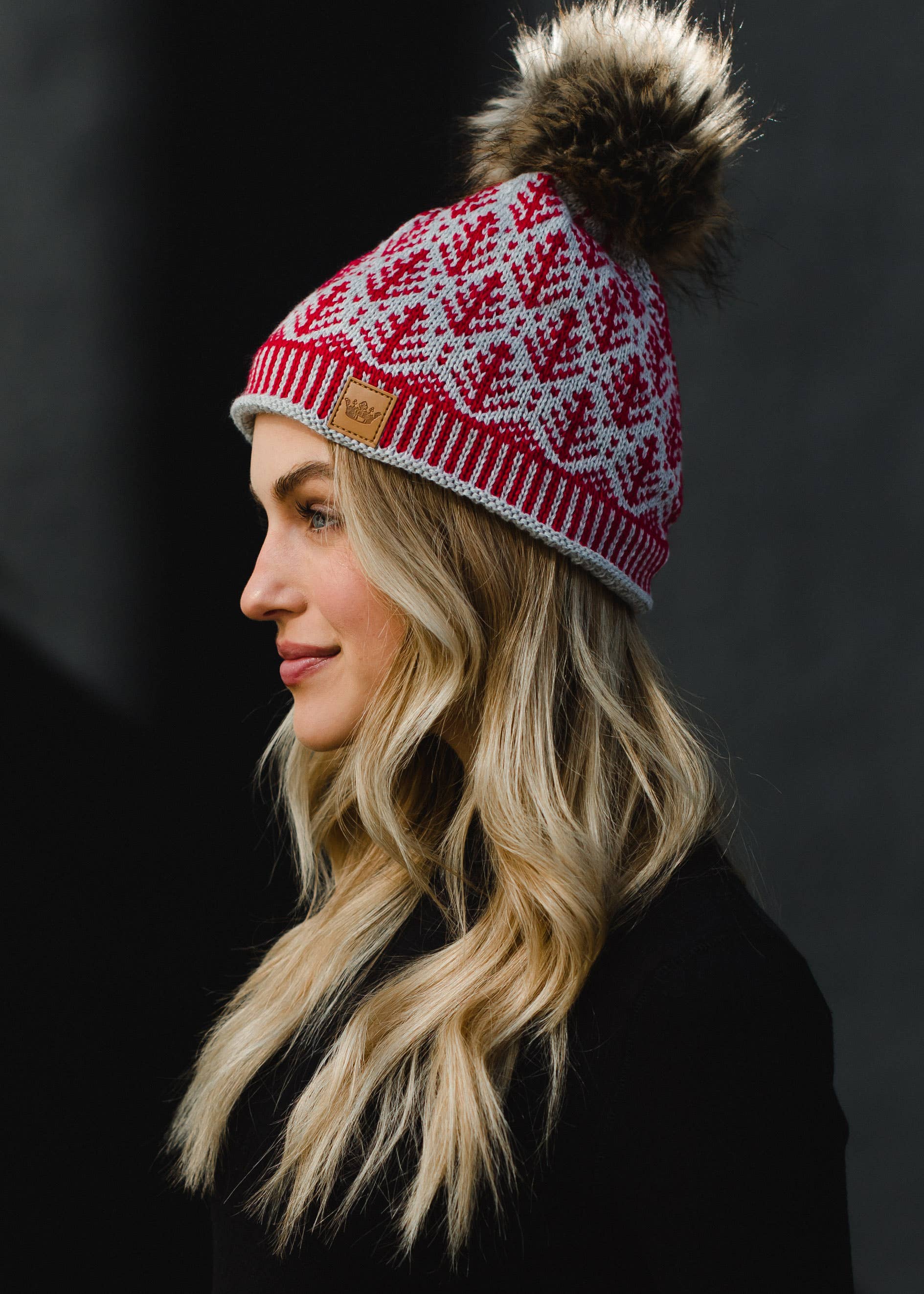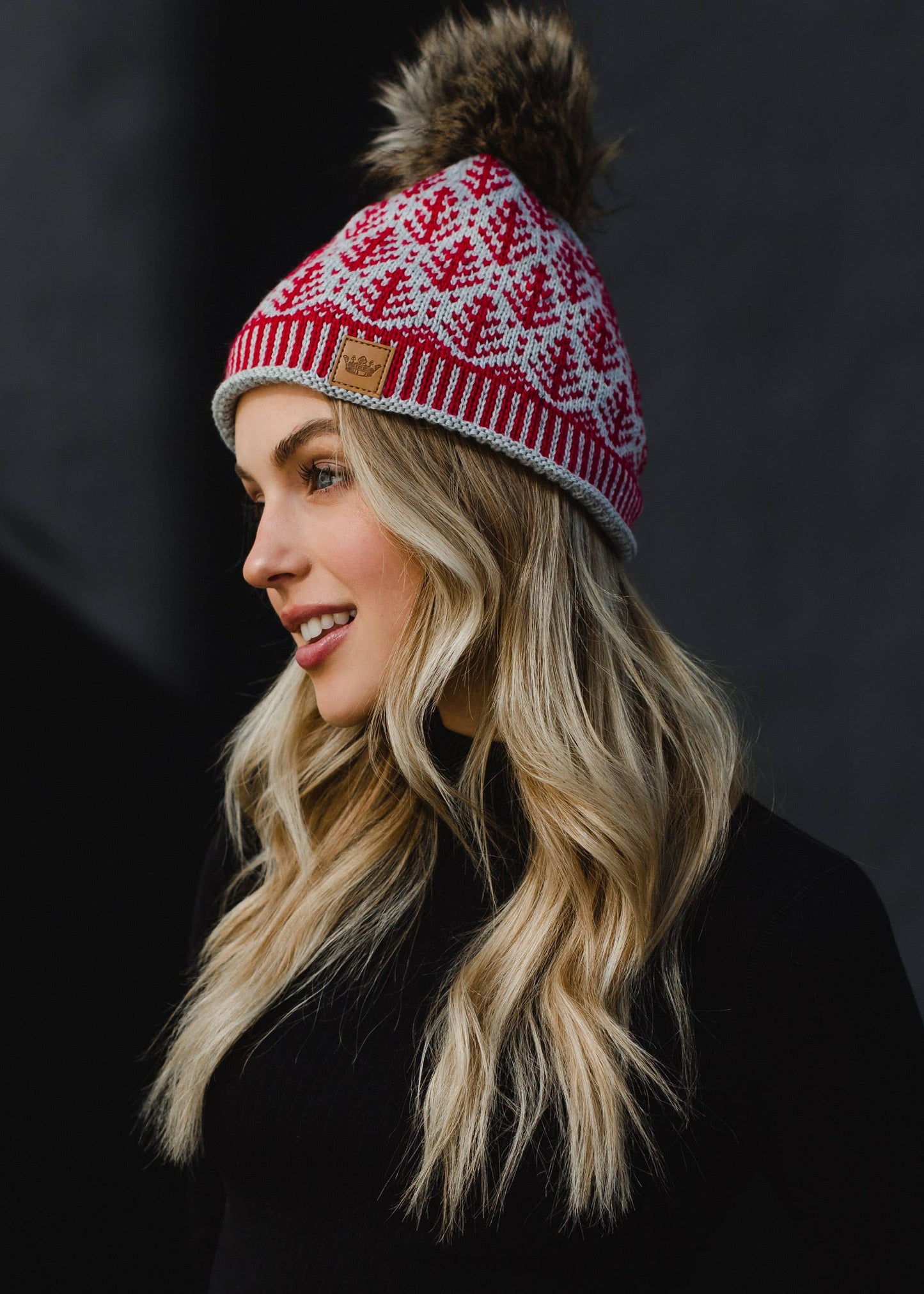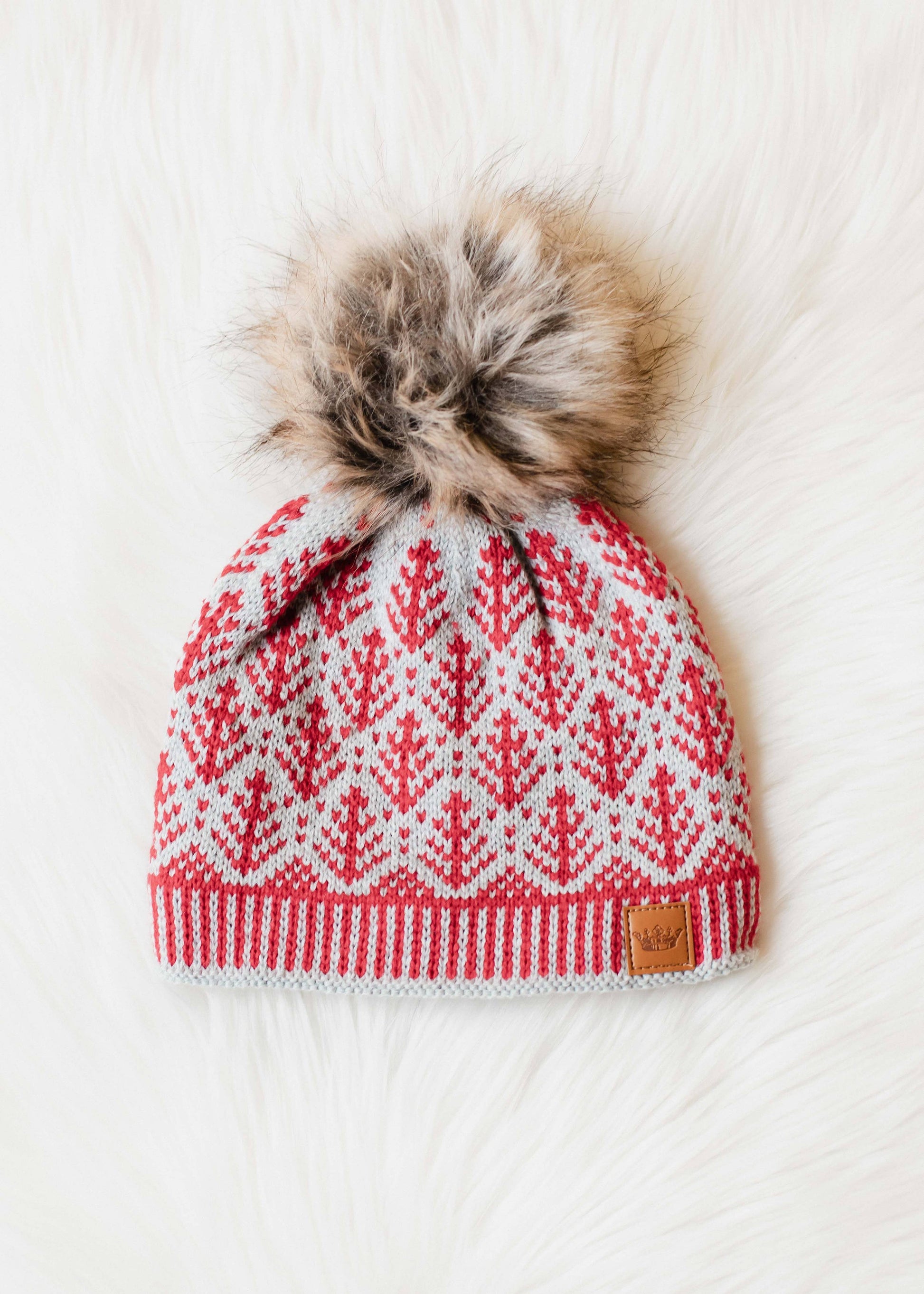 Gray knit hat with red tree pattern Natural faux fur pom accent Fleece lined 100% Acrylic