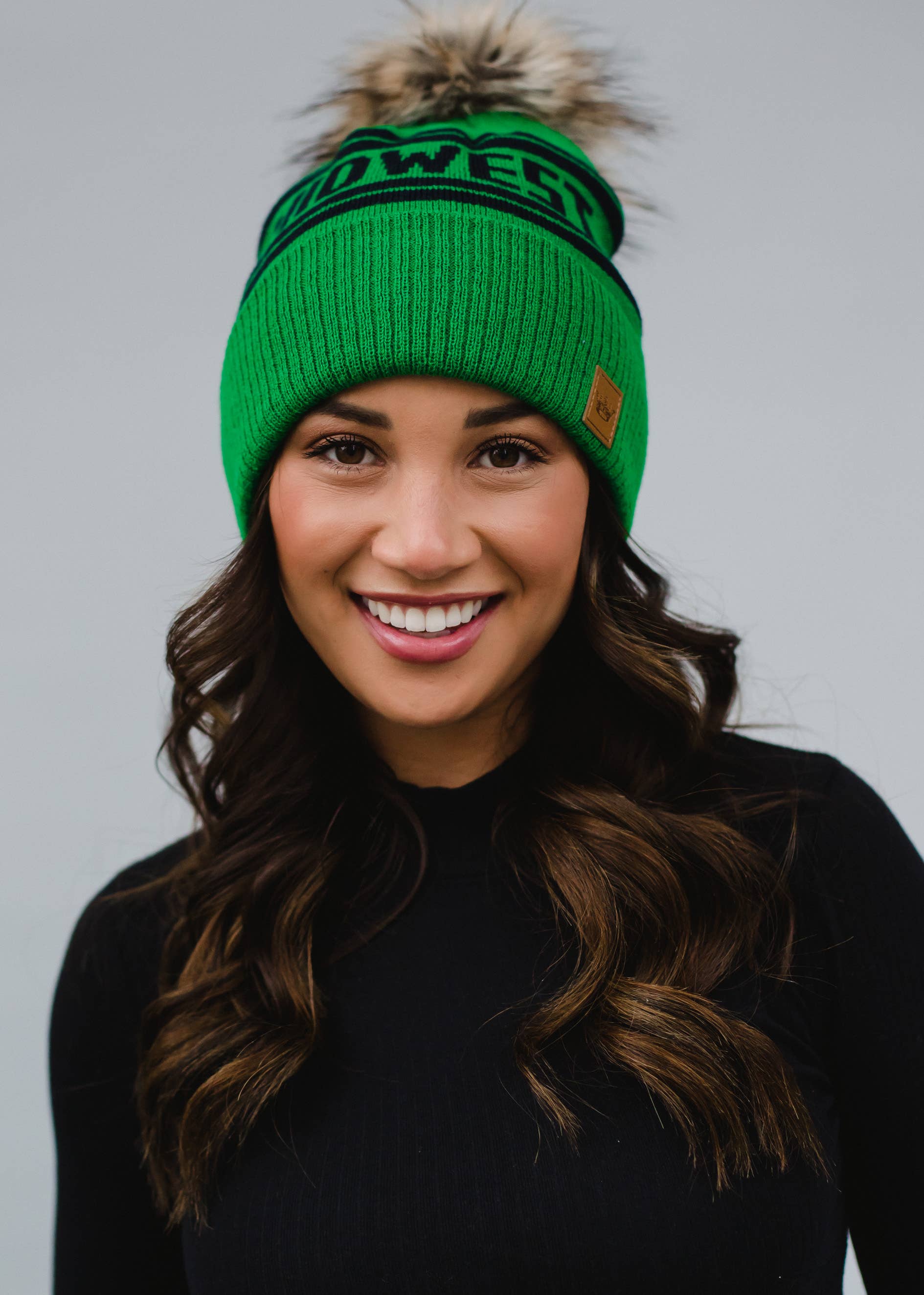 Green & navy Midwest knit hat Natural faux fur pom accent 100% Acrylic