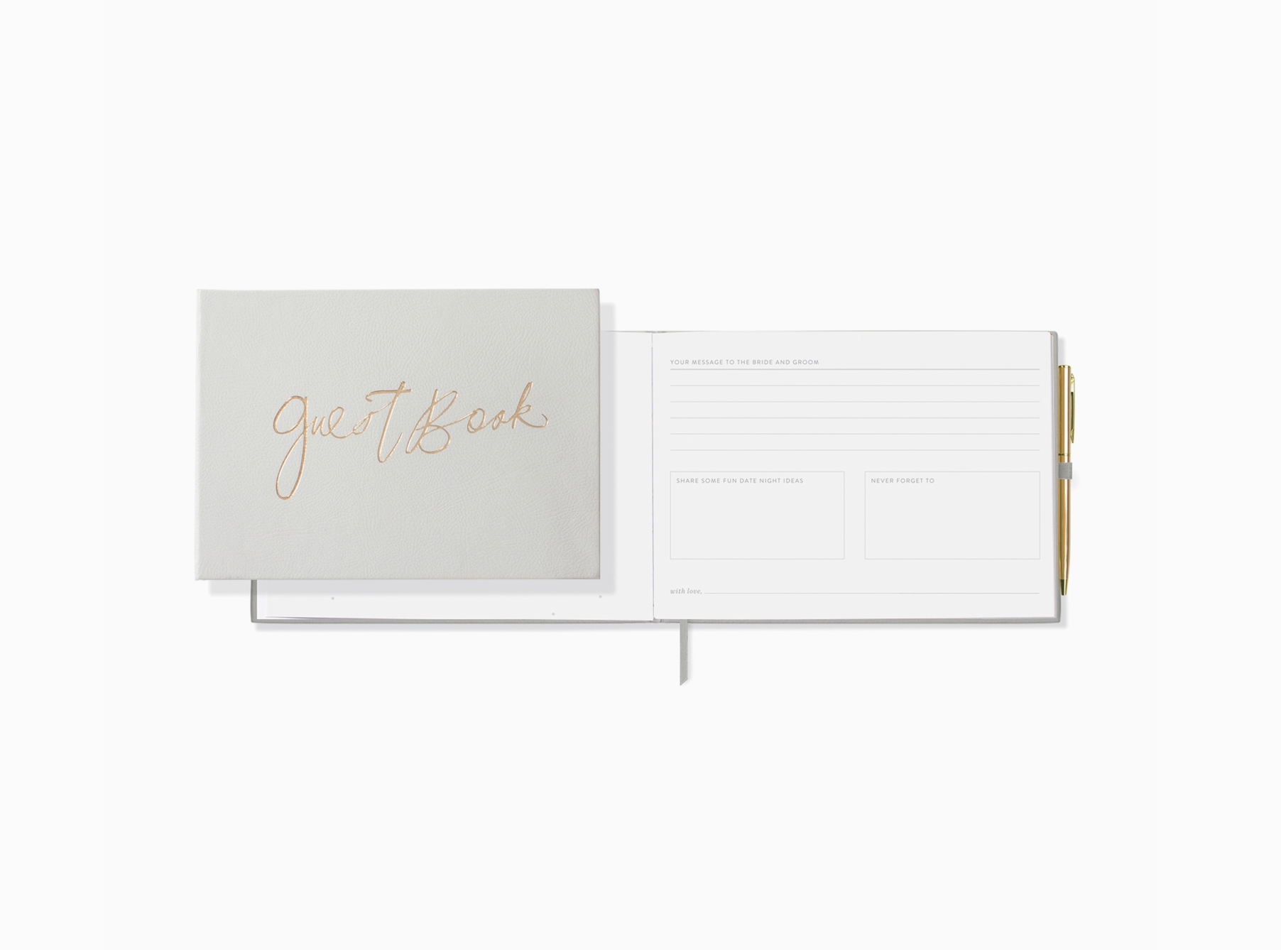 Vegan leather hardcover guest book with gold foil design accents and velvet ribbon marker. Includes pen loop with an elegant ballpoint pen and 220 guided pages. 8.5” x 6”, guest books are not gift boxed.