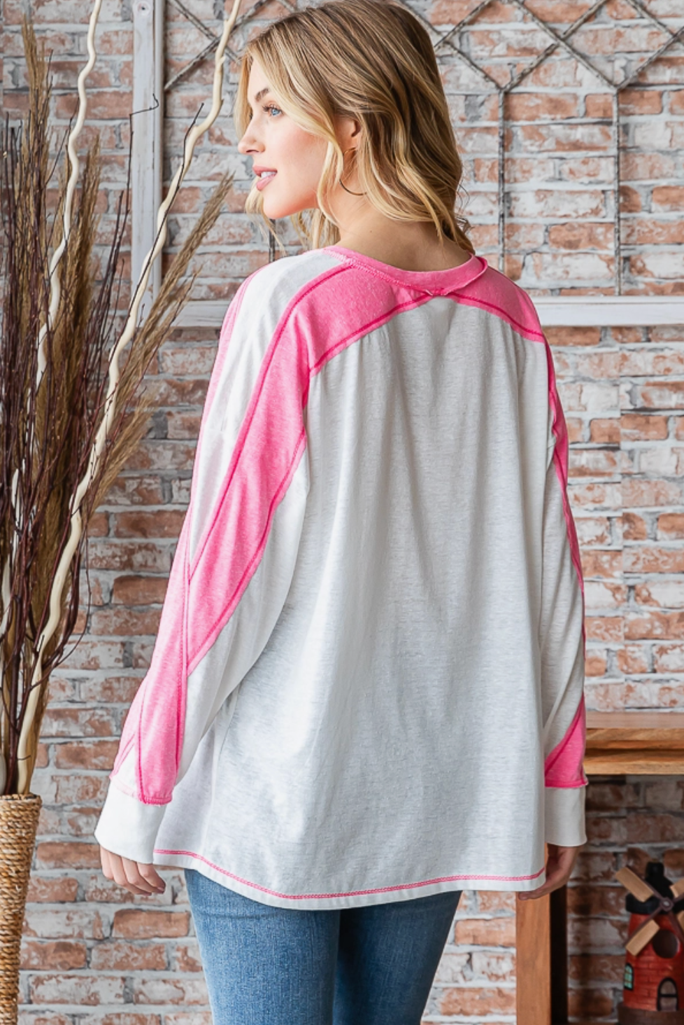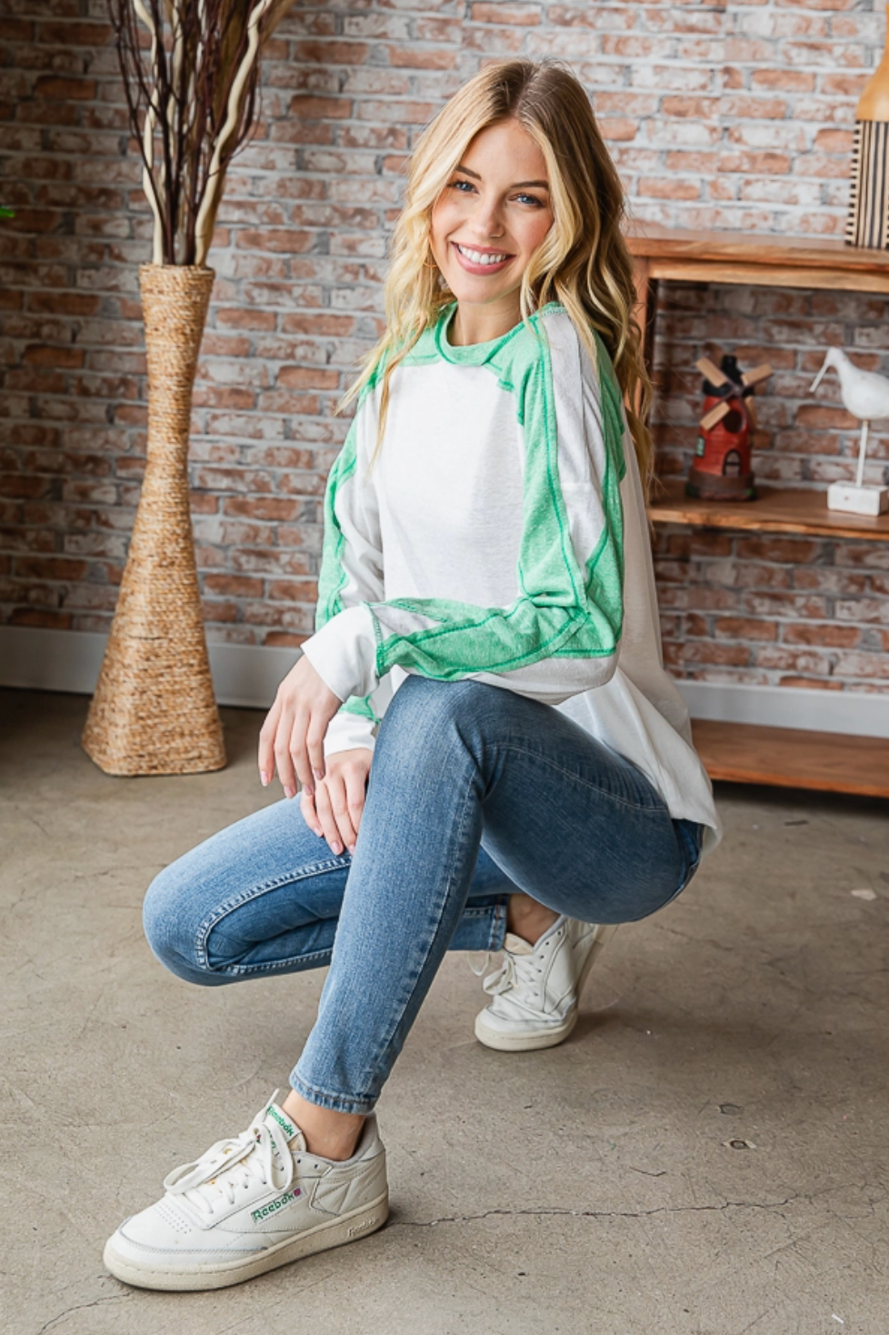 "Happy Hannah" is a playful knit top with color block sleeves, exposed stitching, and seam detailing. Made in the USA with a fabric blend of polyester, cotton, rayon, and spandex, this top offers comfort and style in one. Introduce your wardrobe to this color pop!