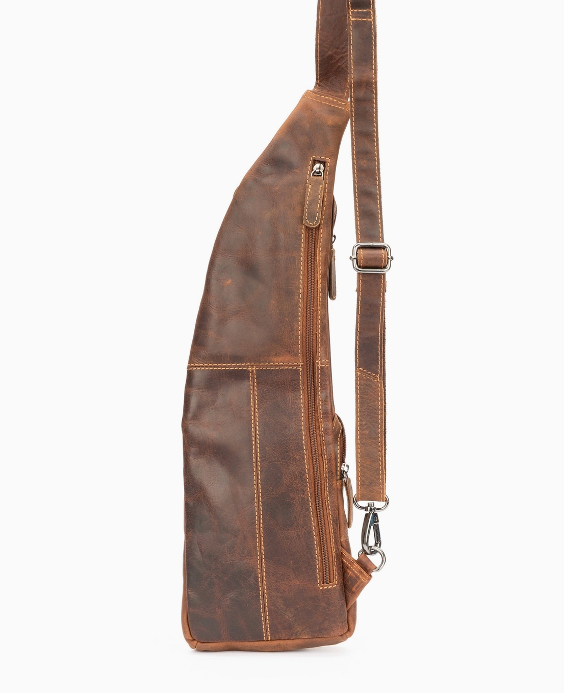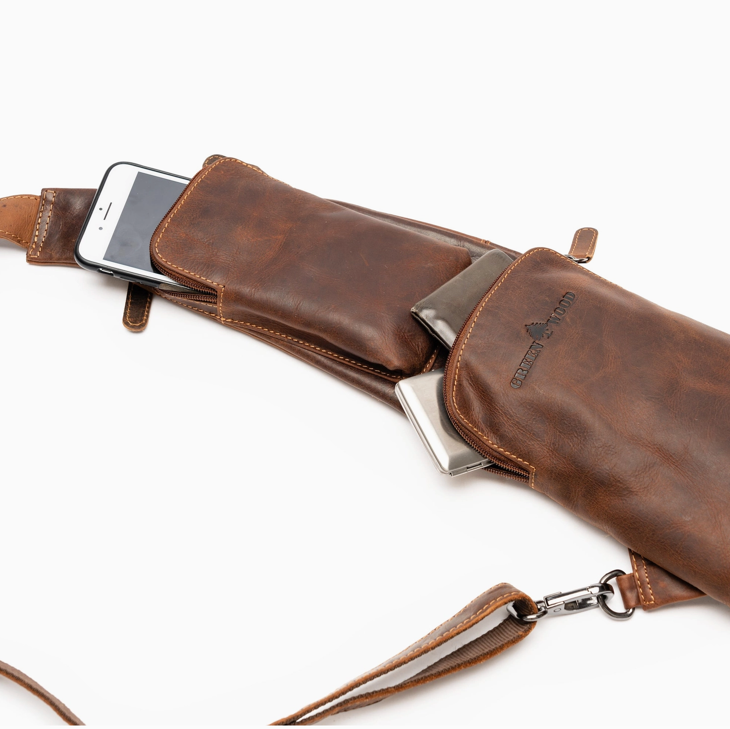 This leather cross-body bag has 2 zippered compartments on the front. The top compartment is spacious enough for your phone or wallet. The lower zippered compartment is larger and suitable for storing papers (A5 format). A zippered compartment has been placed over the entire length of the back side.
