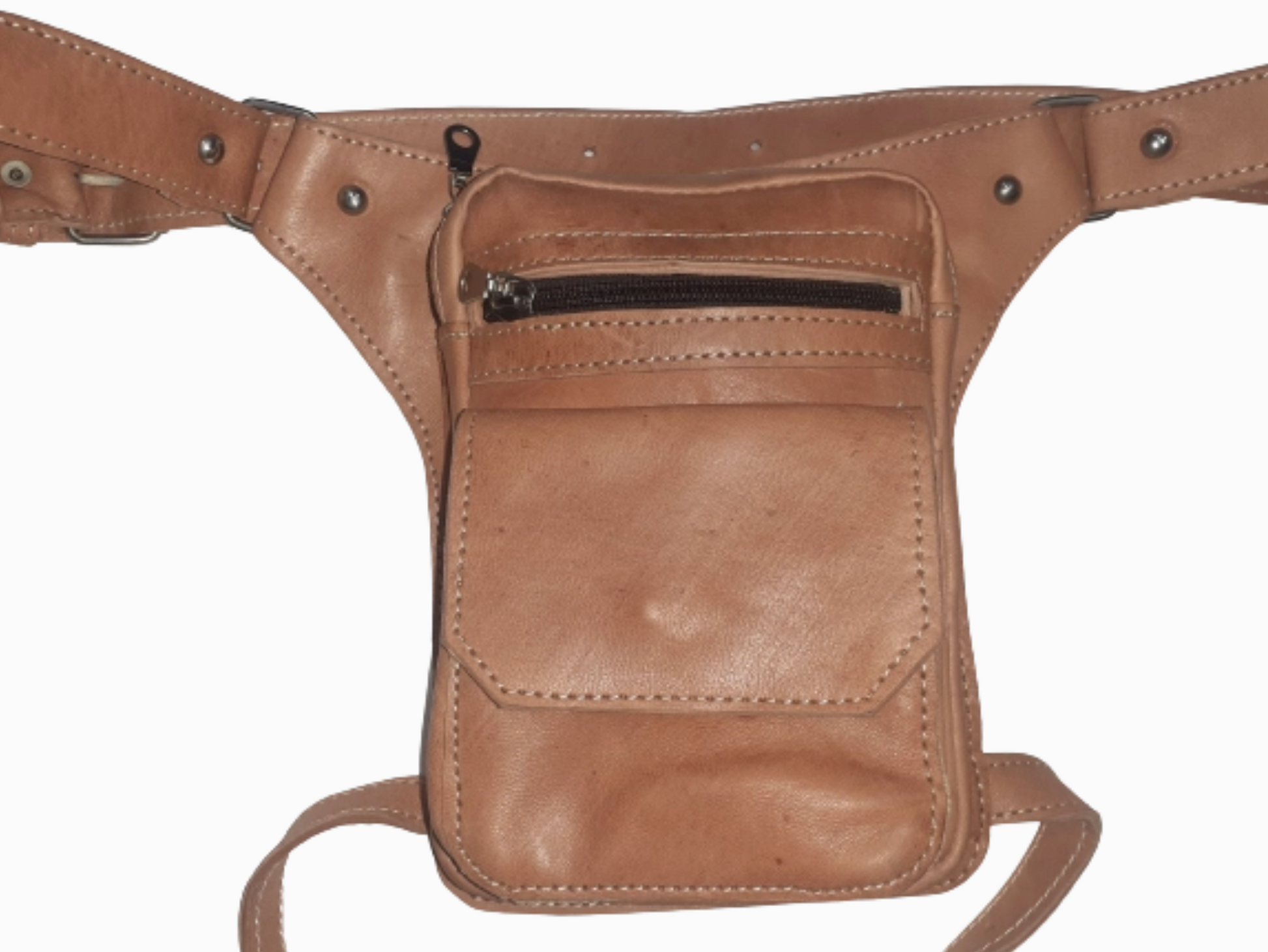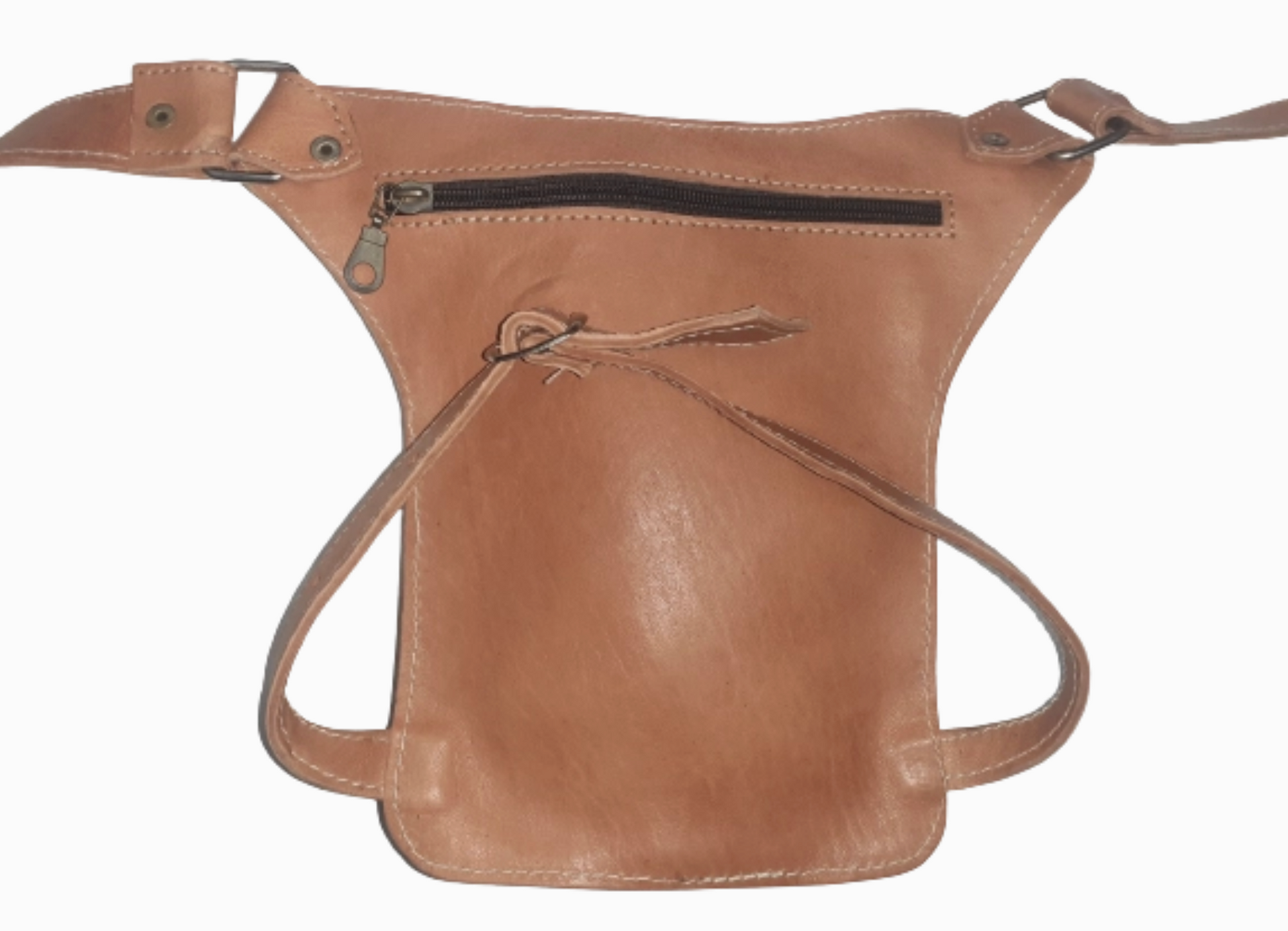 Very good quality multi-pocket leather waist bag. With an elongated shape, it is a fanny pack with the main pocket in the central part, a zipper in the back, a front zip pocket and another pocket with a magnet. On each side there is a hook in case you want to hang the keys. At the bottom there is a strap to tie to the leg.