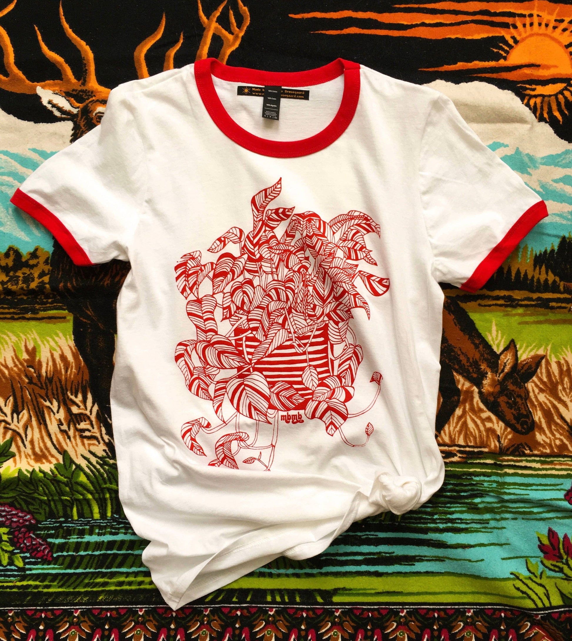 "I drew this pothos plant that lives in my studio, because I am proud that it is not dead. Perhaps it reminds you of a plant you have not killed? Printed in red on a white unisex ringer tee. Unisex-please see last photo for sizing information. 4.3 Oz., 100% Combed ring-spun cotton, pre-shrunk 32/1's fabric tubular construction, contrast color binding at neck and sleeves double-needle bottom hem" - MBMB