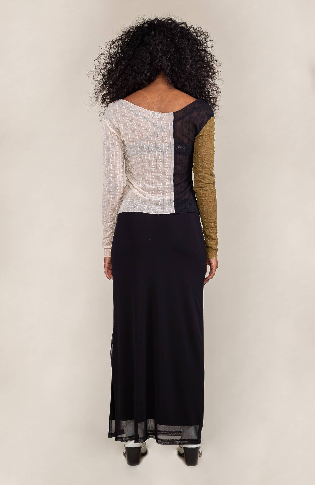 3 way color block asymmetrical long sleeve jacquard mesh top. Made in the USA