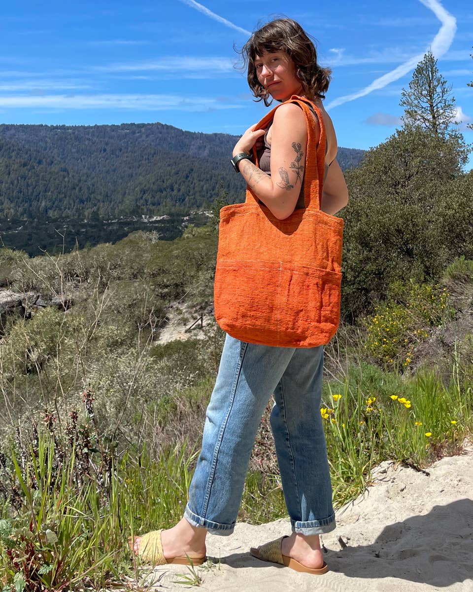 This large hemp bag is perfect for a day at the beach, or a trip to your favorite farmers market! It is a very simple design with two wide handles, two front pockets, and no lining. Hemp fiber is one of the strongest and most durable of all natural textile fibers. It is also extremely sustainable as it is naturally resistant to most pests, and thrives on less water than most crops. 100% hemp 15" x 15" handcrafted in Nepal