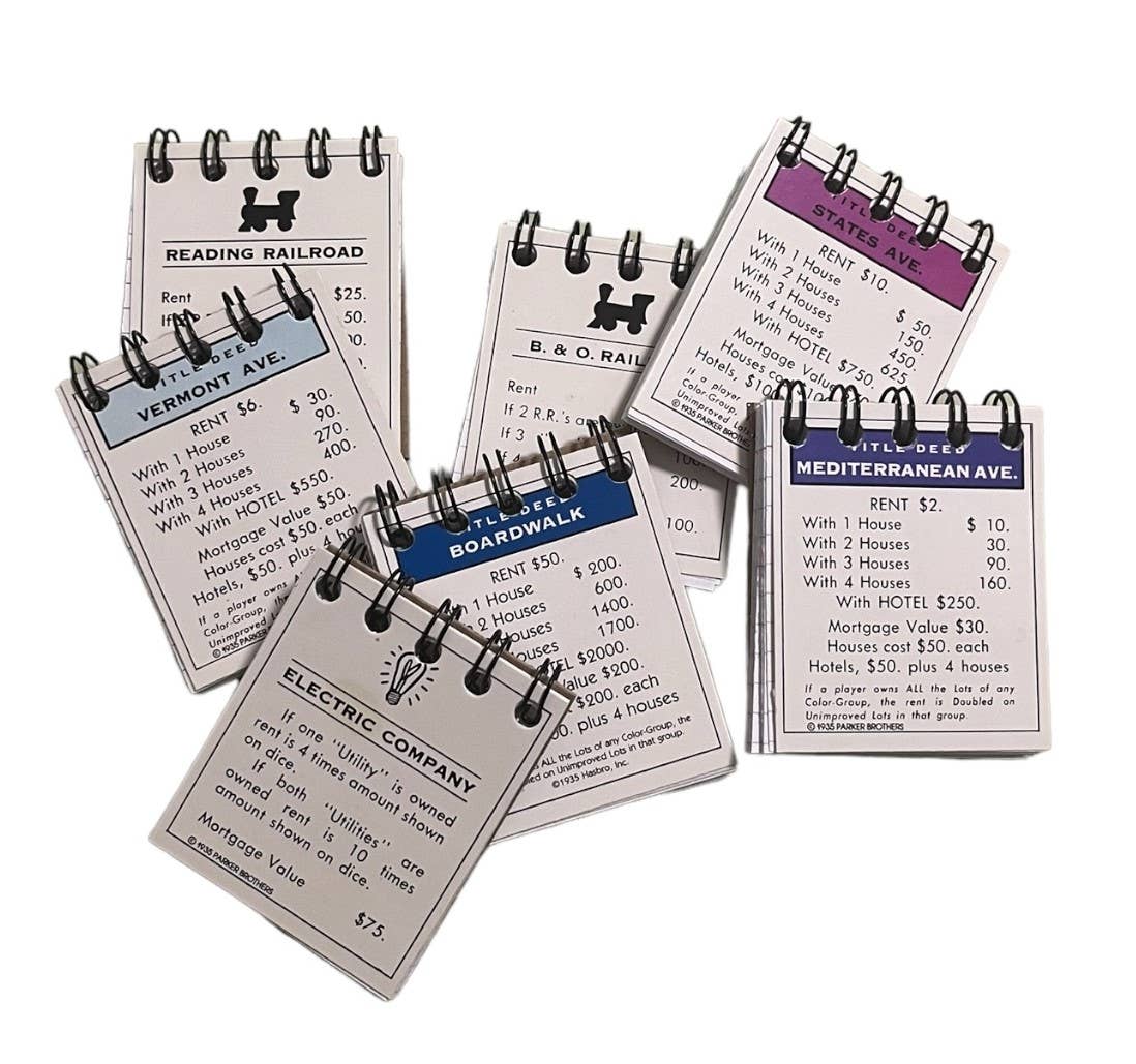These property cards from one of the world's most popular games are given a new life in these mini notebooks. Perfect for keeping score on game night, purses, pockets, backpacks and every time you want to jot something down!