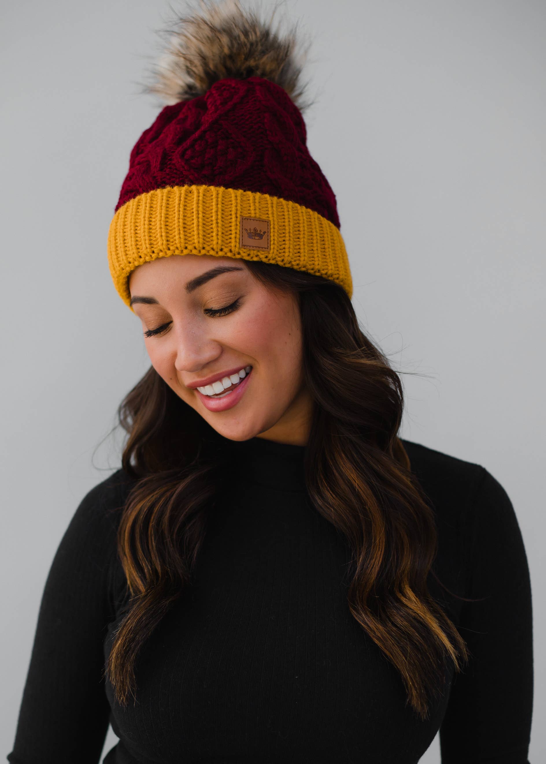 Maroon cable knit hat with gold cuff Natural faux fur pom accent Fleece lined 100% Acrylic