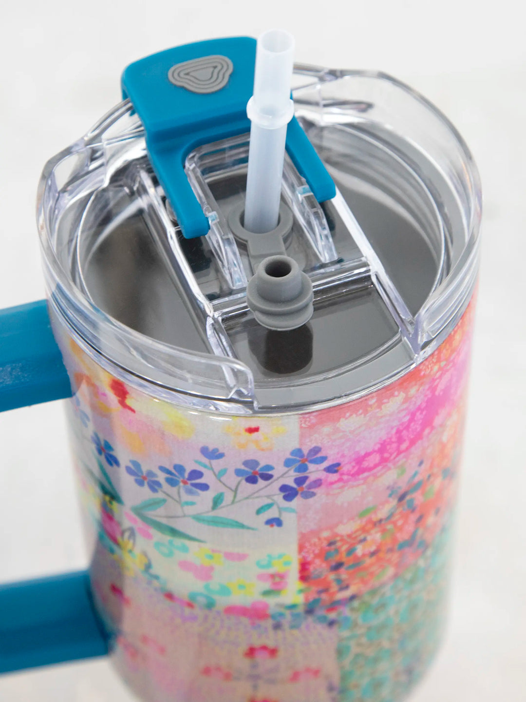 - Has large handle, lid with 2 positions and straw