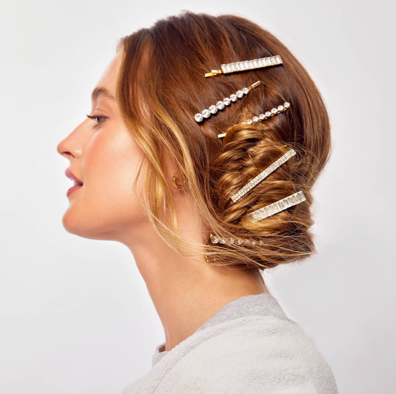 Bring on the bling. Wear or combine individual Kitsch Metal Rhinestone Assorted Bobby Pins in four sparkling styles for limitless styling options. Pull back bangs or loose layers, pin up a playful updo, or stack a few of them for a glamorous finishing touch. -Set of 4 gold bobby pins with assorted rhinestone shapes -Rhinestone shapes include baguette cut, uniform round, multi-size round and double row round -Instantly elevate your look with eye-catching gold and rhinestones