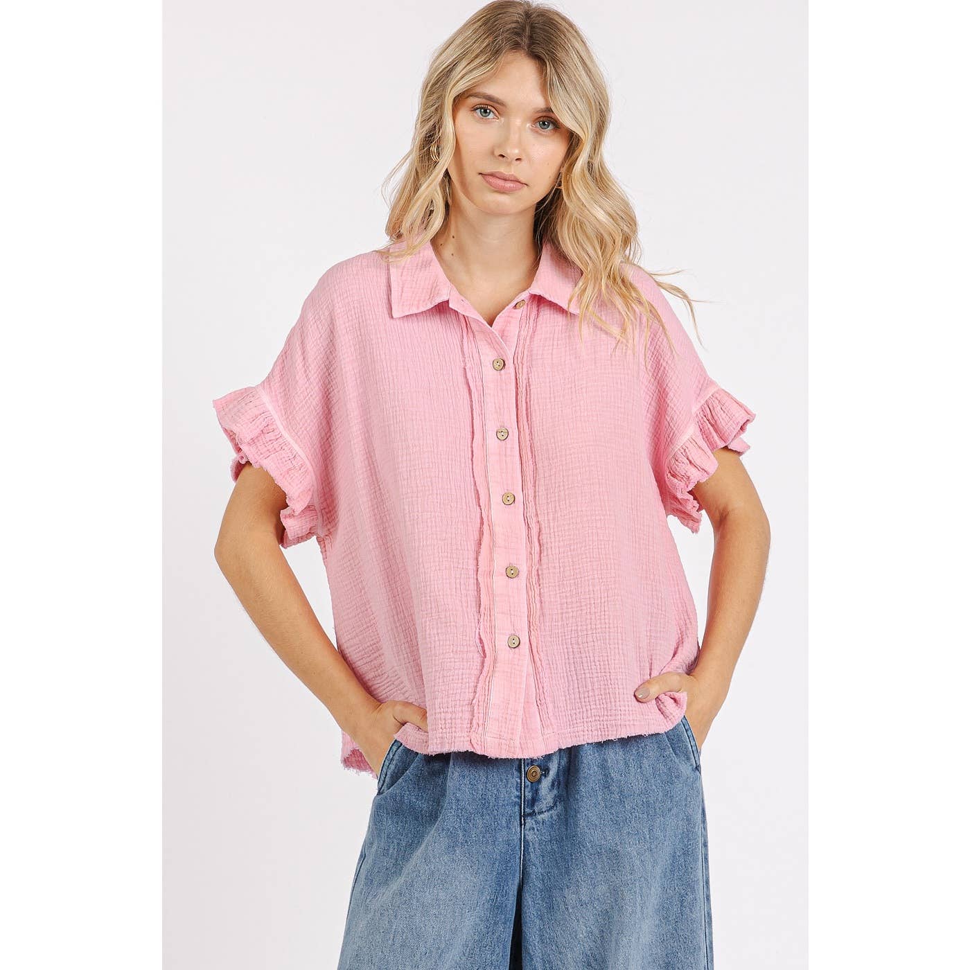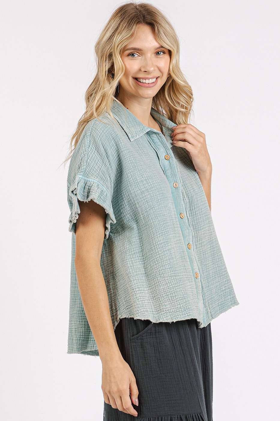 - GAUZE WOVEN FABRIC - MINERAL WASH - COLLARED - BUTTON DOWN FRONT - SHORT DOLMAN RUFFLE SLEEVE - PLEAT DETAIL ON BACK - RAW CUT EDGE HEM DETAIL - LOOSE FIT MODEL IS 5'8" AND WEARING SIZE SMALL