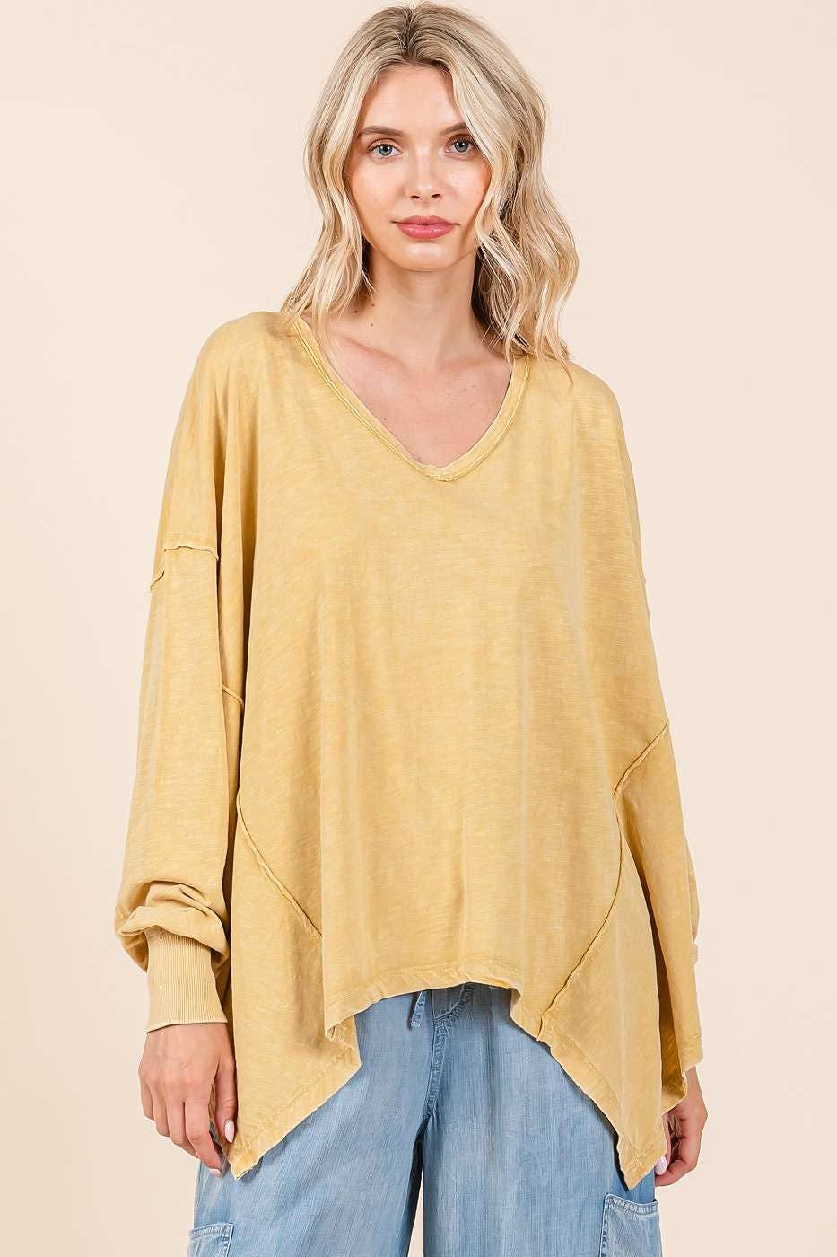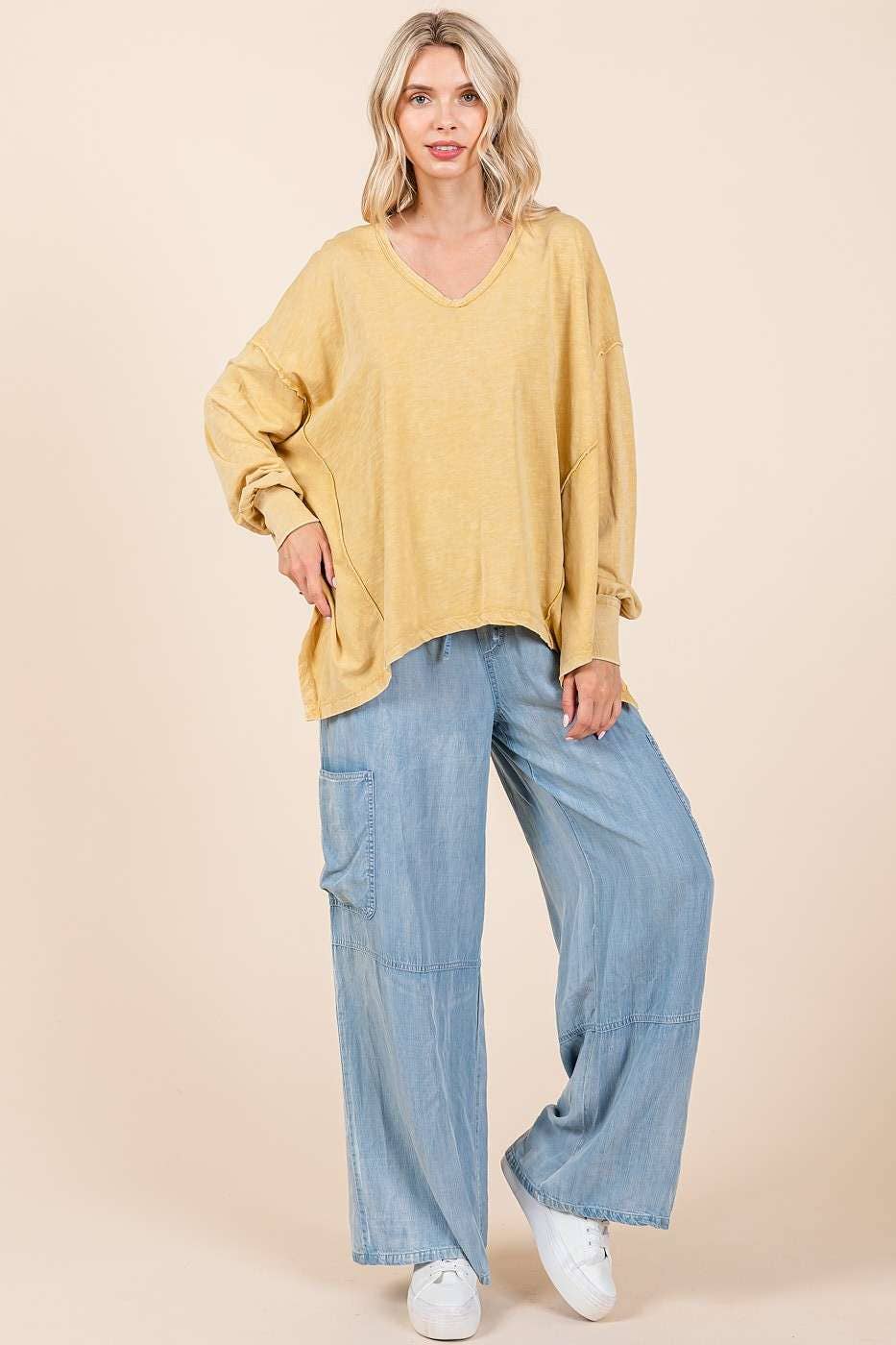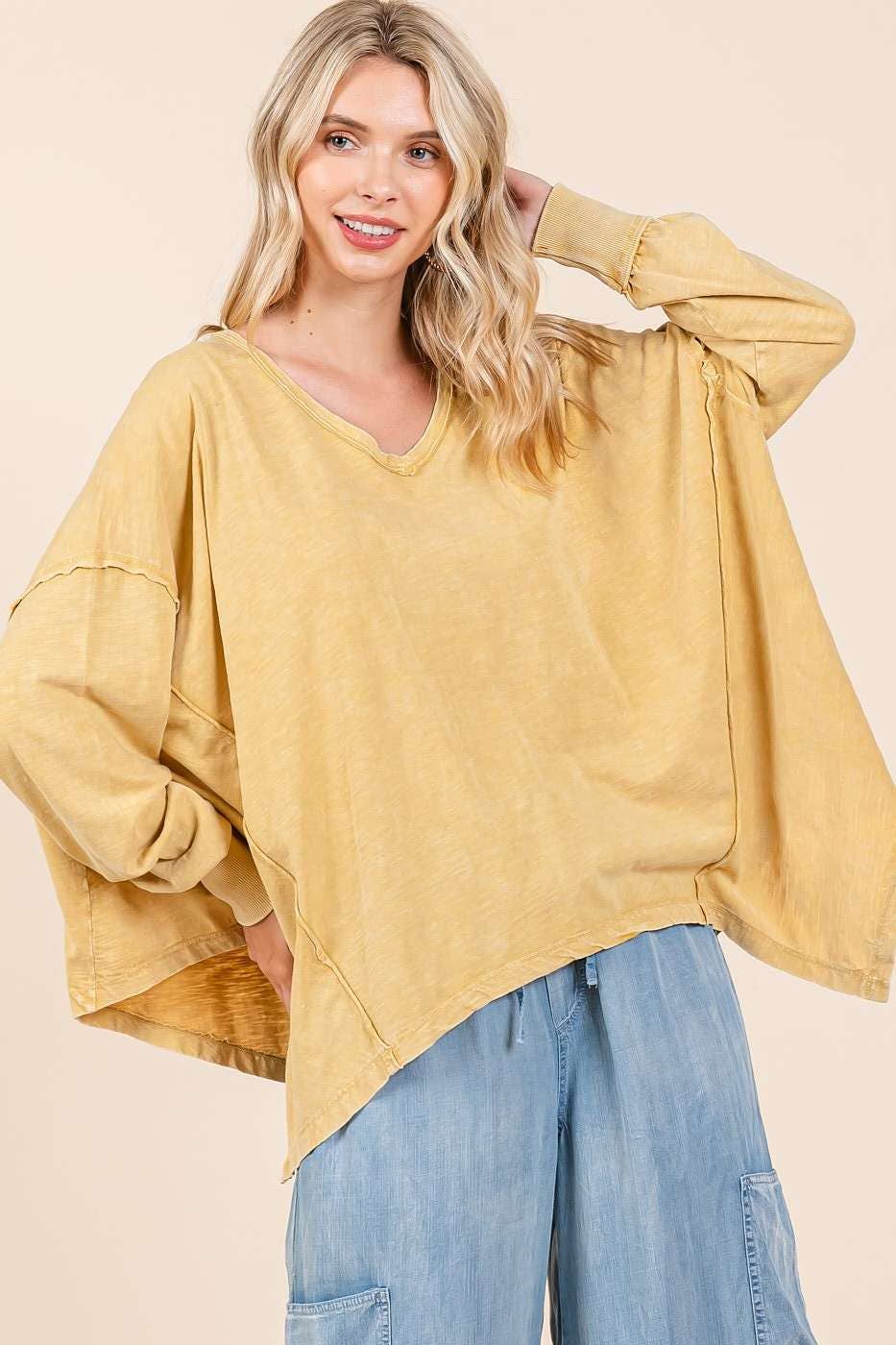 MINERAL WASH V-NECK LONG SLEEVE OVERSIZED TOP