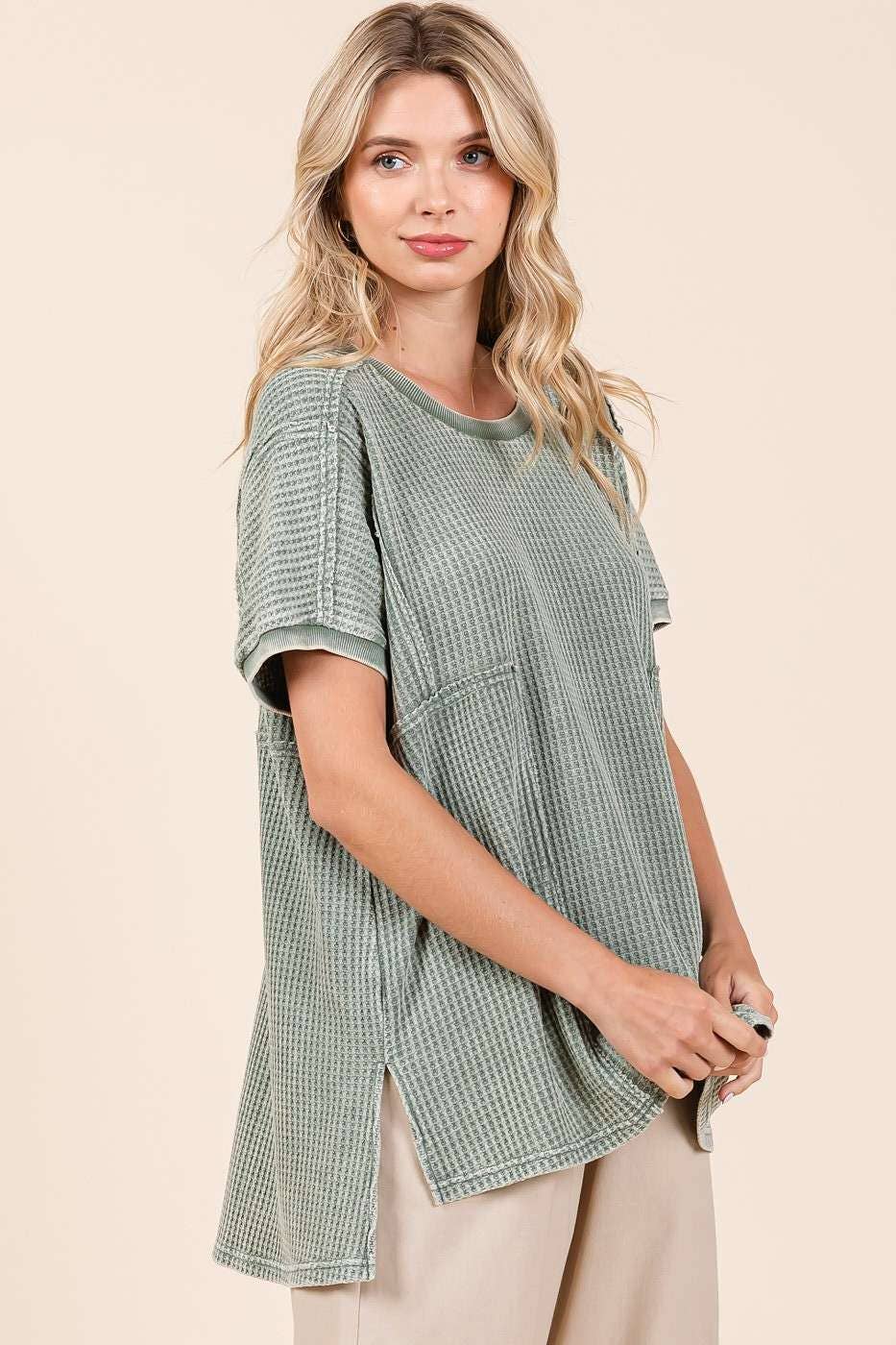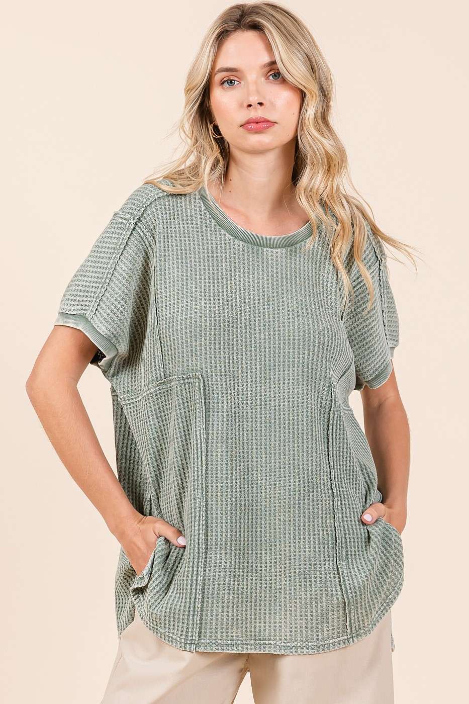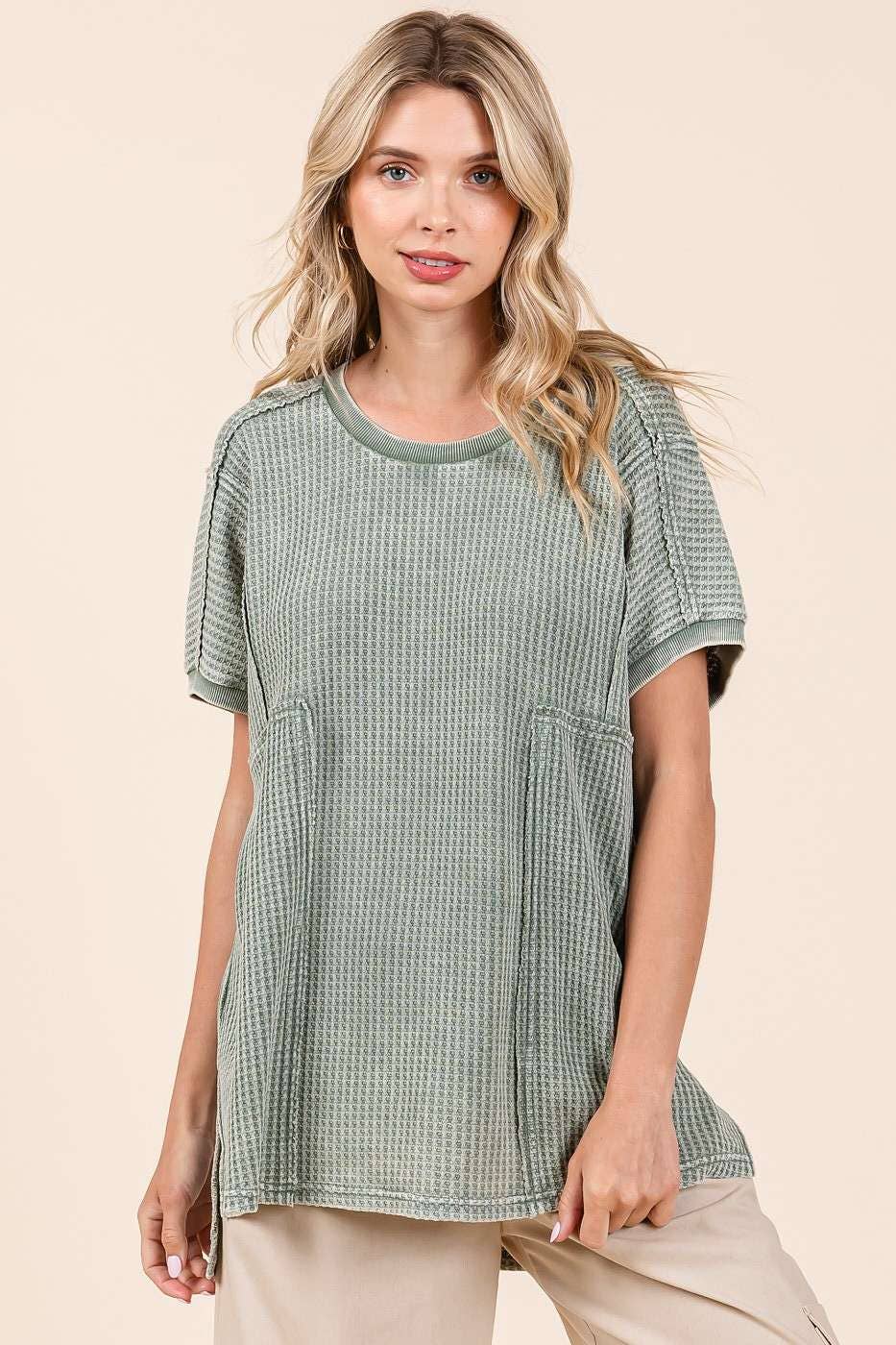 MINERAL WASH WAFFLE KNIT SEAM DETAIL TUNIC TOP