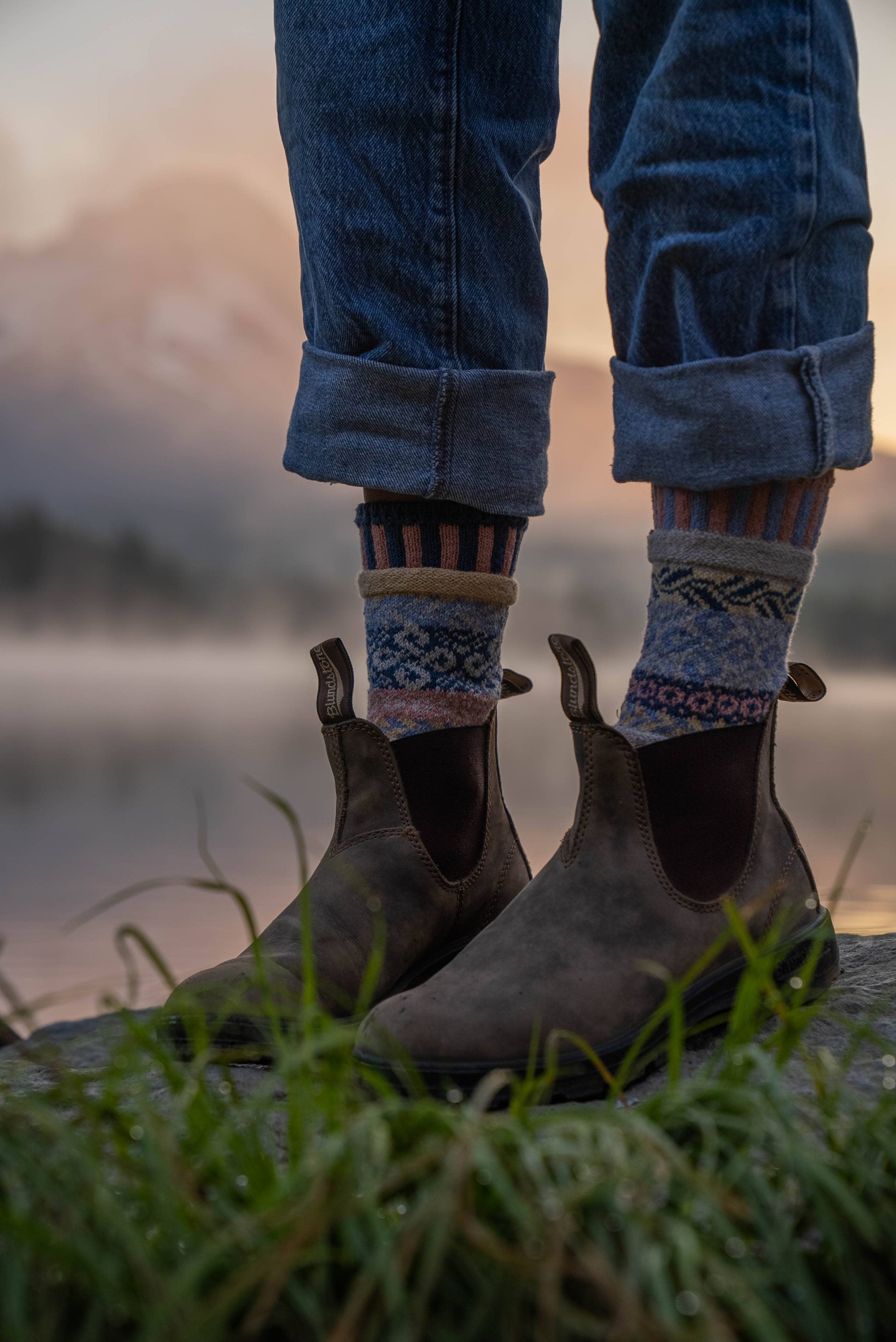 Like the appearance of a sheet of water in a desert or on a hot road, our mismatched Mirage Crew Socks embody beauty and mystique of the same kind. Knit with recycled cotton yarns, here in the USA, our socks are colorful, cozy and oh-so-stylish. Colors in this sock: blush, sky blue, denim blue, creamy yellow, linen.