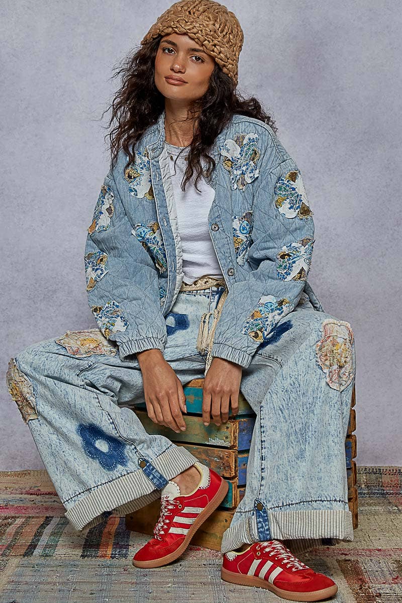 Designed in mock neck, balloon sleeve oversized fit quilted jacket in denim with floral patches.