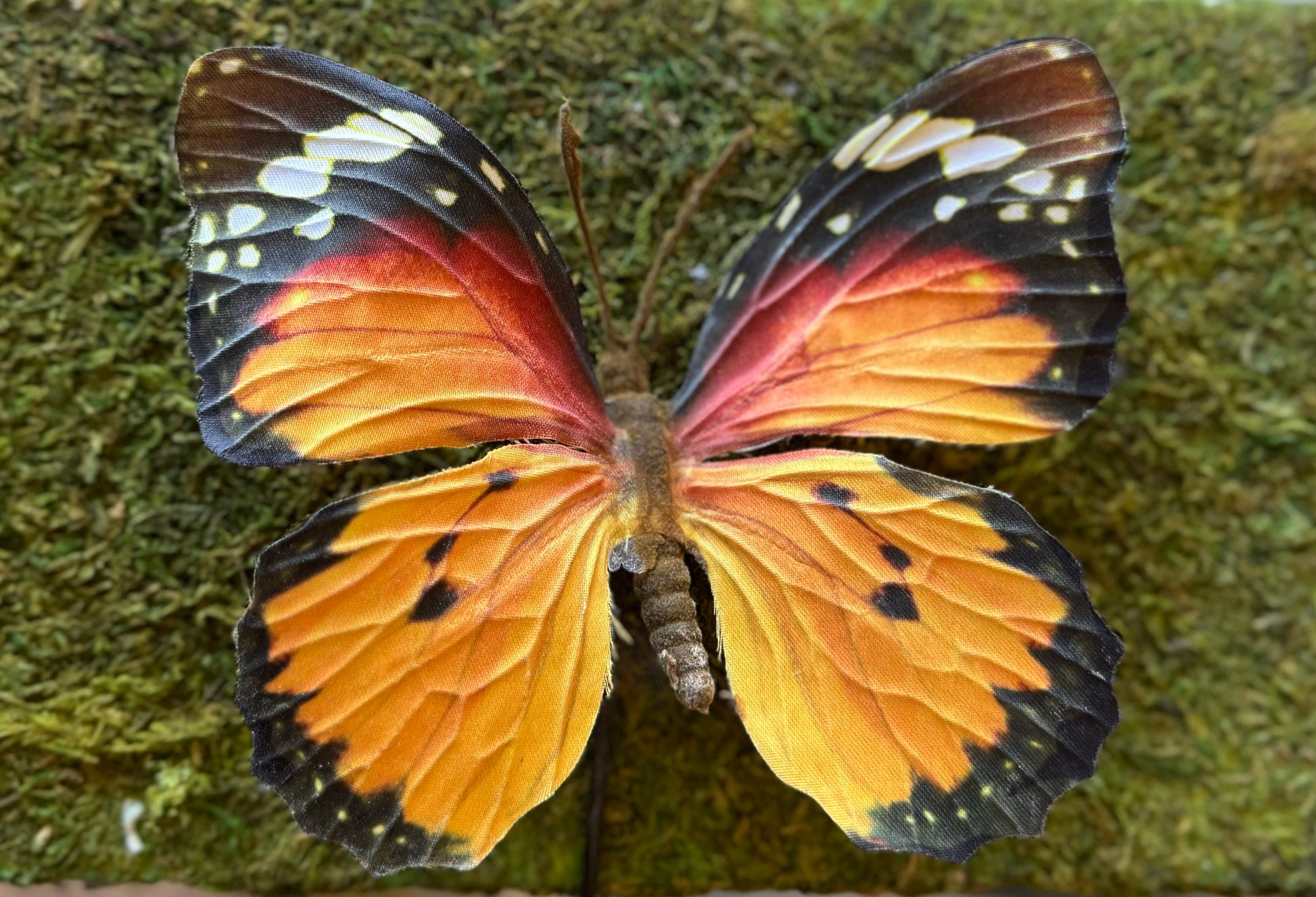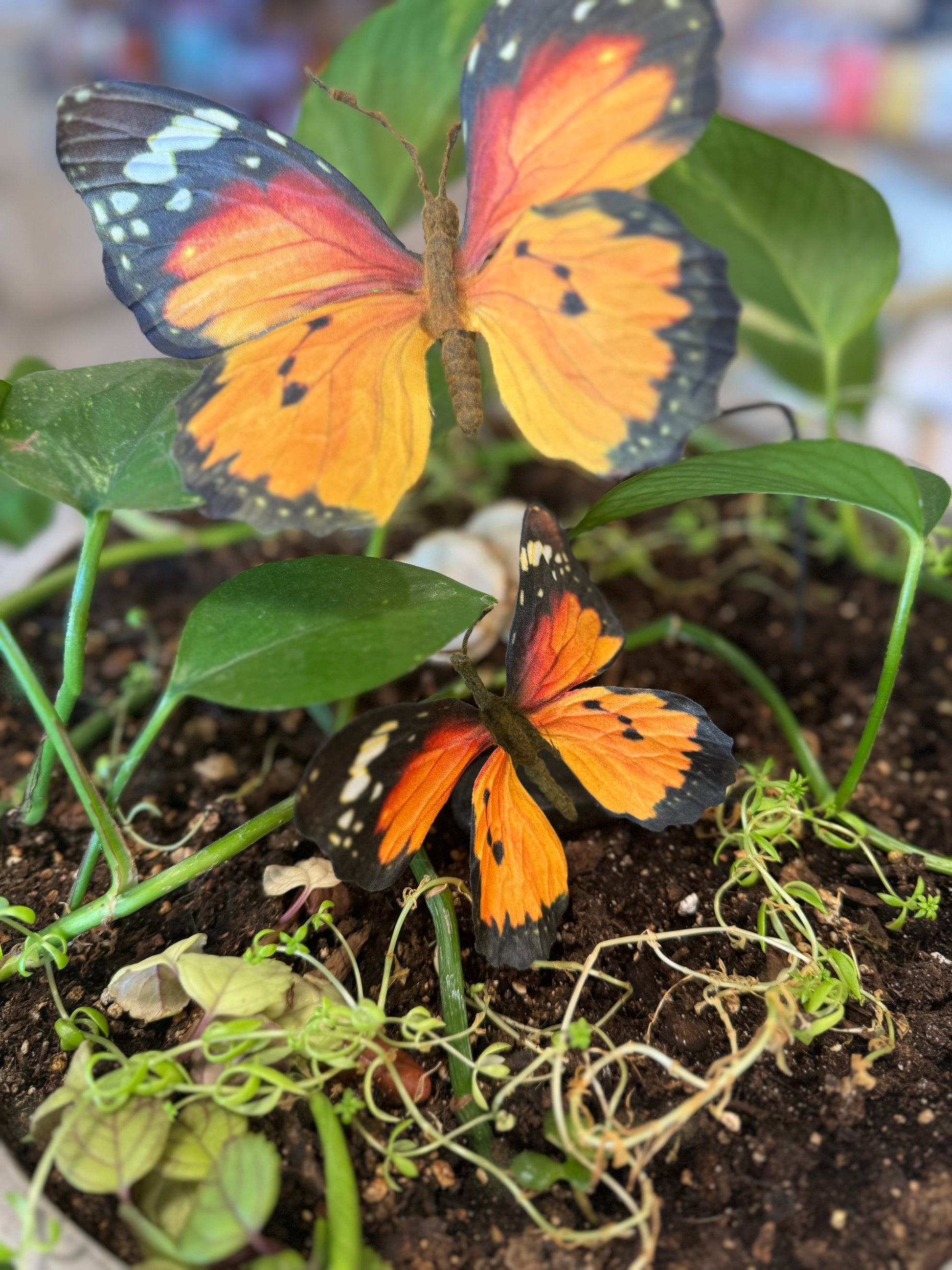 These are made of thick, textured, printed fabric, and on a wire for sticking into the soil or vase, or bending around tree limbs.