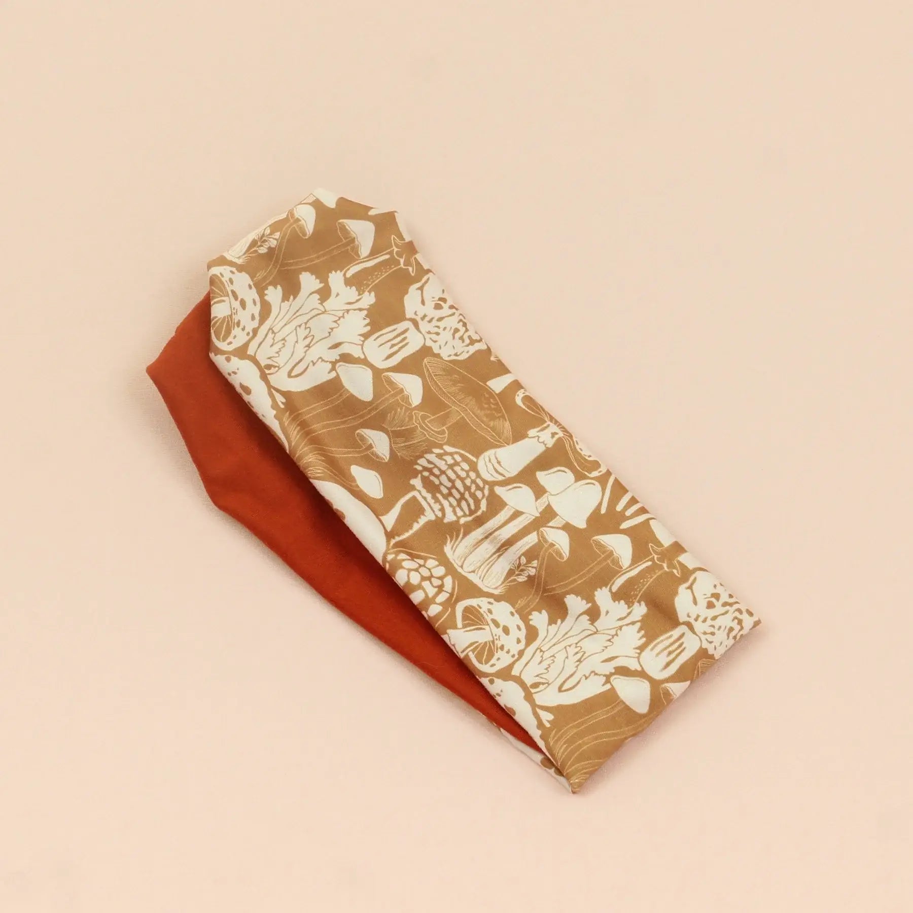 This pattern features a tan background with white mushrooms, leaves and fall elements.