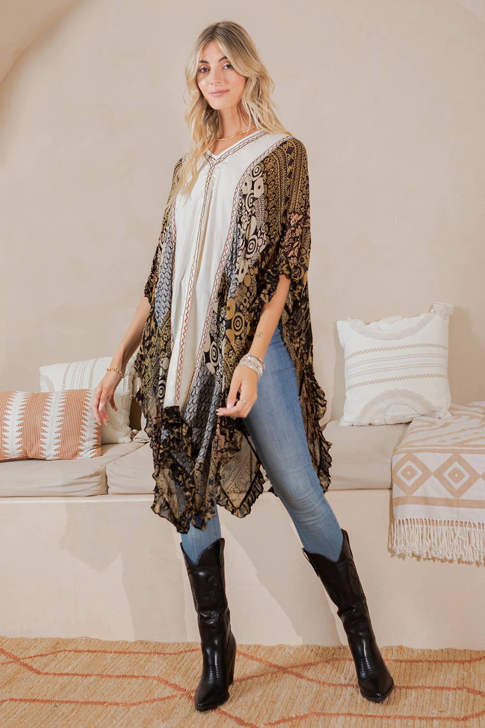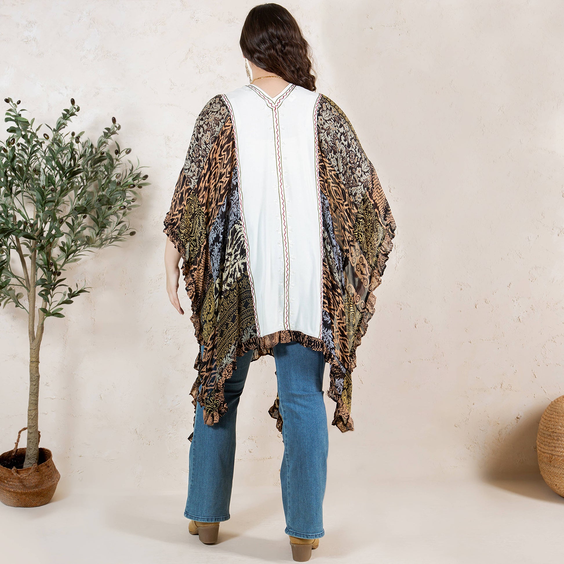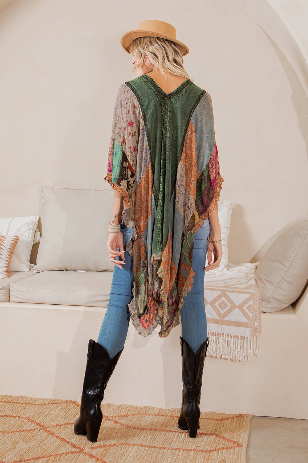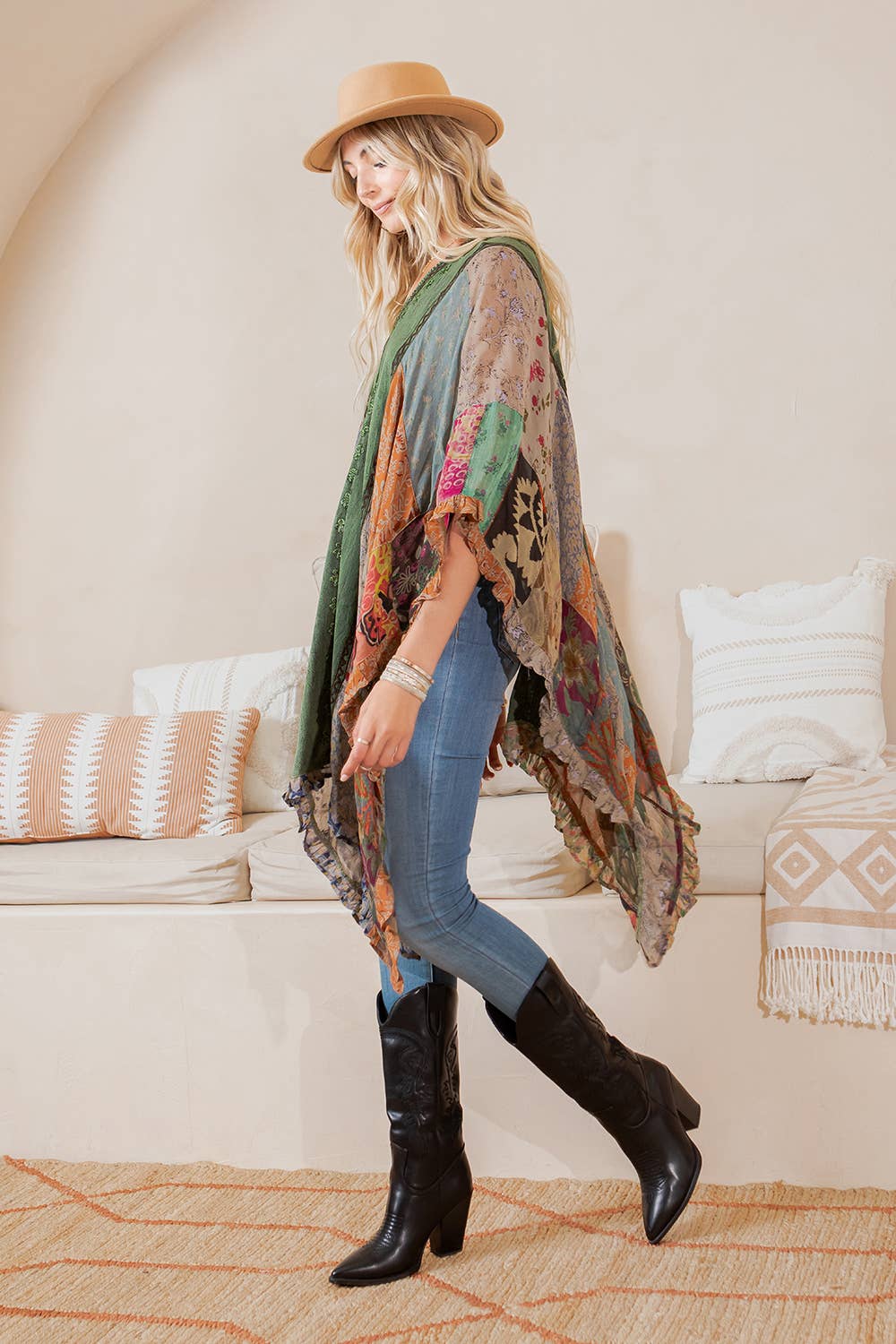 • Style: The kimono-style Long shrug blends traditional and contemporary fashion elements • Material: Made from a cotton-blended fabric, this shrug ensures durability and comfort. • Embroidery: The shrug boasts intricate patchwork details on the front and back • Design: The design includes patchwork lapels that add a bold statement to the front. • Length: The shrug is of perfect length, designed to hit just at the hip or slightly below, providing a flattering fit that complements various bodies.
