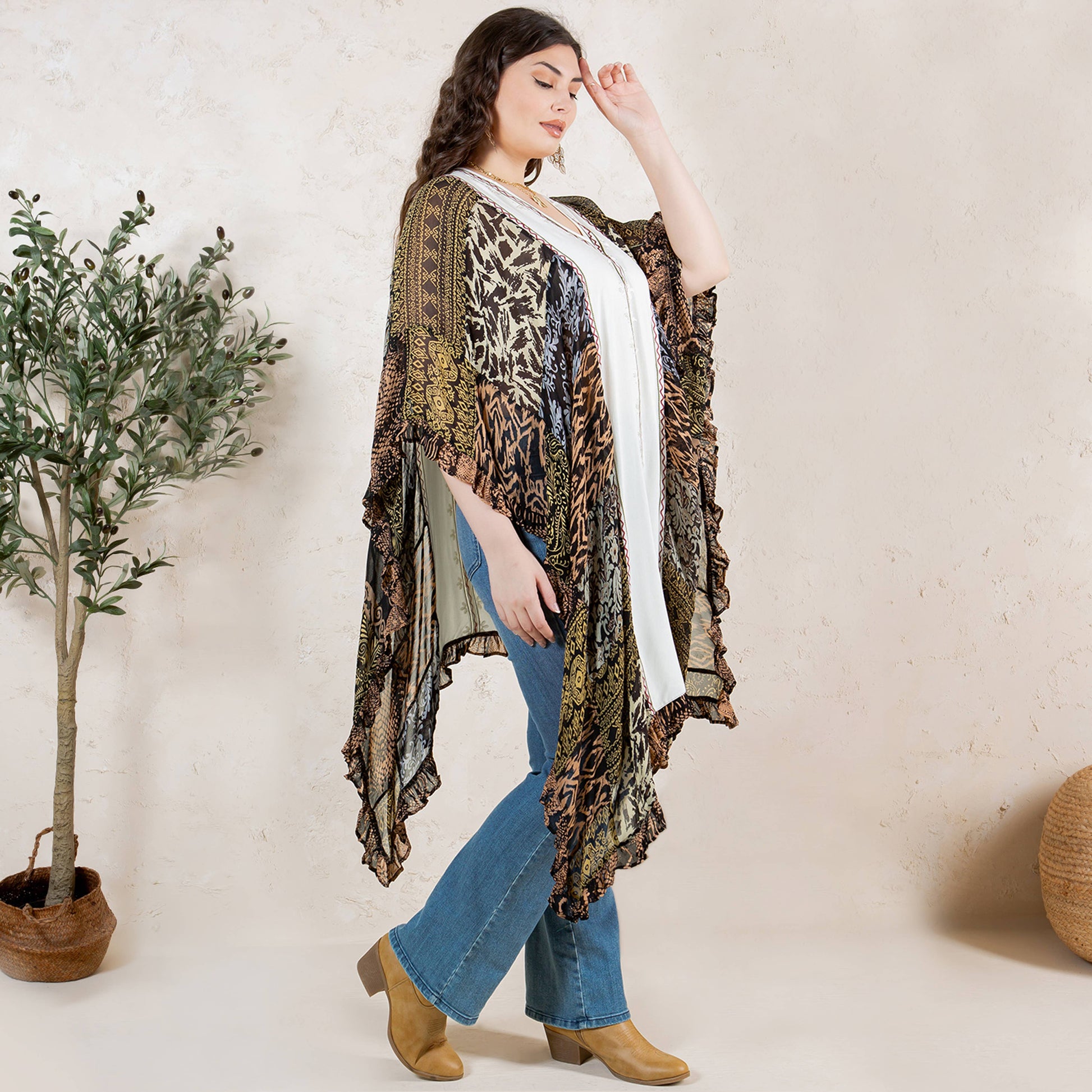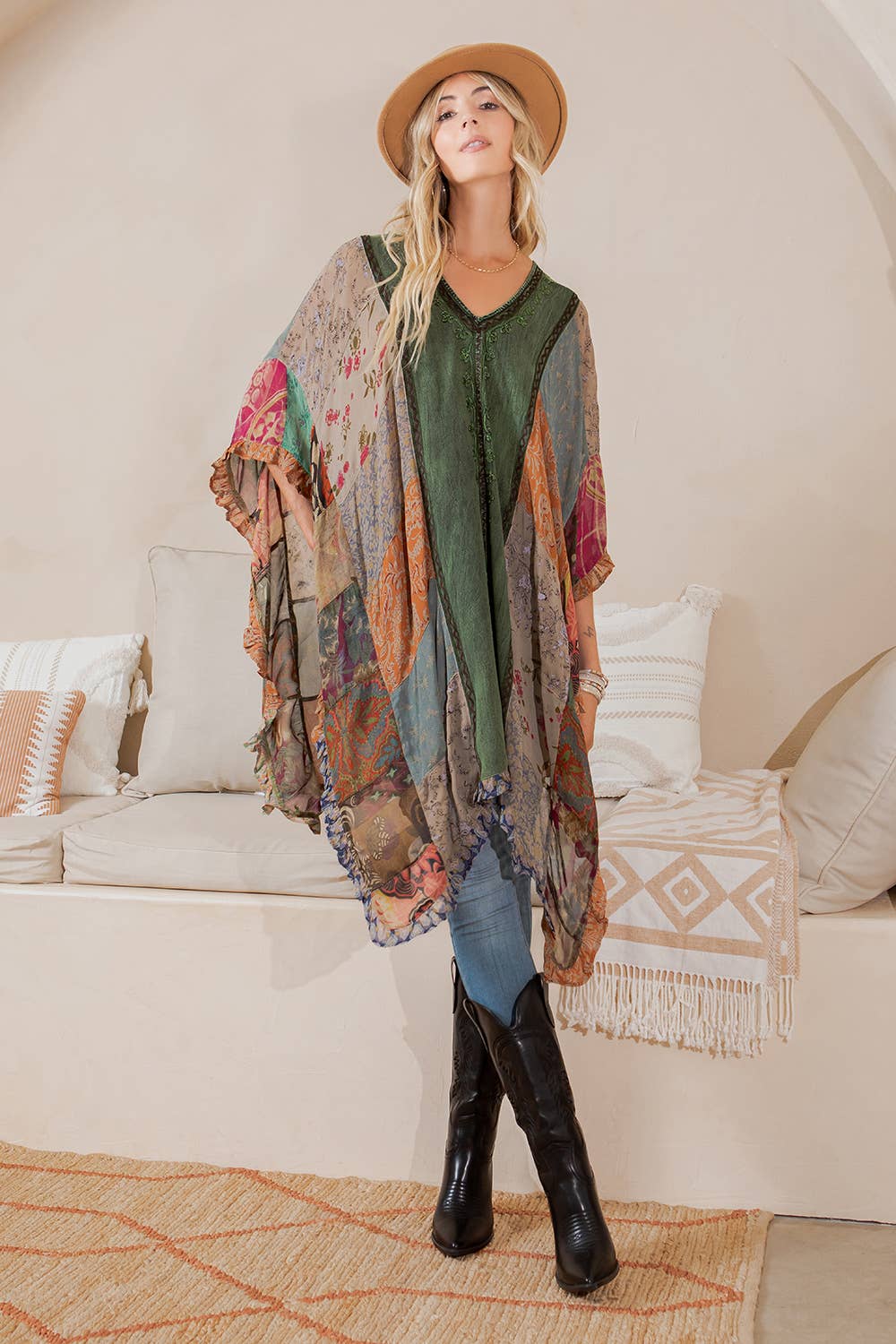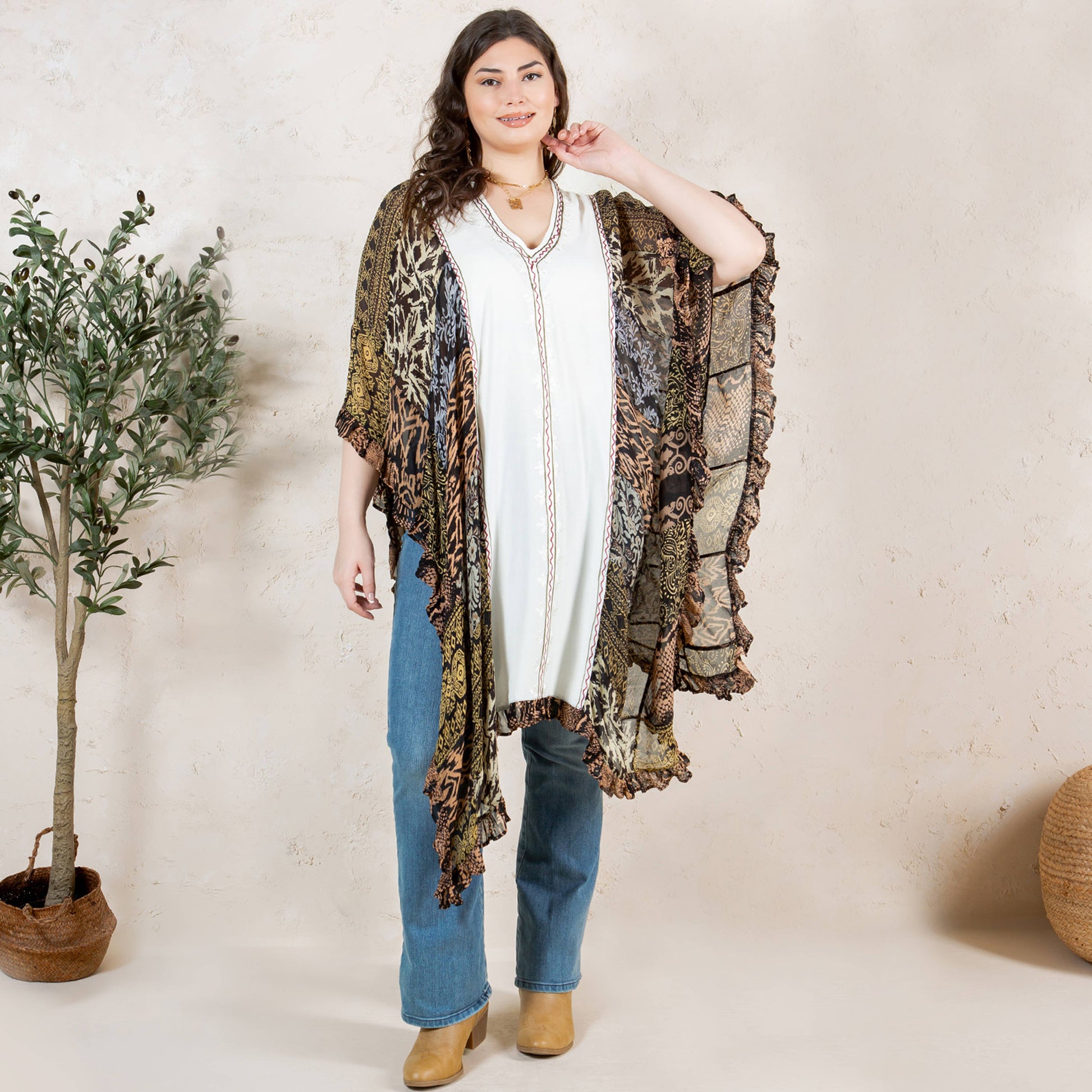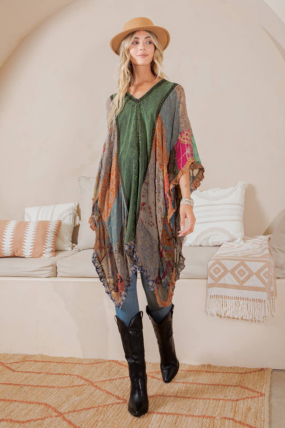 • Style: The kimono-style Long shrug blends traditional and contemporary fashion elements • Material: Made from a cotton-blended fabric, this shrug ensures durability and comfort. • Embroidery: The shrug boasts intricate patchwork details on the front and back • Design: The design includes patchwork lapels that add a bold statement to the front. • Length: The shrug is of perfect length, designed to hit just at the hip or slightly below, providing a flattering fit that complements various bodies.