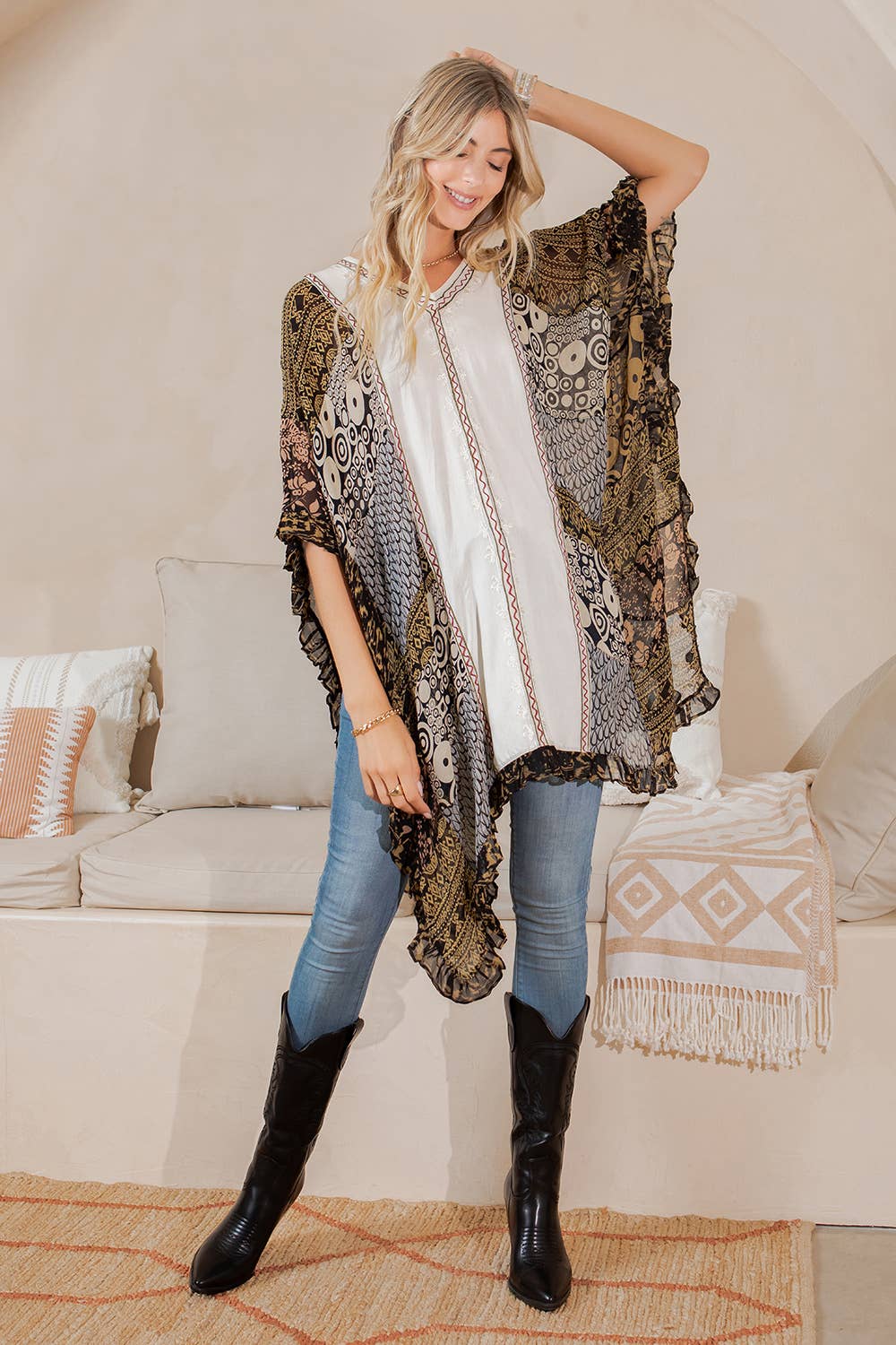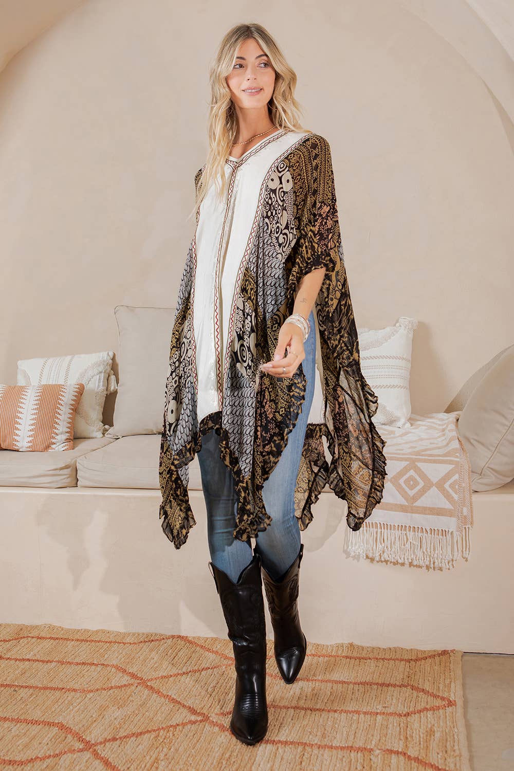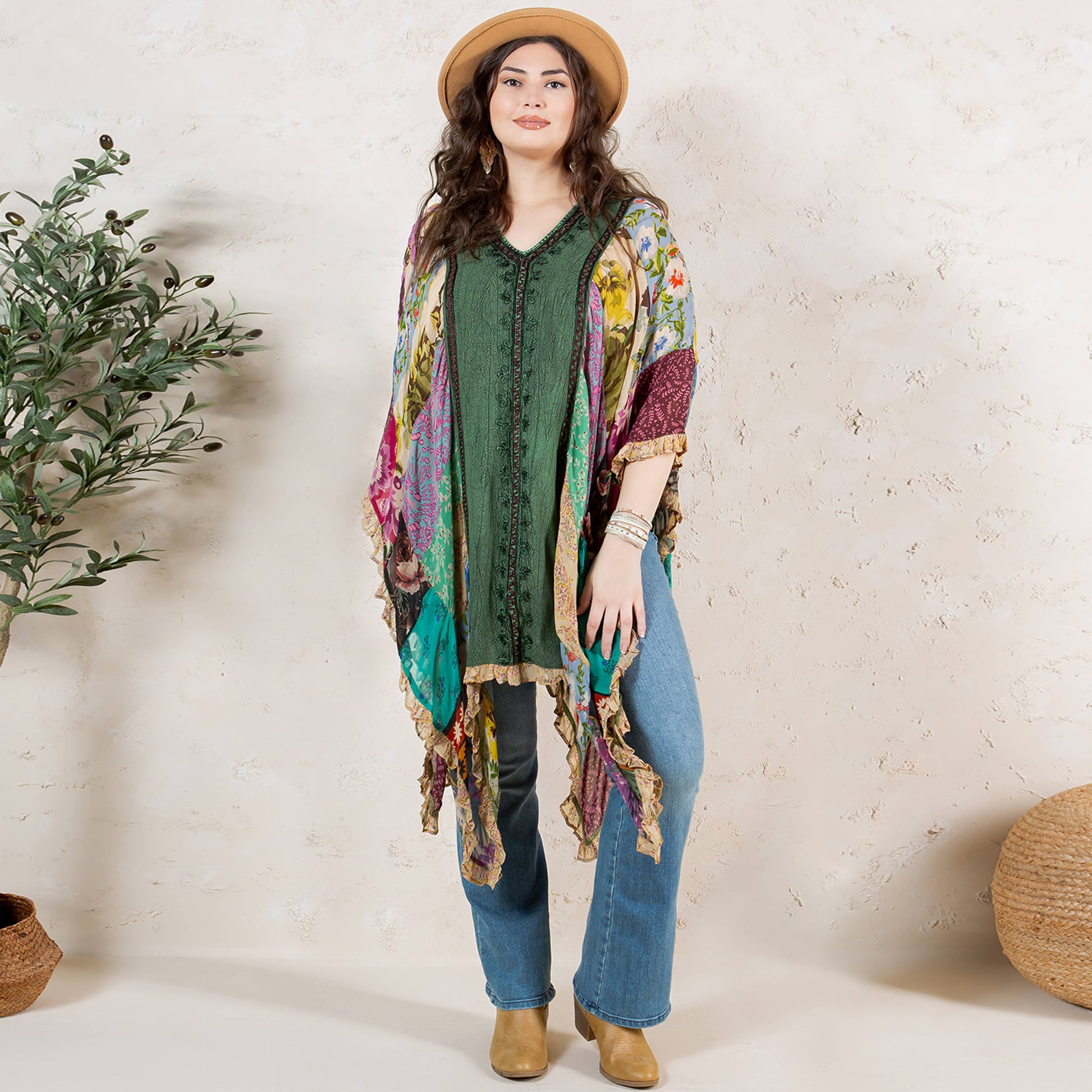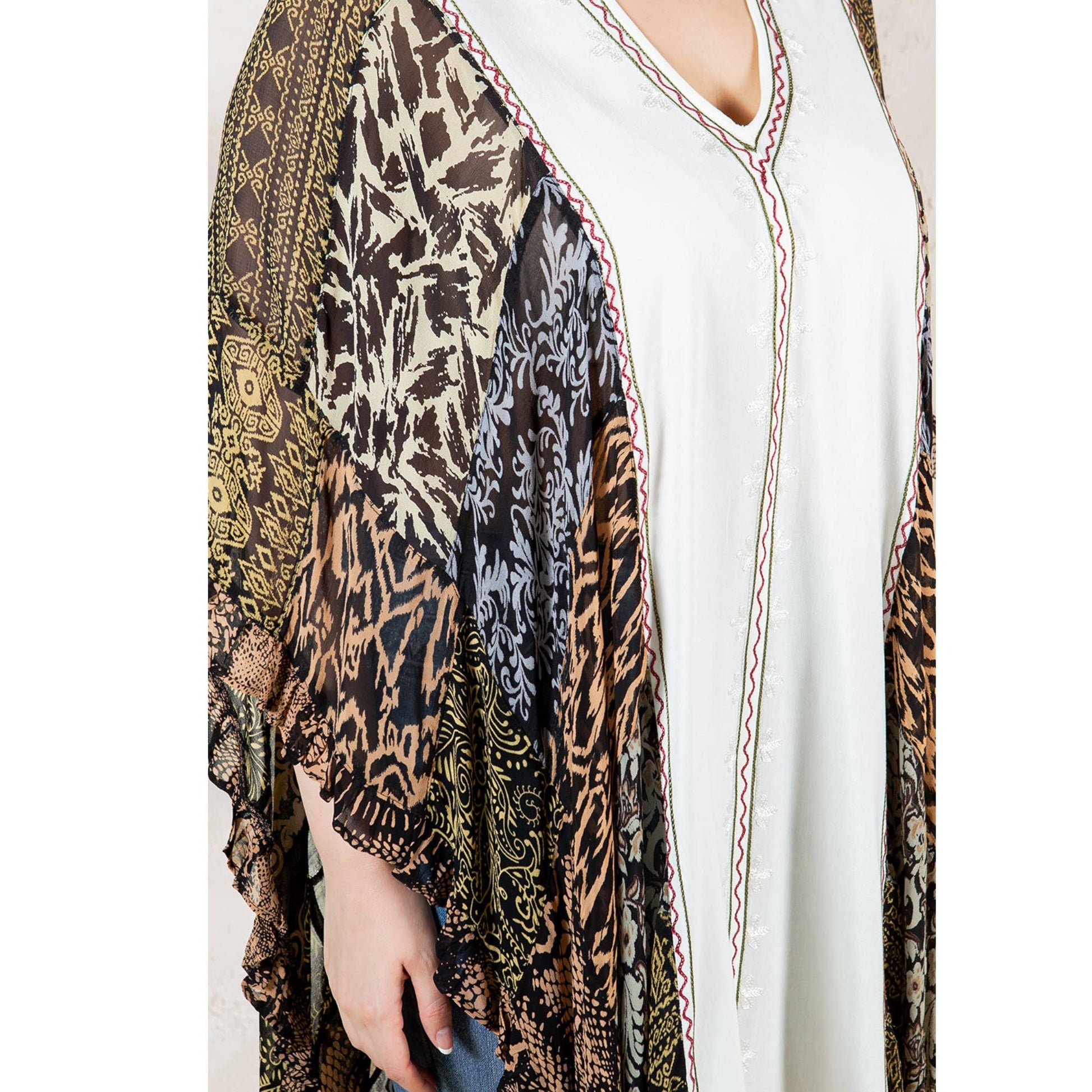 • Style: The kimono-style Long shrug blends traditional and contemporary fashion elements • Material: Made from a cotton-blended fabric, this shrug ensures durability and comfort. • Embroidery: The shrug boasts intricate patchwork details on the front and back • Design: The design includes patchwork lapels that add a bold statement to the front. • Length: The shrug is of perfect length, designed to hit just at the hip or slightly below, providing a flattering fit that complements various bodies.