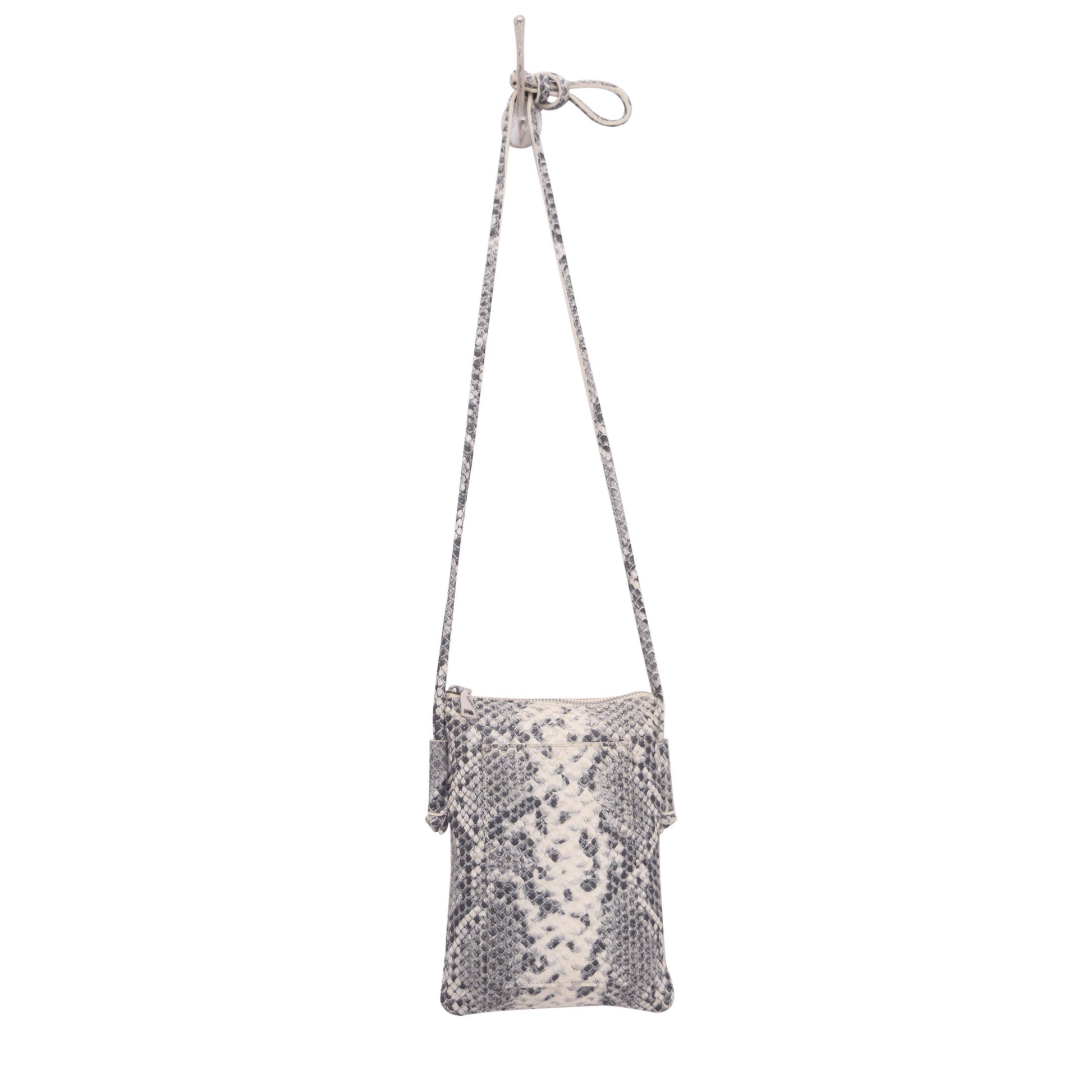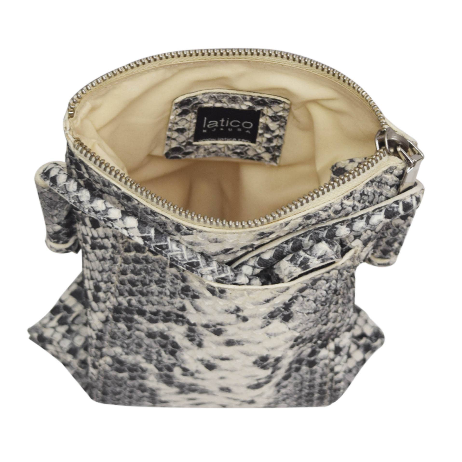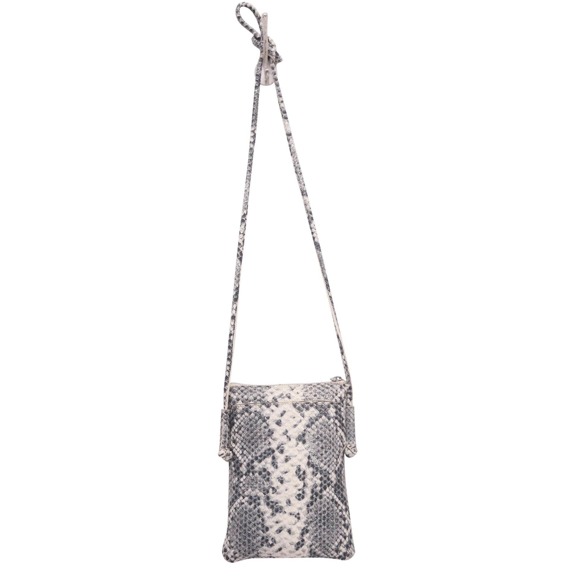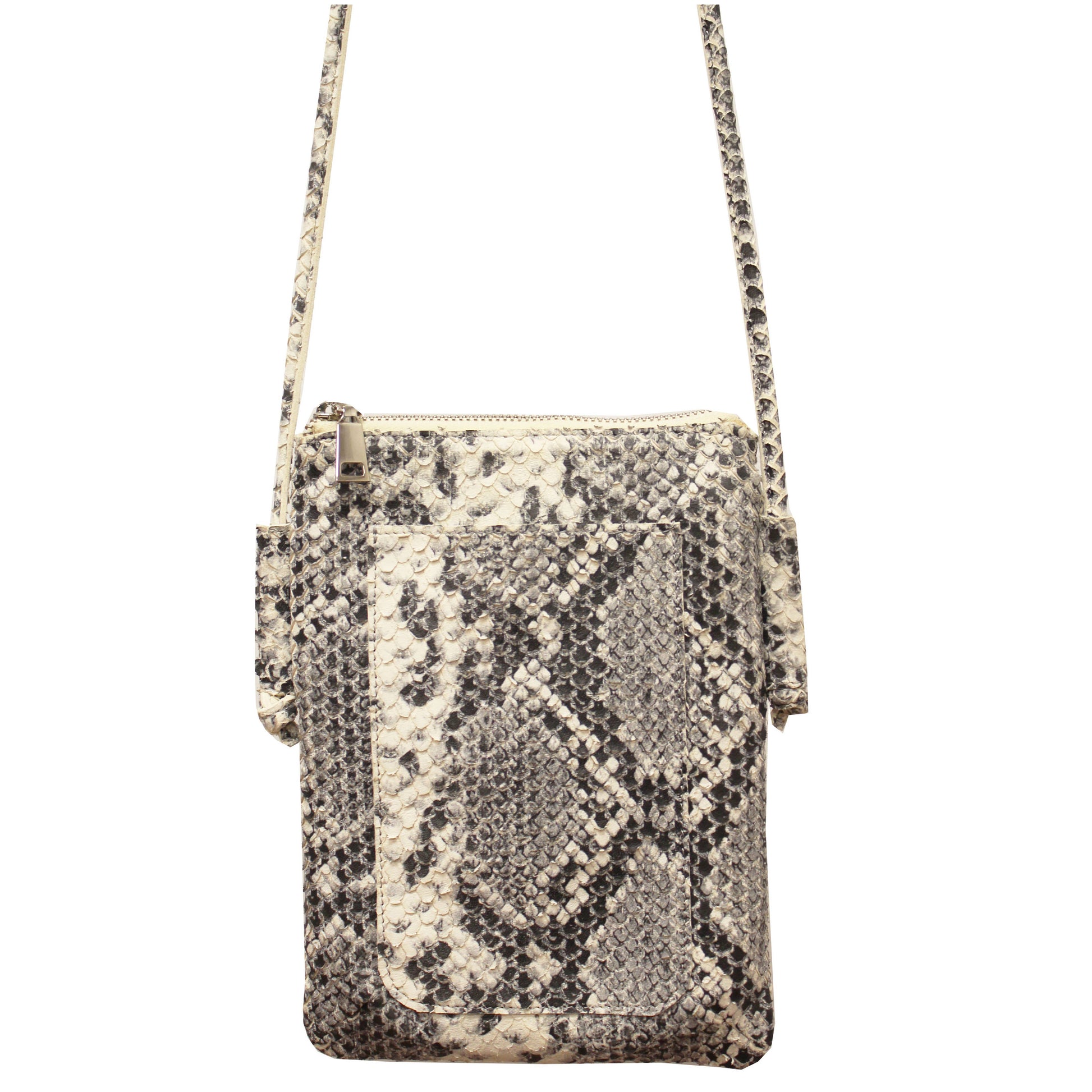 100% Leather Cross body strap 24”max: 12” min drop Top zip entry Exterior features front open slit pocket, and back magnetic snap closure slit pocket Interior features zip pocket Poly cotton lining Dimensions: 9"H x .5"D x 6.75"L