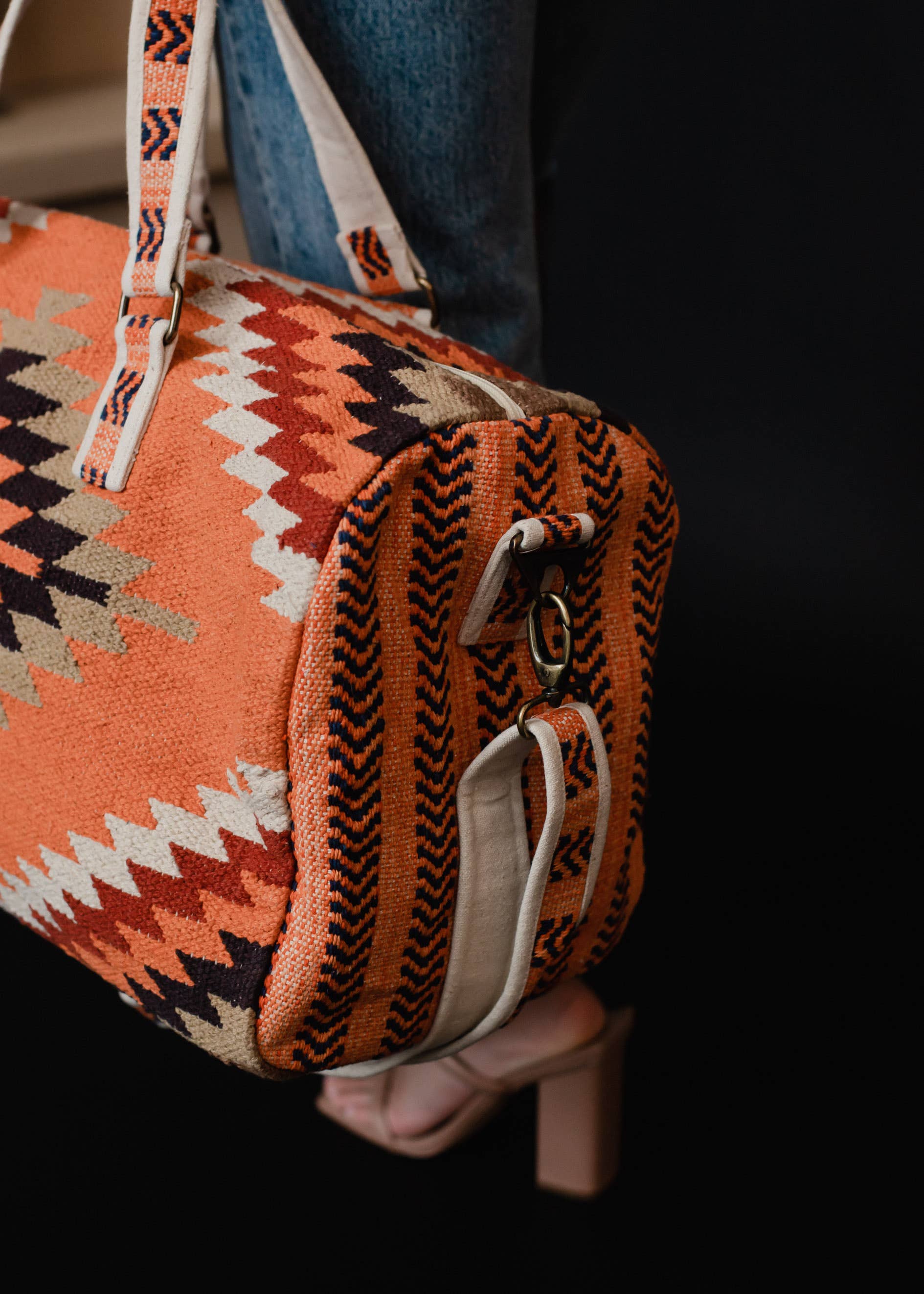 Orange, white, red, black & green Aztec duffel Zipper closure w interior zipper & 2 open pockets 19" x 9" x 11" 100% Cotton